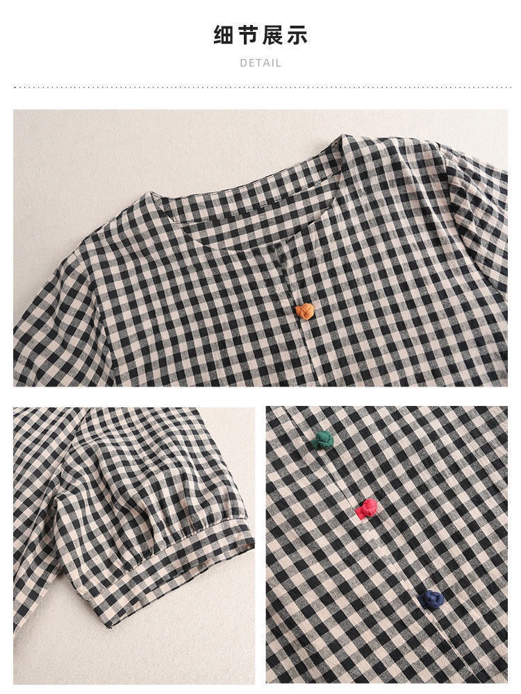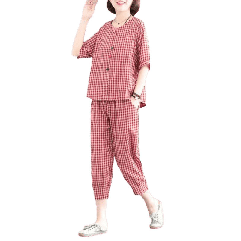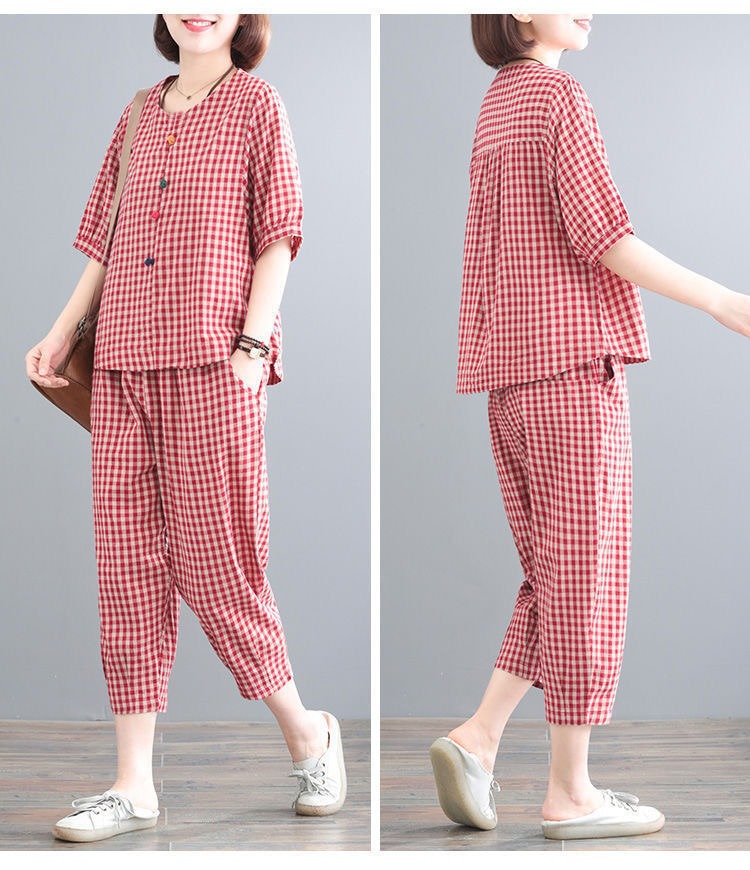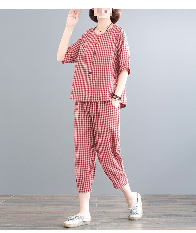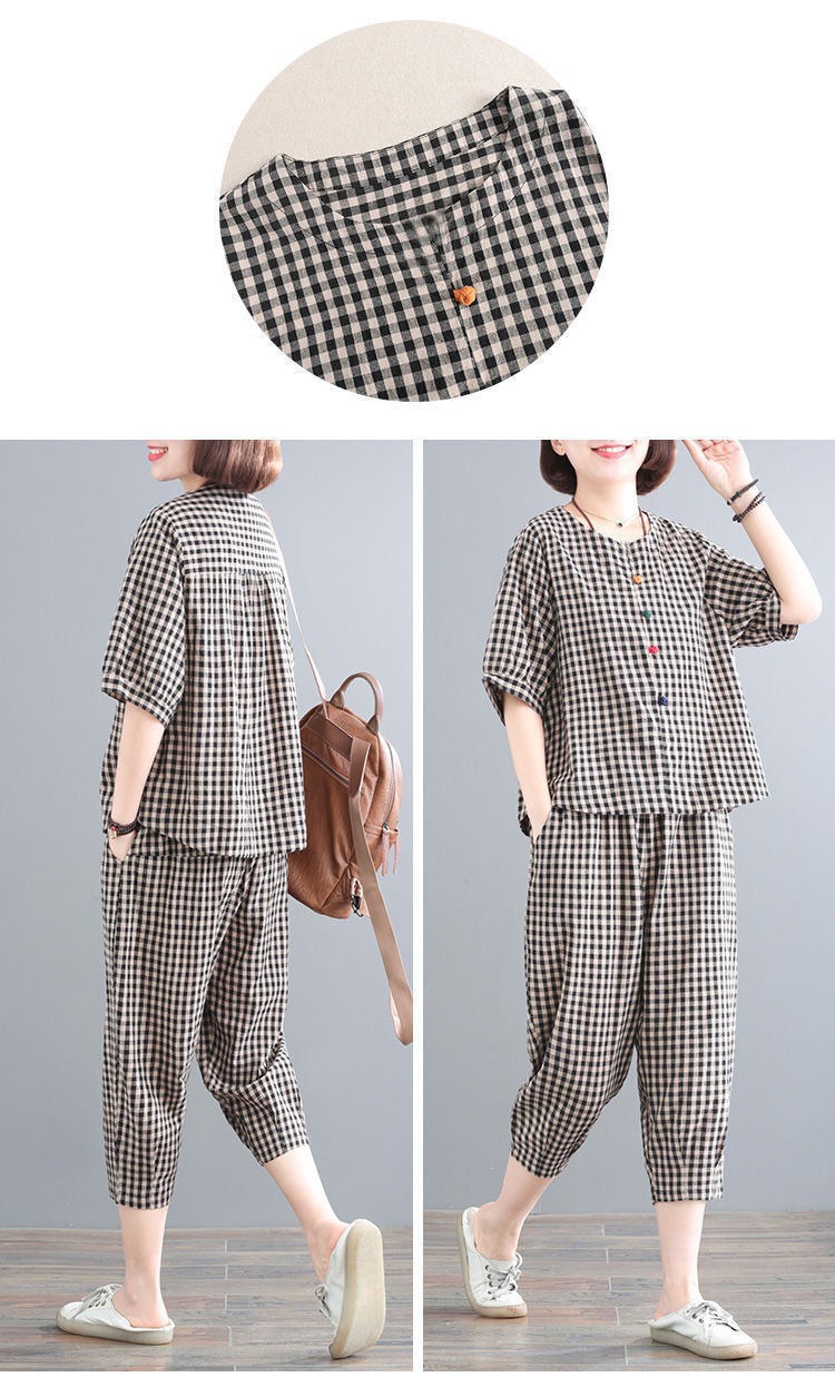 Женский хлопковый костюм-двойка больших размеров, лето 2025, в стиле литературного ретро, повседневный топ и брюки 7/8 в клетку, модный