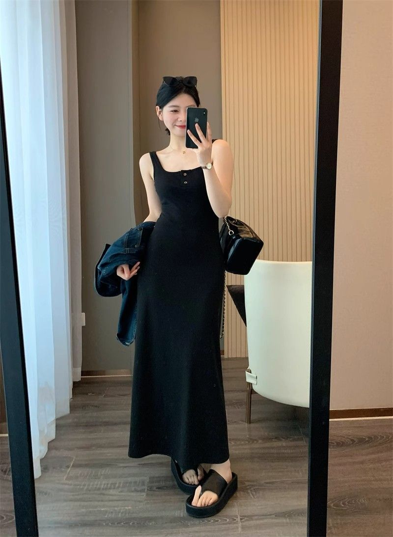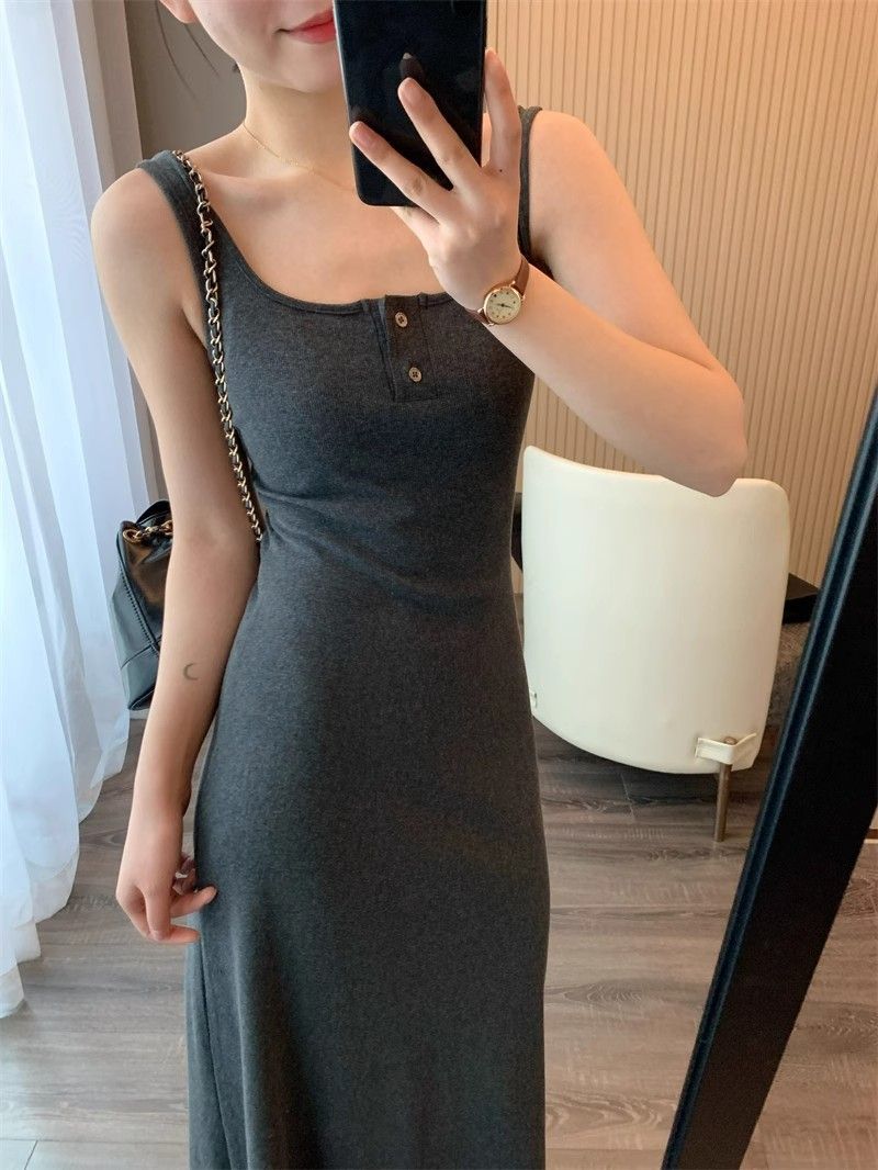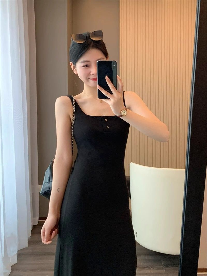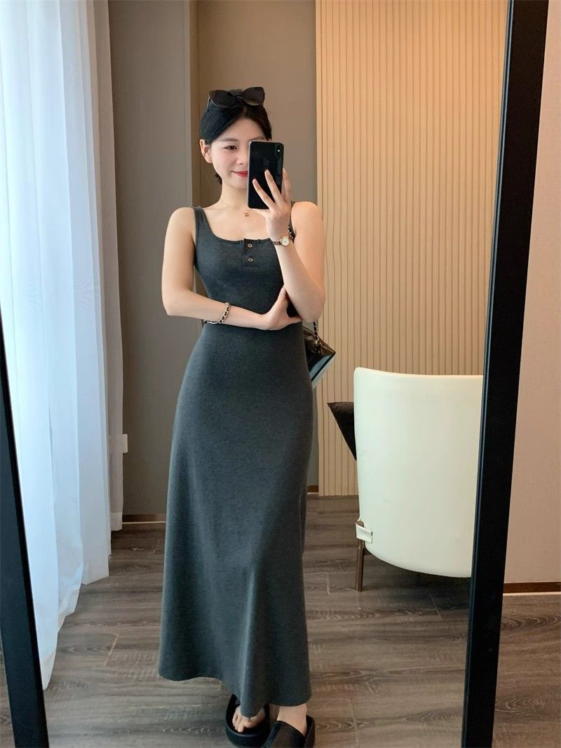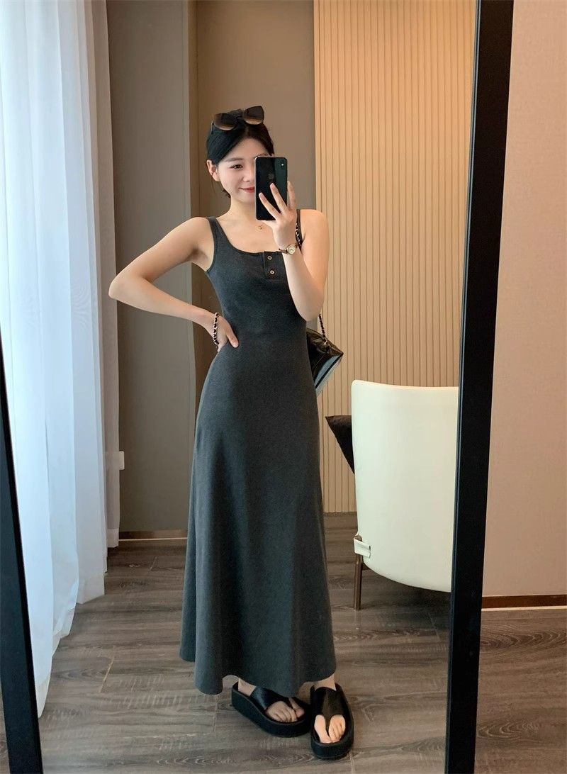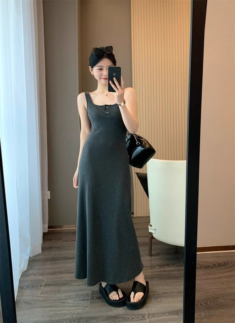 Женское платье-камзол с квадратным вырезом, длинная юбка, летний новый стиль 2025, стройнящее и элегантное