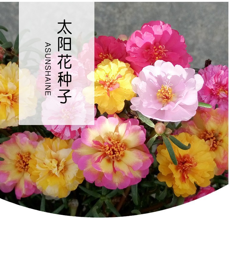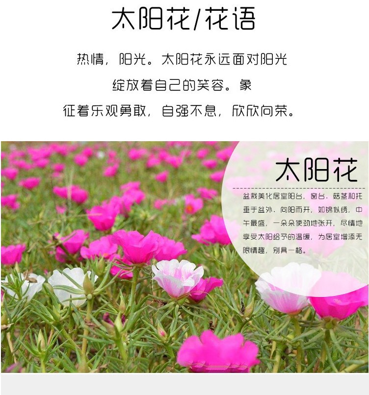 太阳花、又名半枝莲 松叶牡丹、大花马齿苋、死不了等,植株矮壮,株形丛密美观,花色丰富鲜艳,花期较长,适应性和生长势均强。适宜盆栽美化阳台,亦可作庭院装饰或花坛、花带、花境配置。