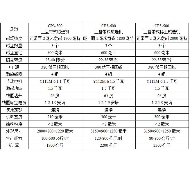 三盘带式磁选机分CP-500,CP-600两种机型,适用于干选钛矿、稀土矿、钨矿、锡矿、铬铁矿、铌钽矿、褐铁矿、稀土矿、锆英、金红、独居、红柱石,兰晶石、长石、石英等各种有磁性差异的金属矿物和非金属矿物的除铁和分选提纯。