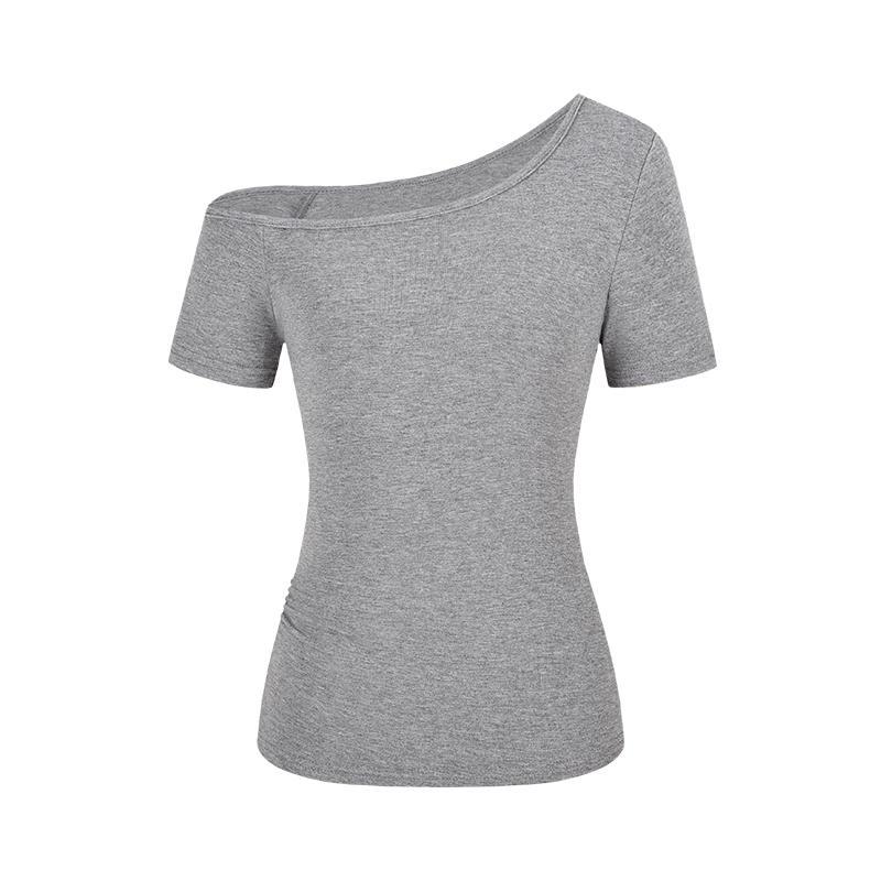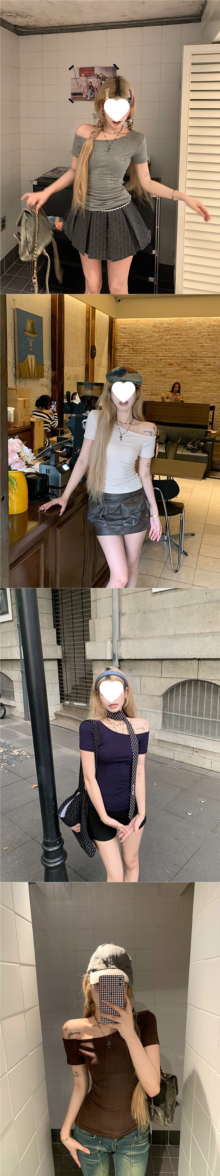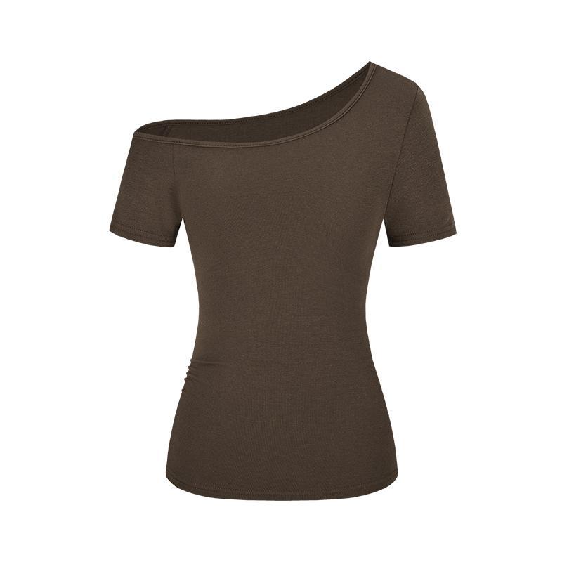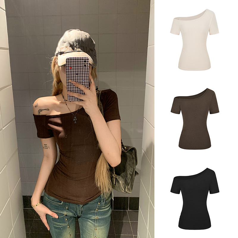 Pure Desire Женская рубашка с косыми плечами и открытым ключицей с короткими рукавами, облегающий универсальный топ