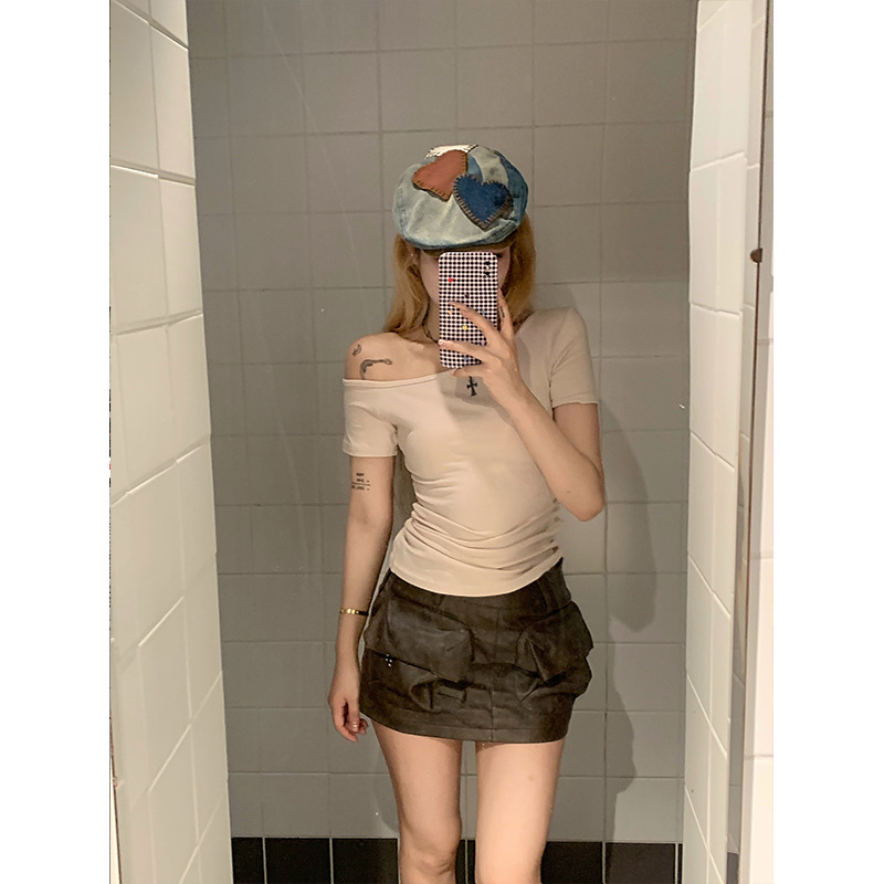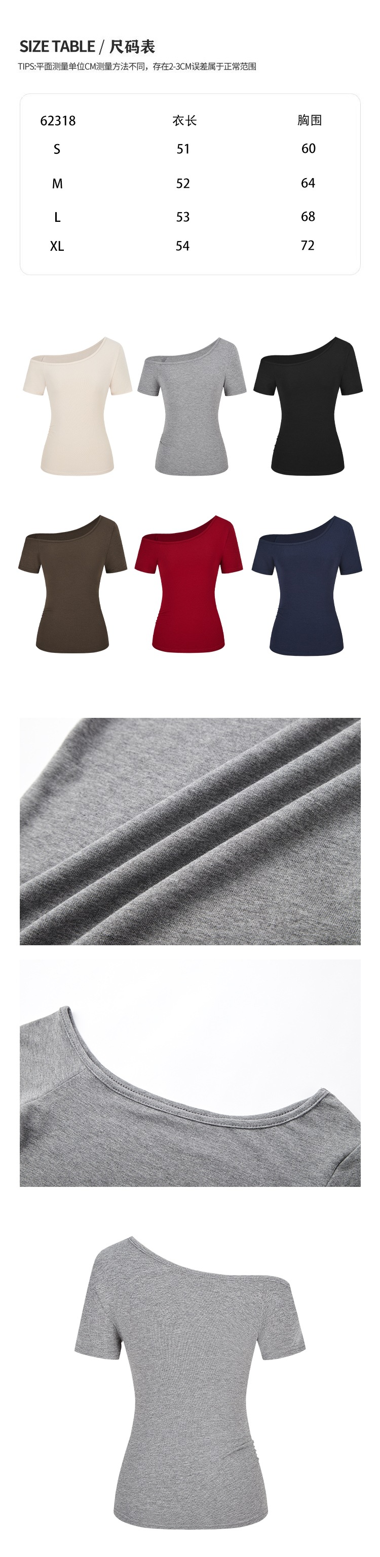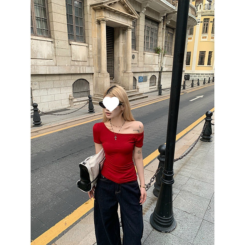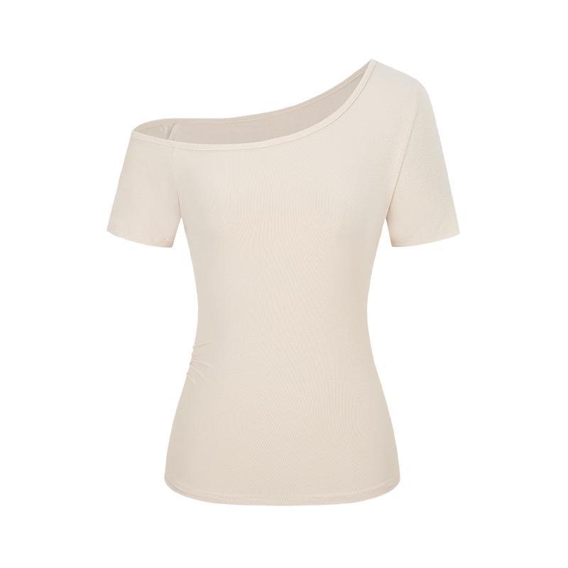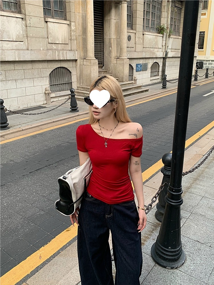 Pure Desire Женская рубашка с косыми плечами и открытым ключицей с короткими рукавами, облегающий универсальный топ