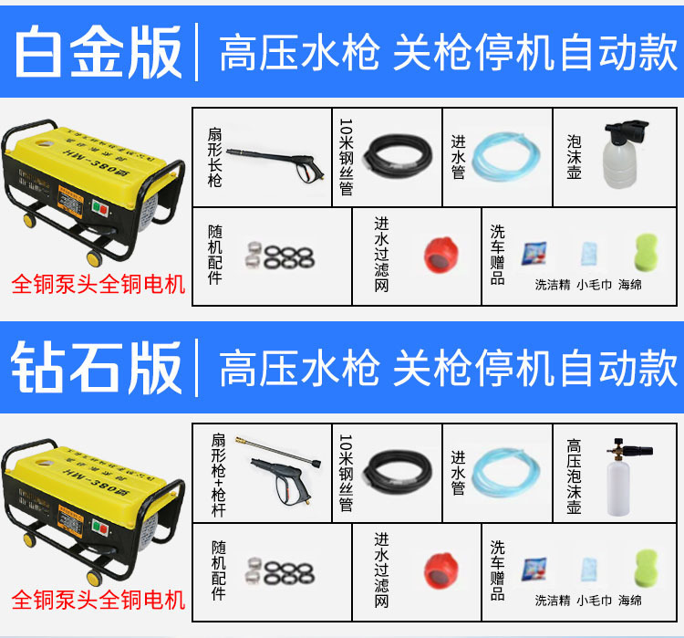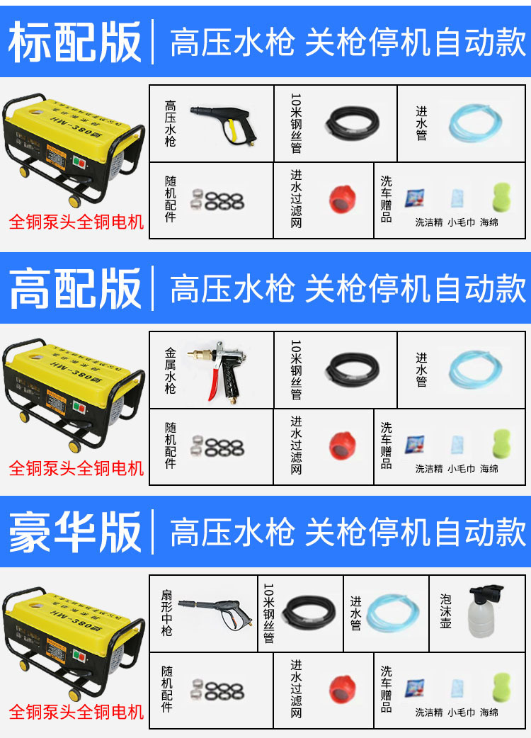 Стандартная версия водяного пистолета высокого давления + 10m стальная проволочная труба; Металлический пистолет высокого класса + 10m стальная проволочная труба; Высококачественная версия отключения пистолета + 10 труб из стальной проволоки + металлический пистолет; Версия Deluxe в форме веера + 10m стальная проволочная трубка; Вентиляторная пушка алмазной версии + стержень + 10m трубки + пенопластовый горшок; Алмазный пистолет с отключением, веерообразный стержень пистолета, 10m трубка, пенопластовый горшок; Стандартная версия медного водяного пистолета высокого давления + 10m стальная проволочная труба; Высококачественная версия медного металлического пистолета + 10m стальных трубок; Высококачественное отключение медного пистолета + 10 труб из стальной проволоки + металлический пистолет; Медный веерообразный выстрел в роскошной версии + 10m трубка из стальной проволоки; Медный вентиляторный пистолет с алмазной версией + стержень + 10m трубки + пенопластовый горшок; Алмазный медный пистолет для отключения веерообразного стержня пистолета 10m пенопластовый горшок; Голый металл (двигатель с алюминиевой проволокой); Голый металл (двигатель с медной проволокой)