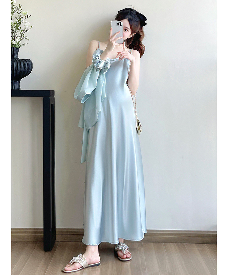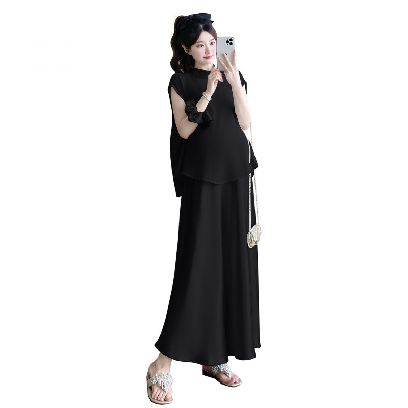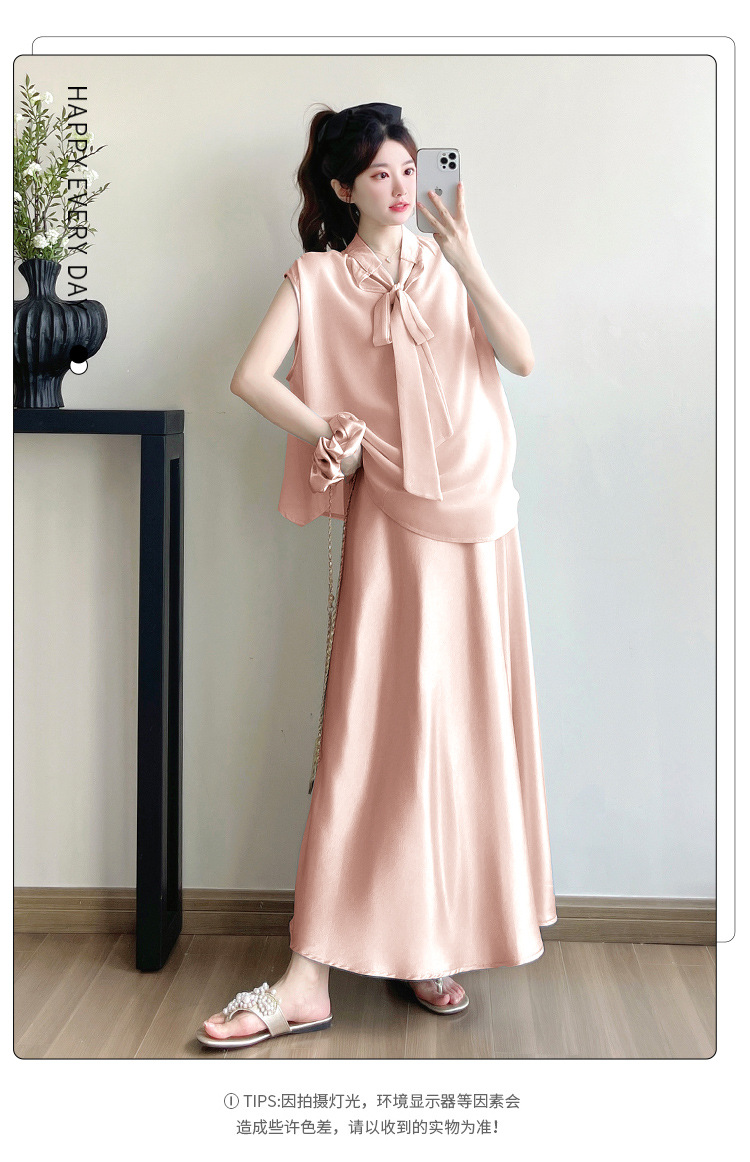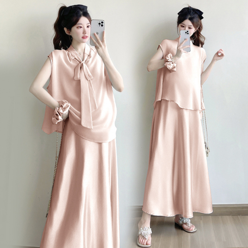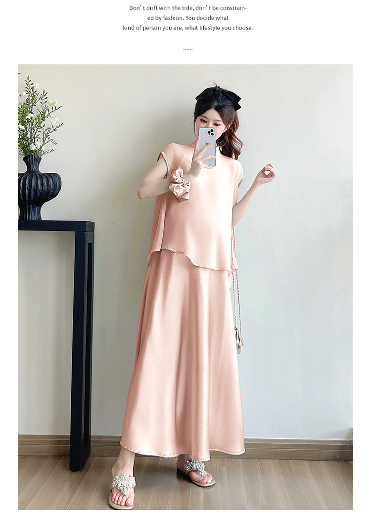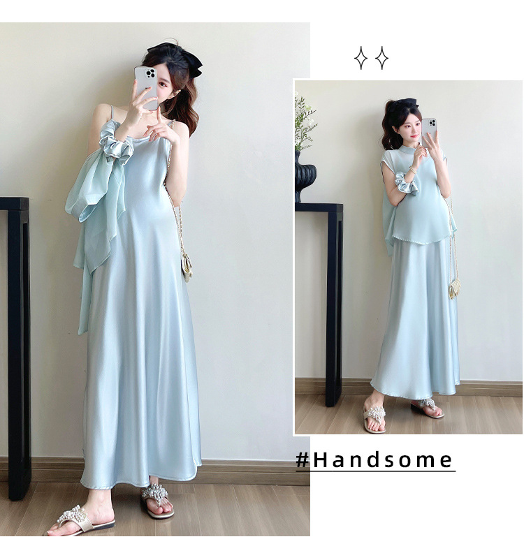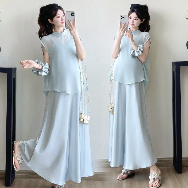 Платья для беременных, летние платья для беременных, продвинутые чувства, носить атласный ацетат топ, подтяжки, темперамент, пригородной поездки, набор из двух частей