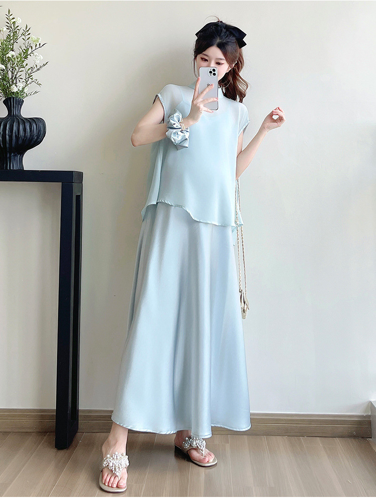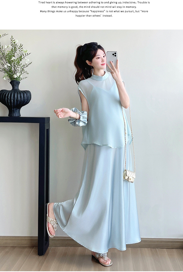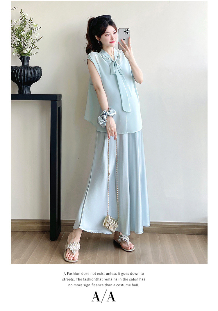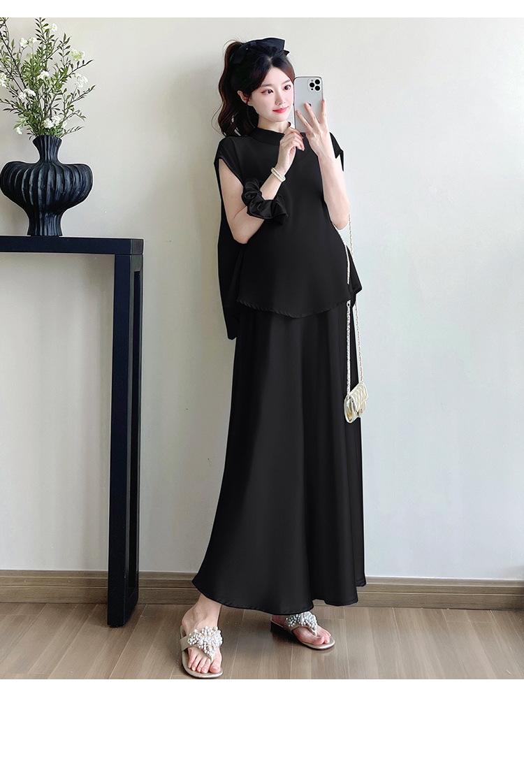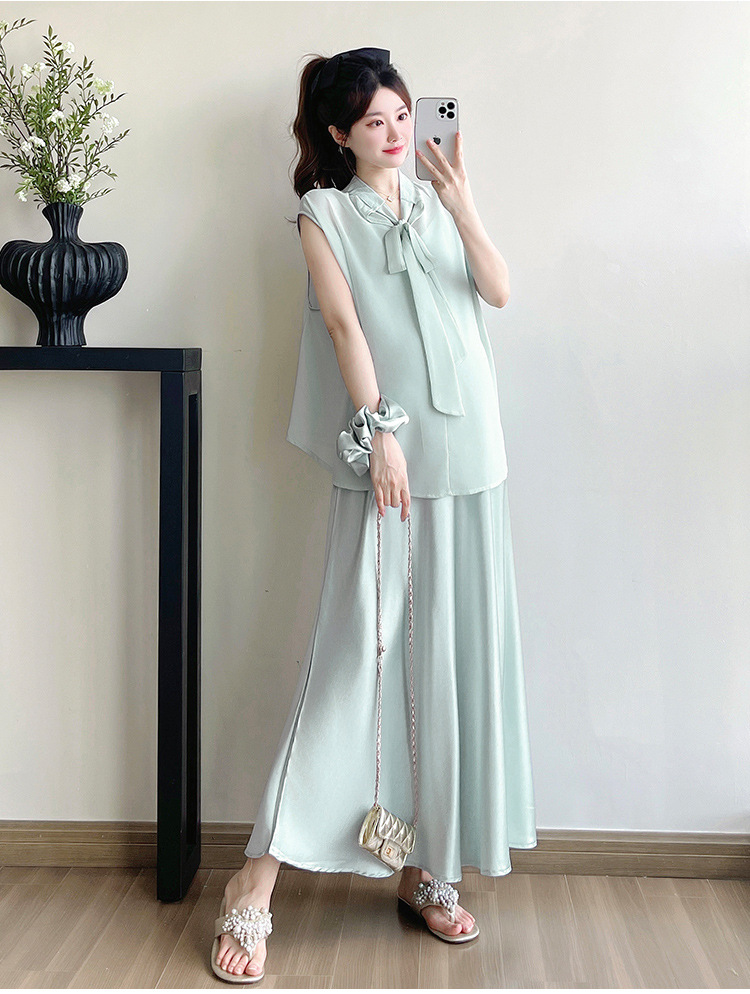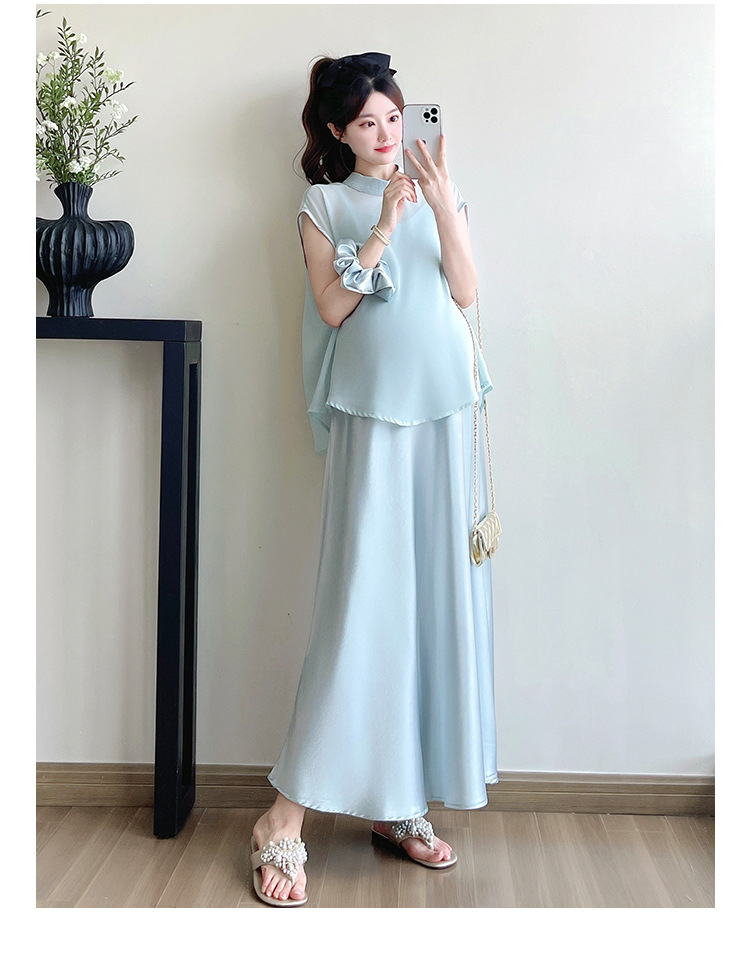 Платья для беременных, летние платья для беременных, продвинутые чувства, носить атласный ацетат топ, подтяжки, темперамент, пригородной поездки, набор из двух частей