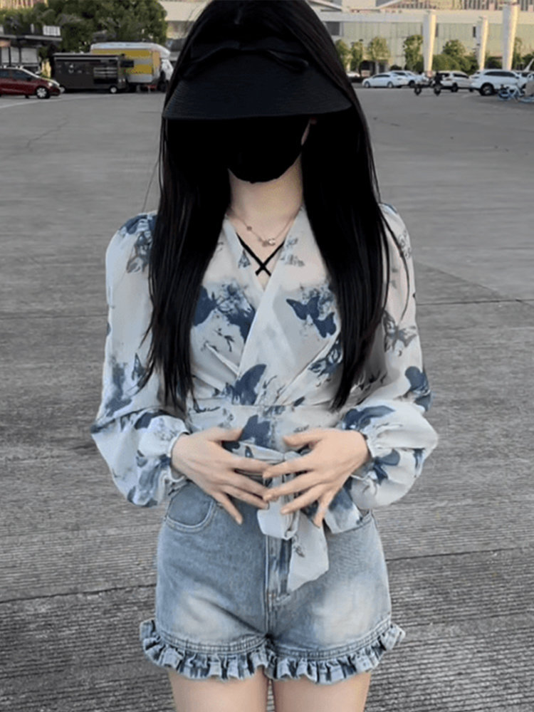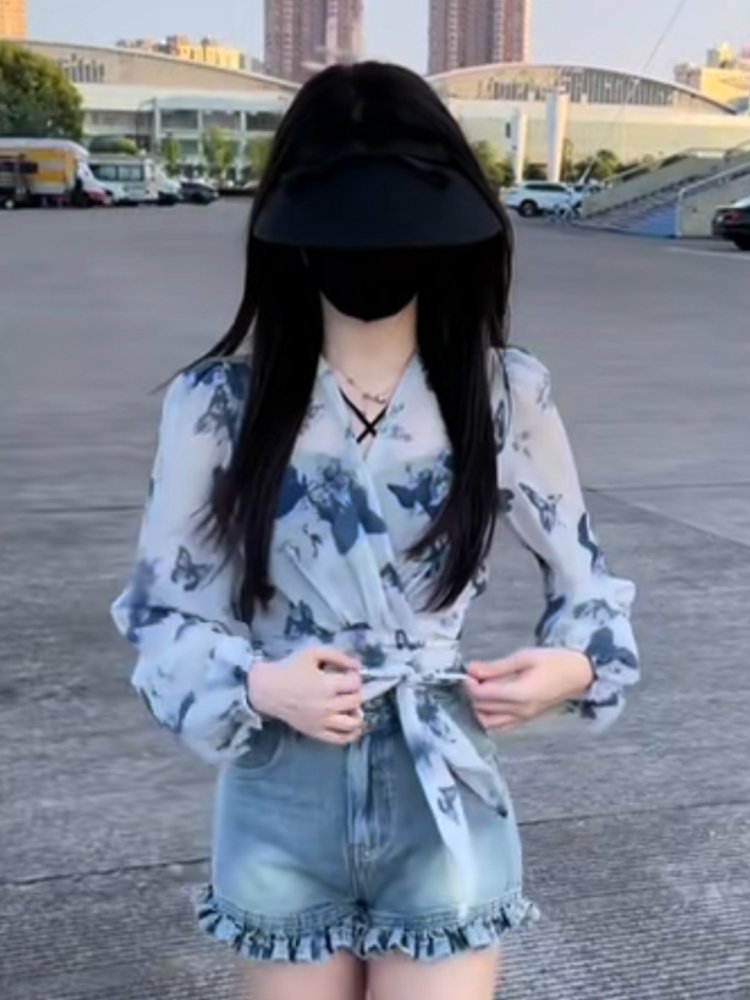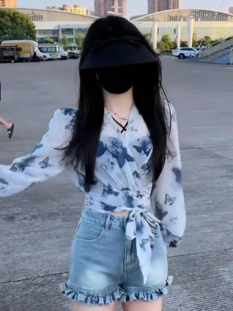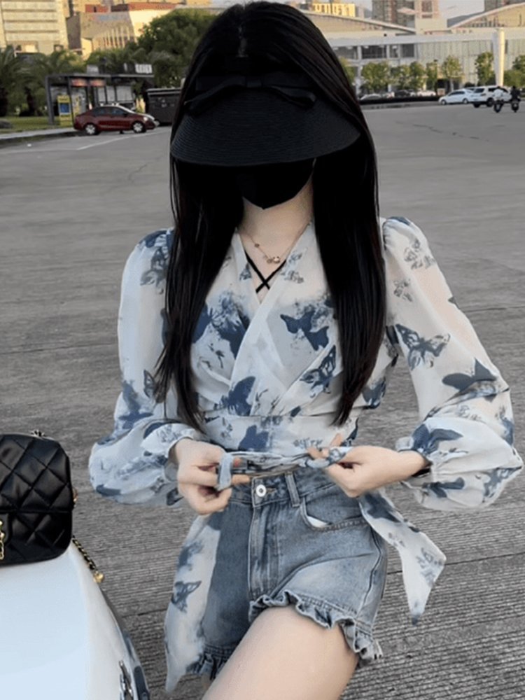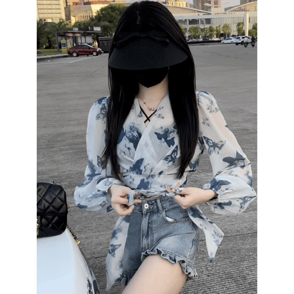 Французский шифоновый топ с размазанным бантом для женщин, летняя легкая роскошная высококачественная тонкая рубашка с длинными рукавами на бретелях, солнцезащитная одежда