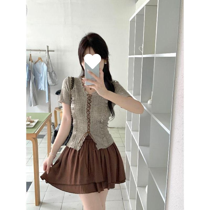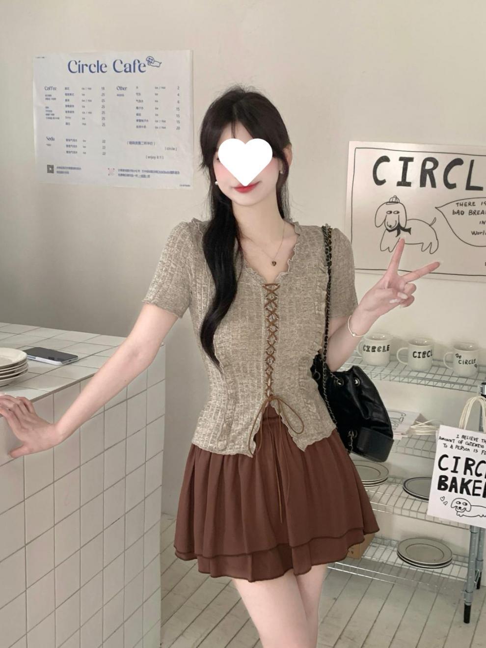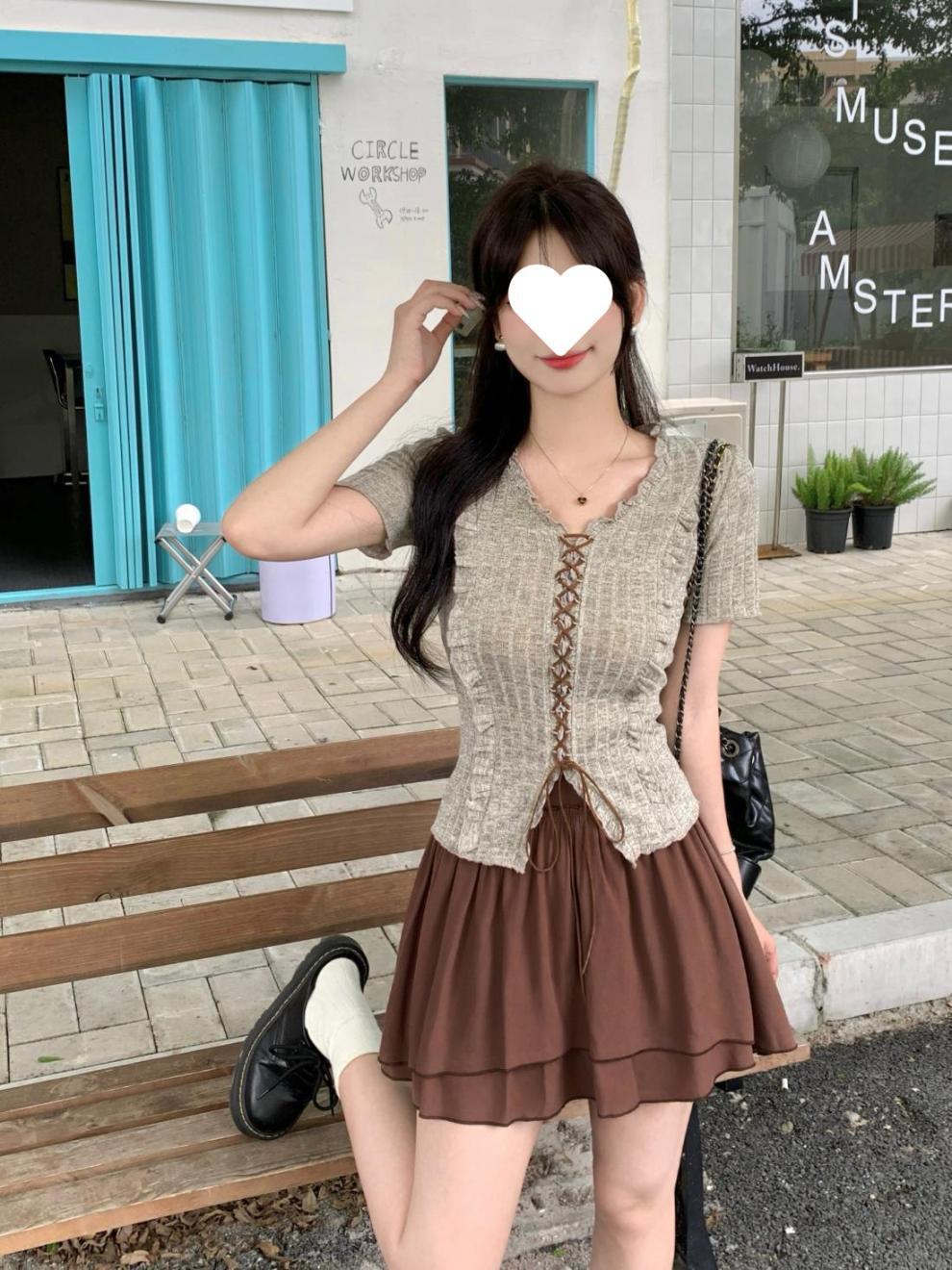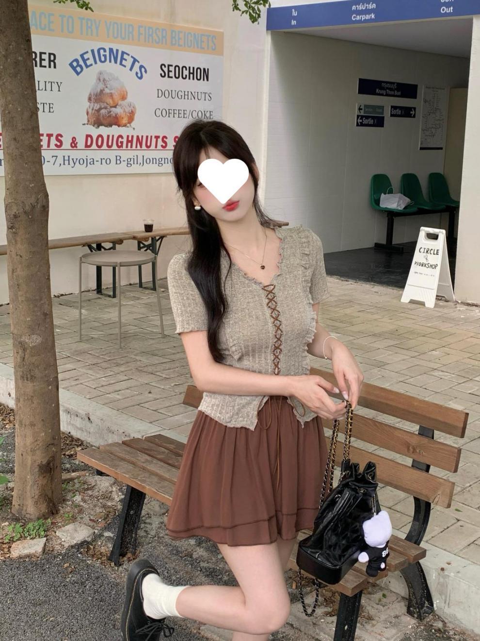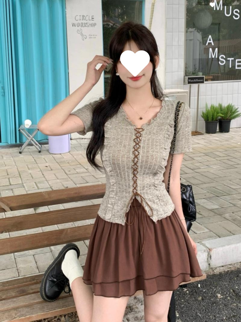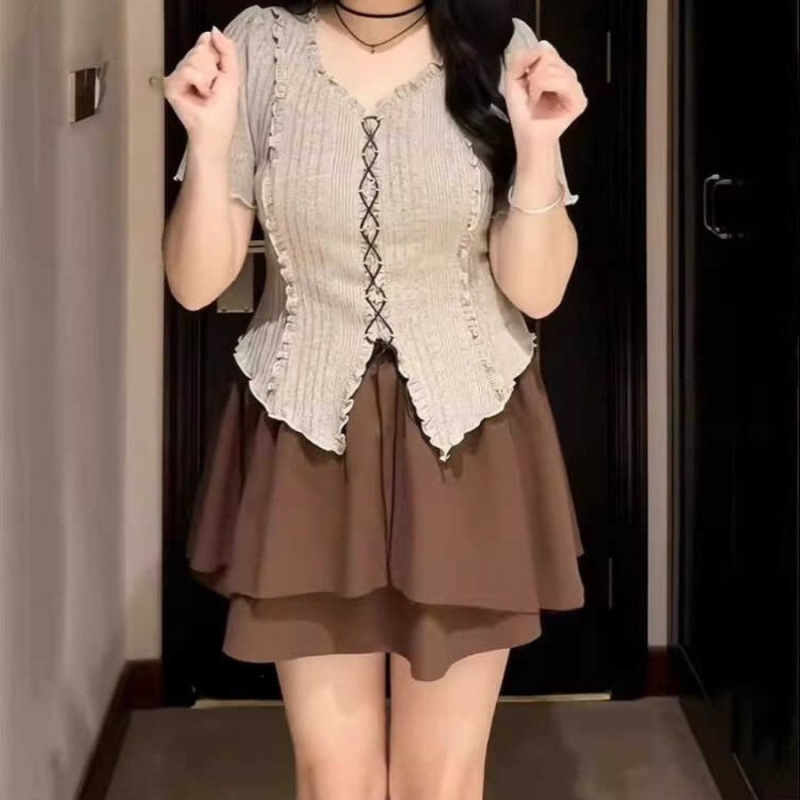 Высококачественный серый топ.; Качественная коричневая юбка.; Экономичный комплект из двух предметов: топ + юбка