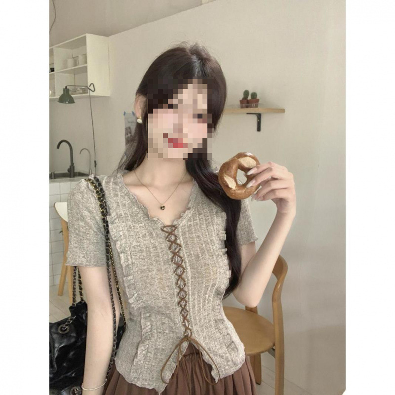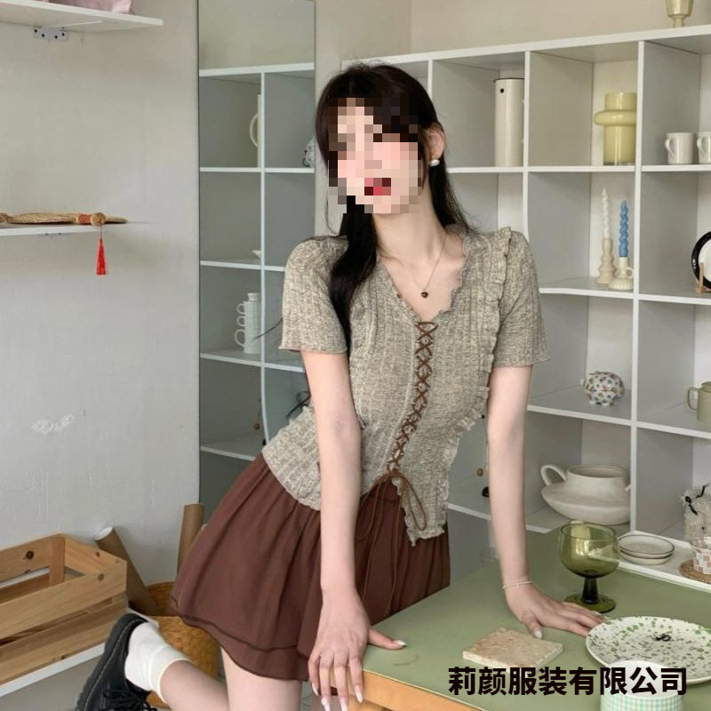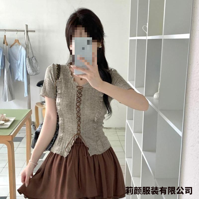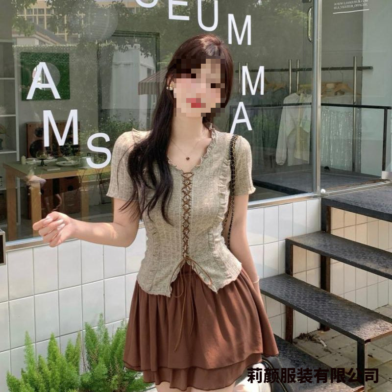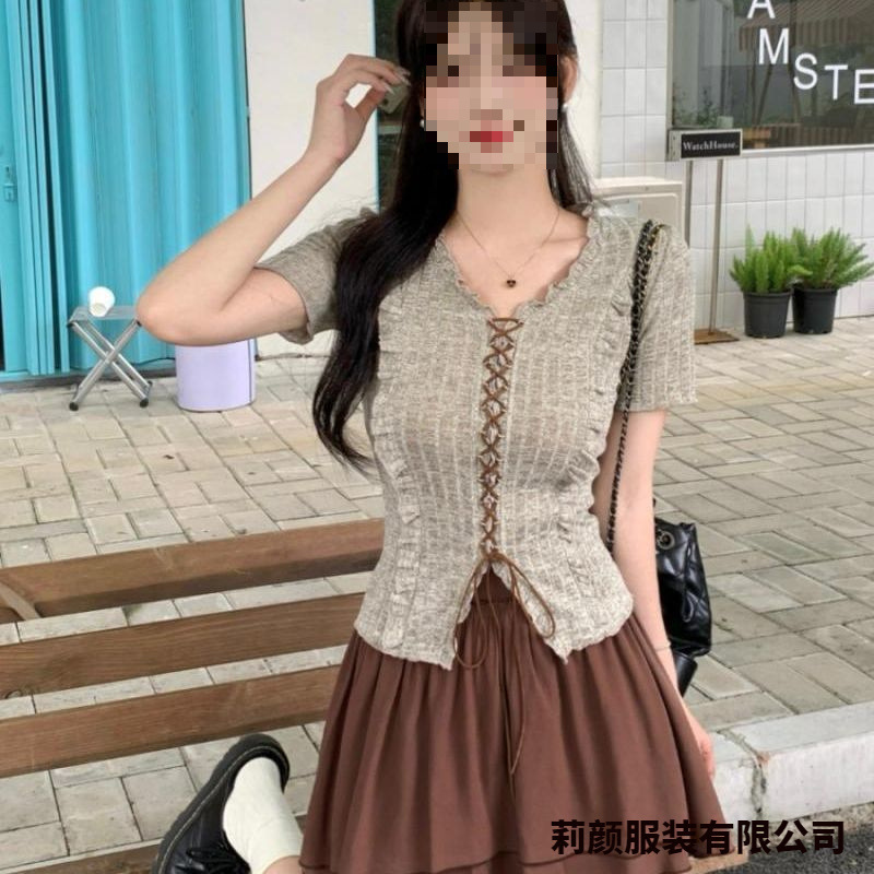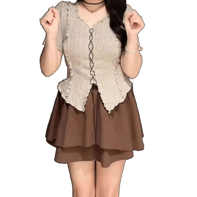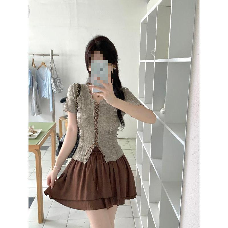 [Комплект из двух предметов в корейском стиле] Топ + юбка; [Цельный корейский инс] Серый топ; [Цельная корейская модель] Коричневая юбка