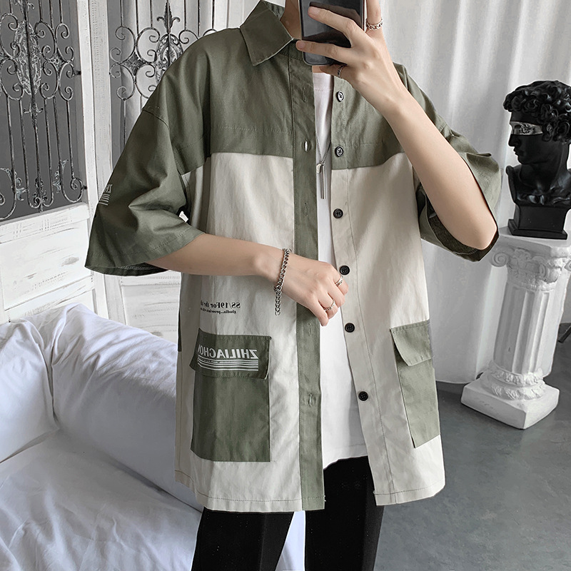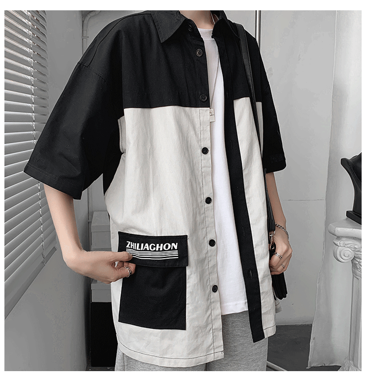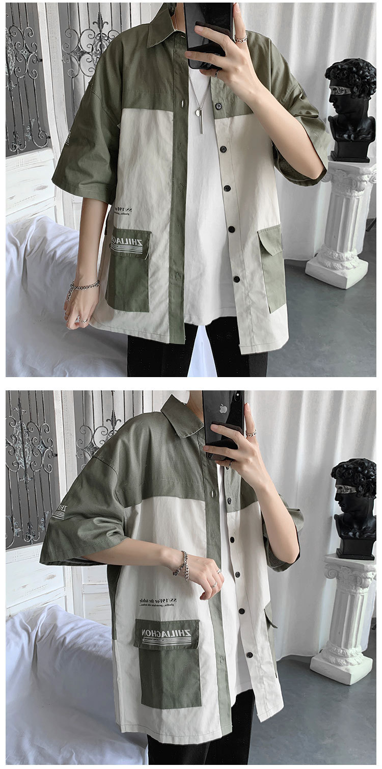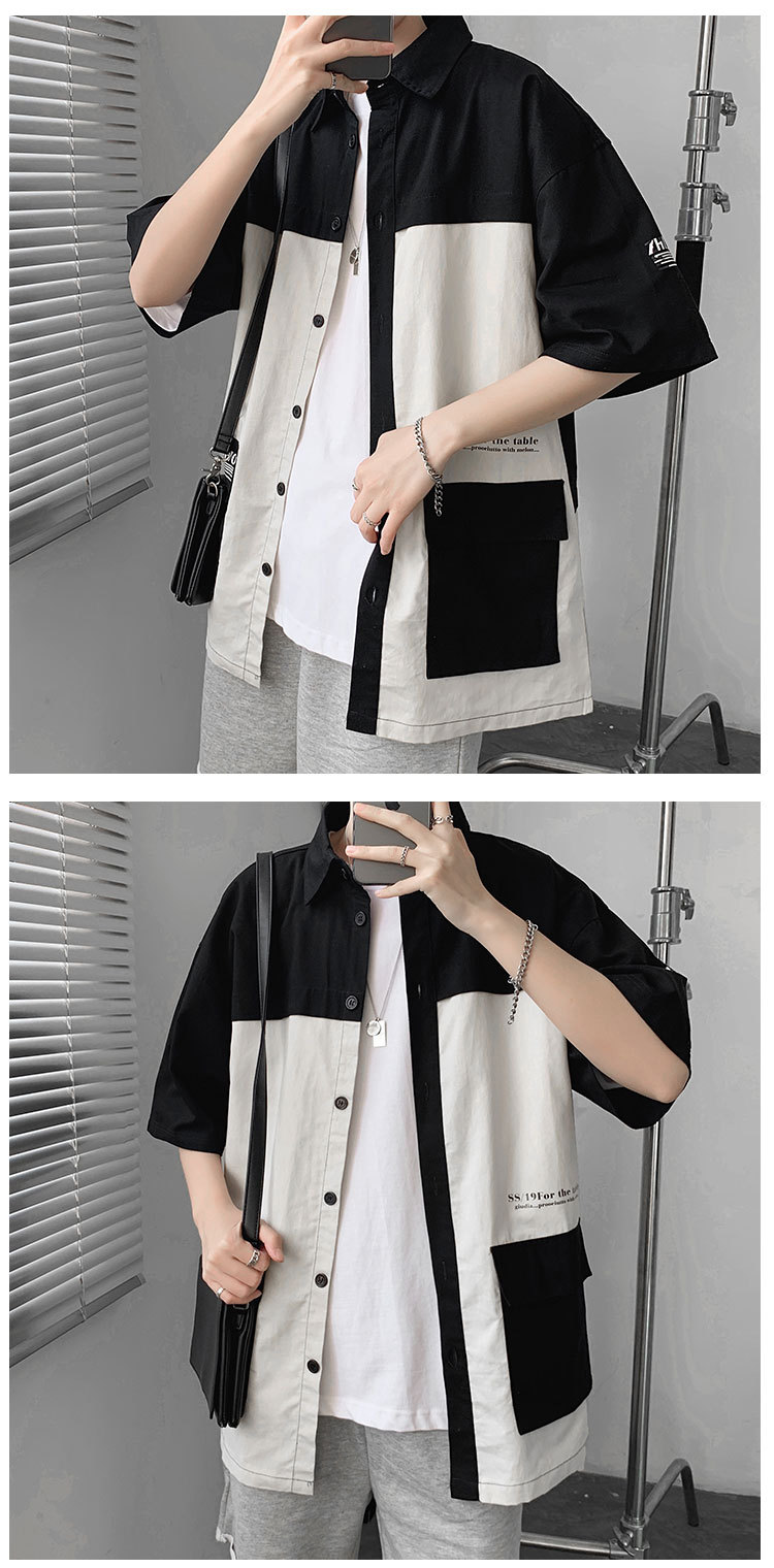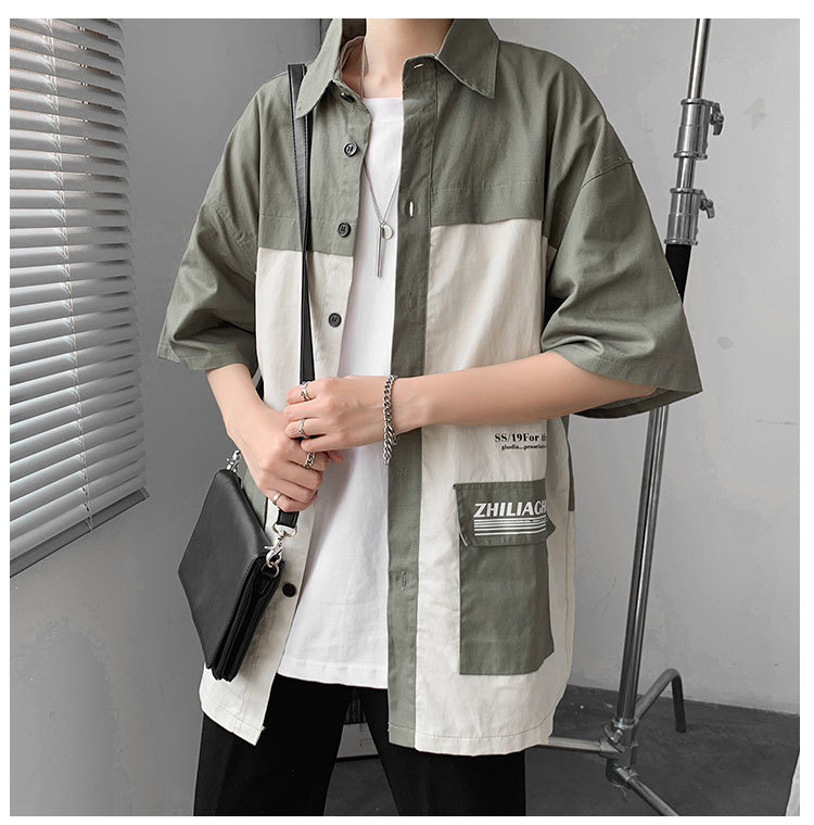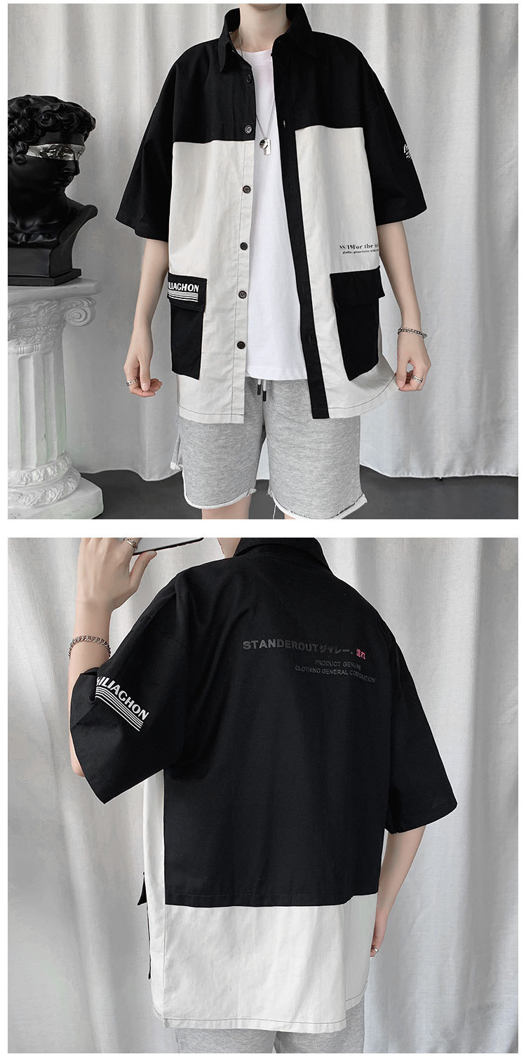 Рубашка с короткими рукавами, мужская повседневная свободная рабочая рубашка в гонконгском стиле, летние модные брендовые модные топы контрастного цвета в корейском стиле