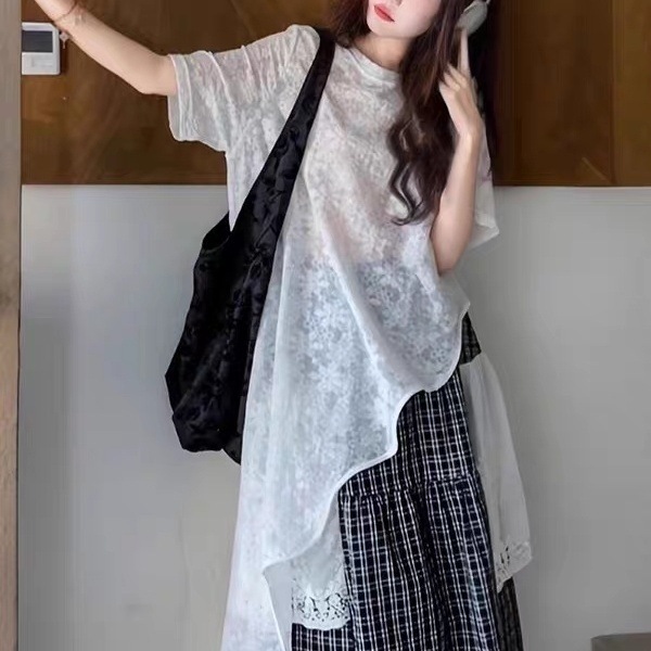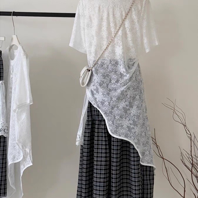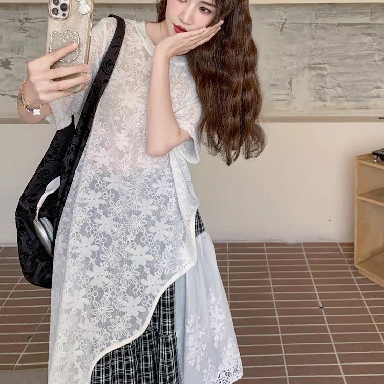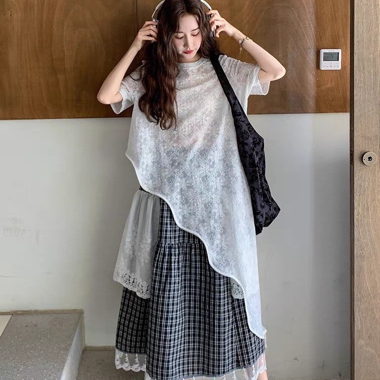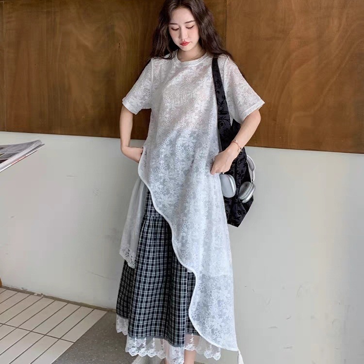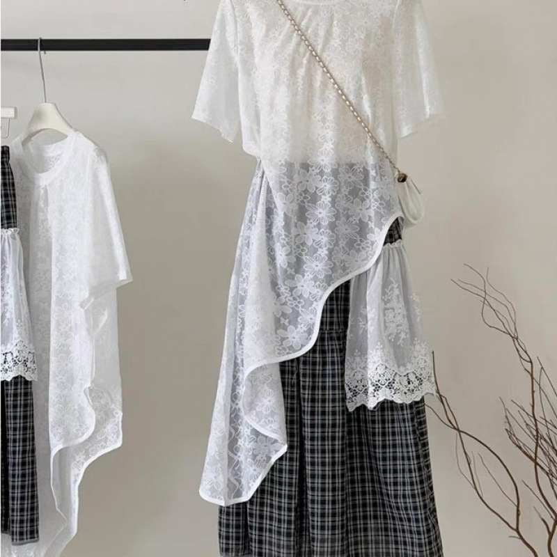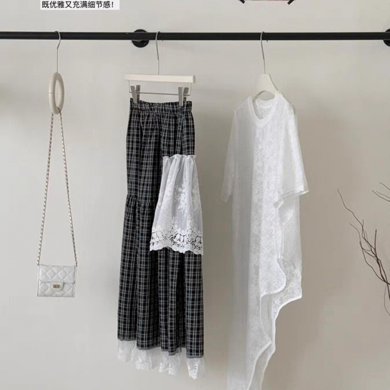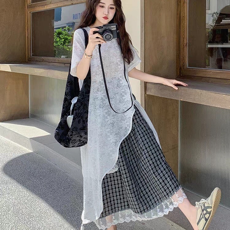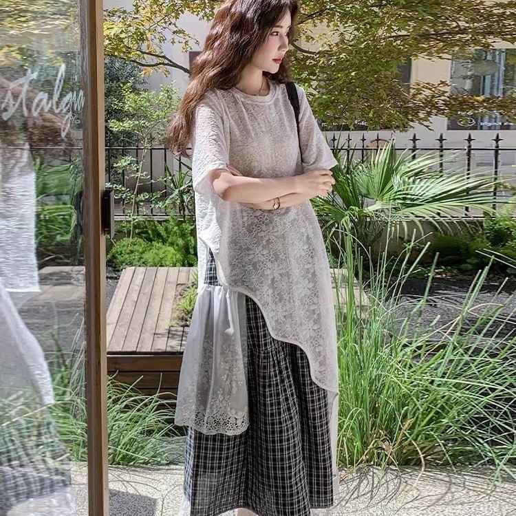 Женский костюм больших размеров Sen 2025, новый летний комплект из кружевного топа, закрывающего живот, и клетчатой юбки