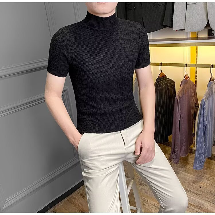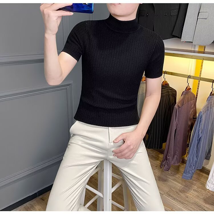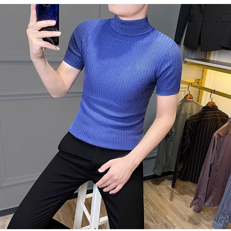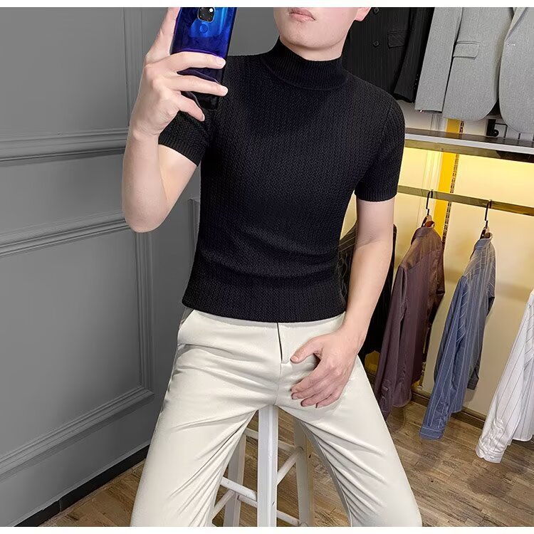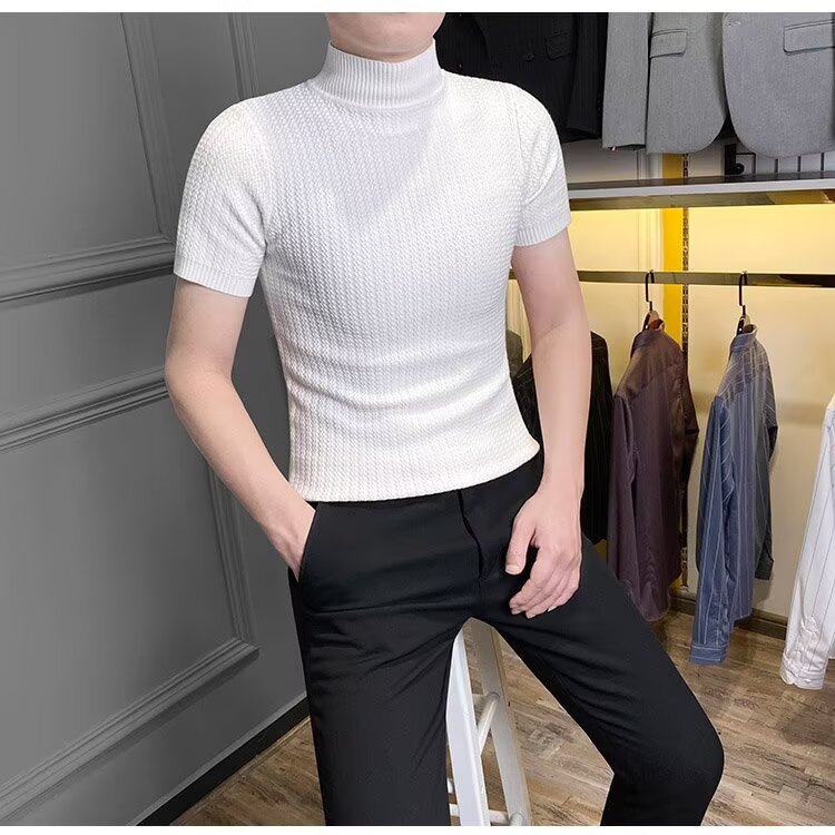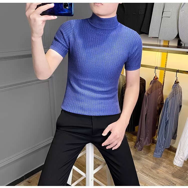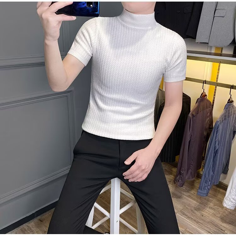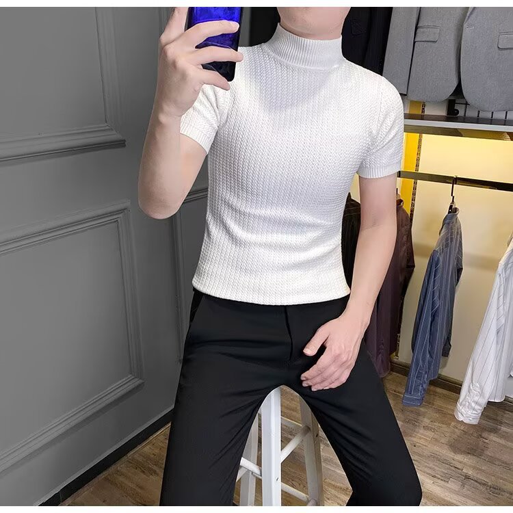 Новая летняя тонкая мужская трикотажная футболка в корейском стиле с полувысоким воротником и короткими рукавами, модная мужская полосатая рубашка со средним воротником