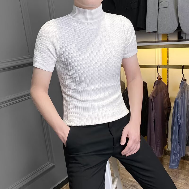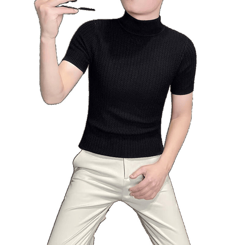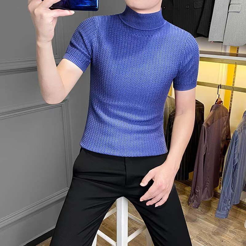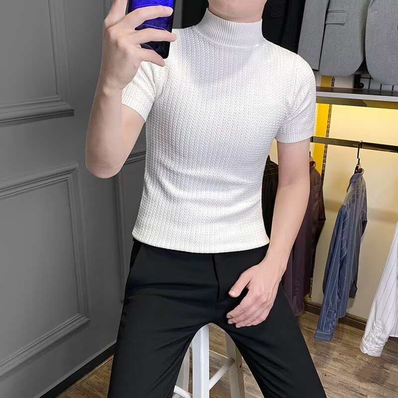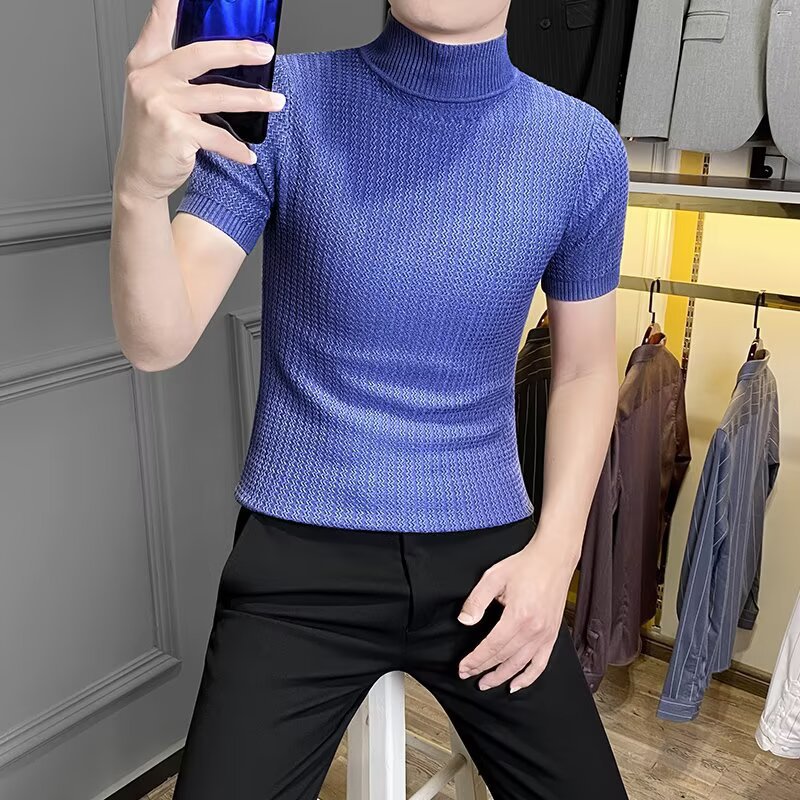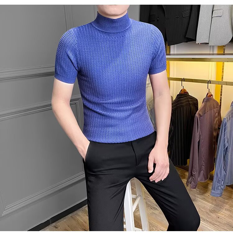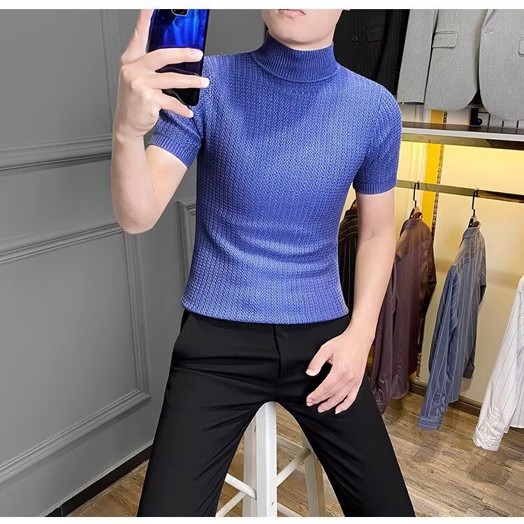 Новая летняя тонкая мужская трикотажная футболка в корейском стиле с полувысоким воротником и короткими рукавами, модная мужская полосатая рубашка со средним воротником
