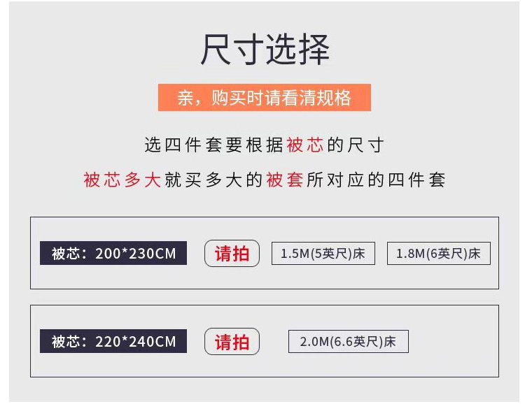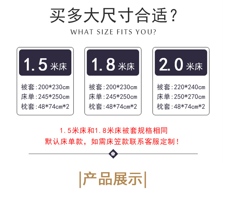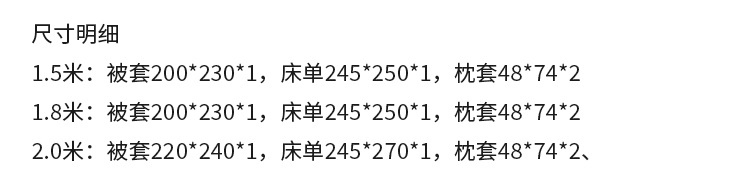 1.5m простыни (подходит для одеяла 200*230); 1.8m простыни (подходит для одеяла 200*230); 2.0m простыни (подходит для одеяла 220*240)