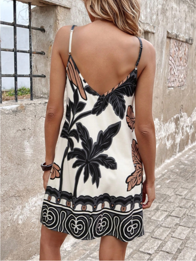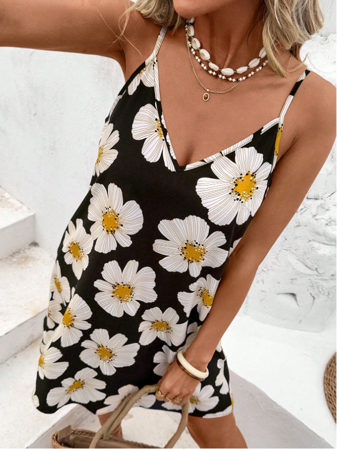 Летняя распродажа 2025: новое платье с V-образным вырезом и принтом на бретелях для женщин, европейский и американский стиль, трансграничная доставка через Amazon.