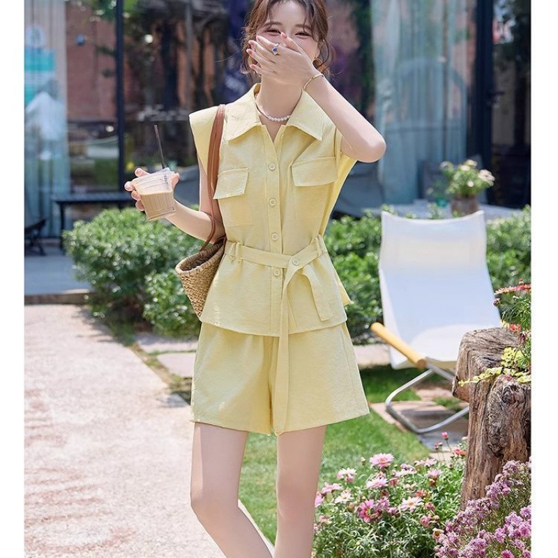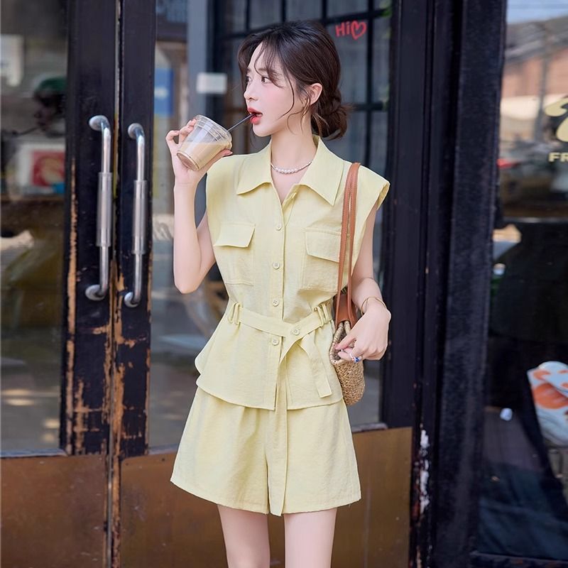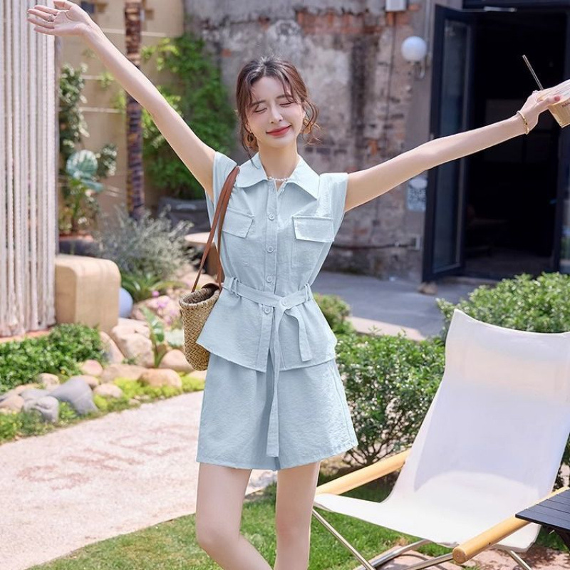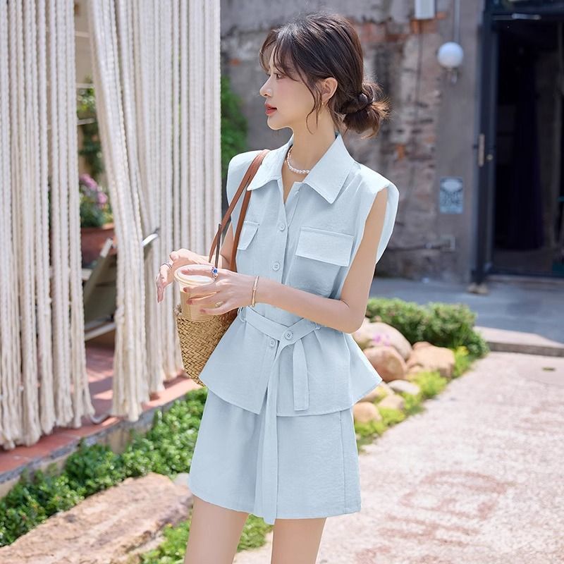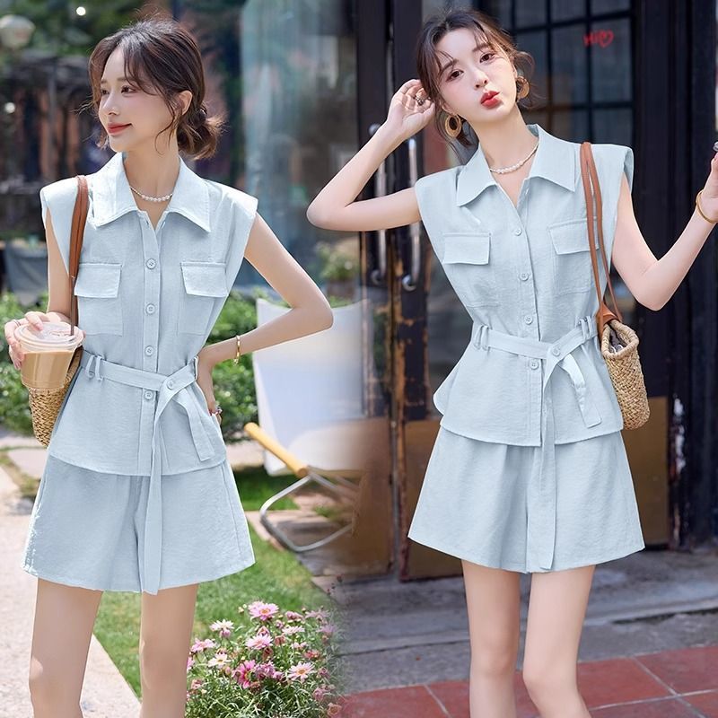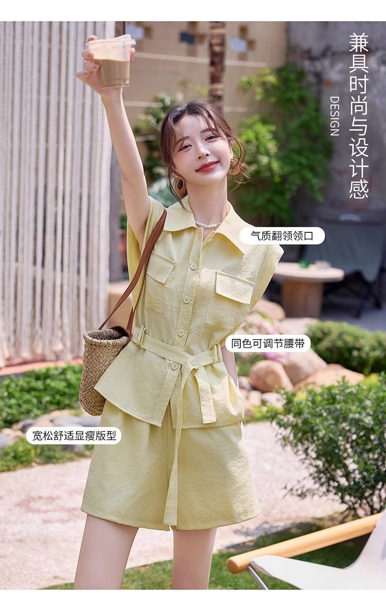 Летний костюм-двойка в корейском стиле 2025 года: рубашка и шорты, макаронные цвета, молодежный, стройнящий, для поездок на работу.
