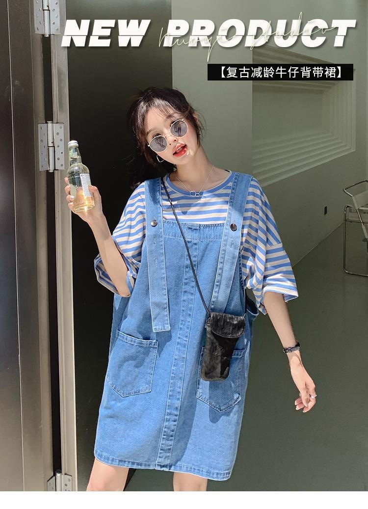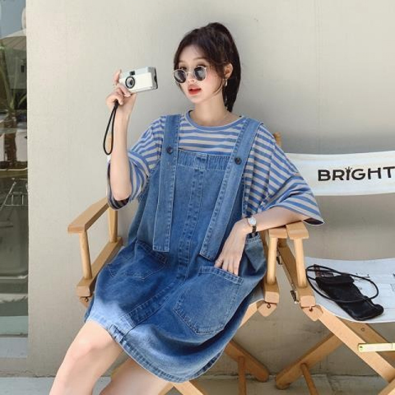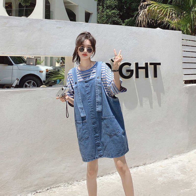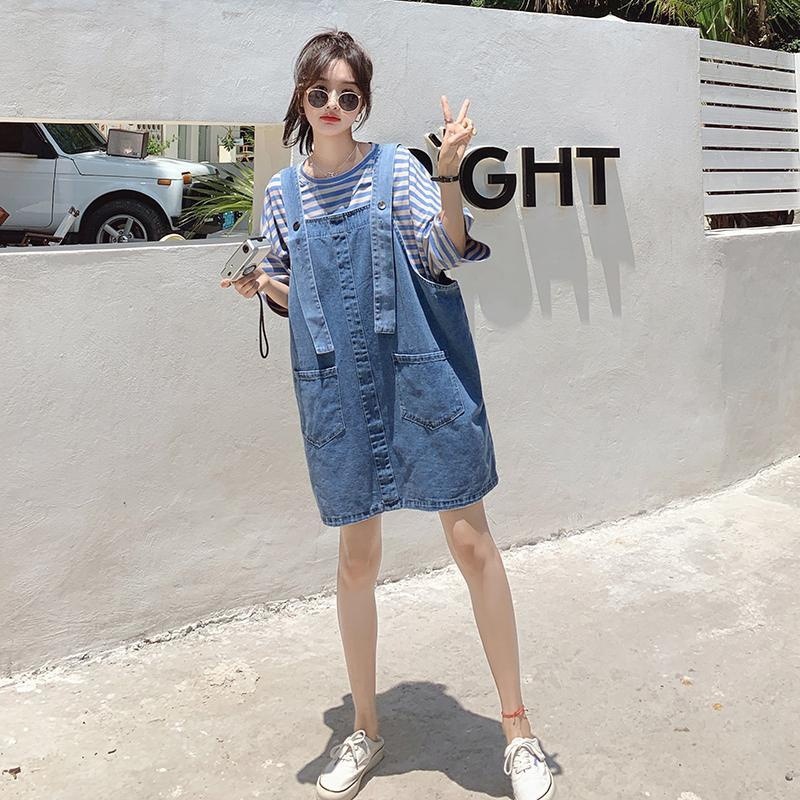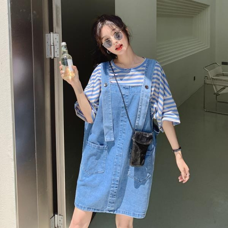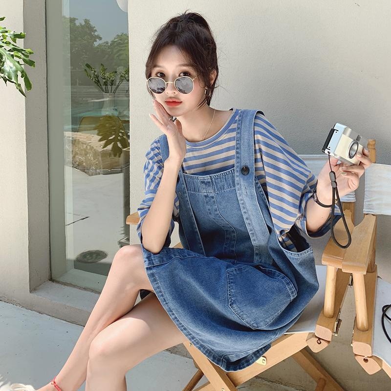 Светло-синяя джинсовая юбка на подтяжках, женский летний костюм 2025, новый корейский стиль, свободное утягивающее платье, уменьшающее возраст, для маленьких людей