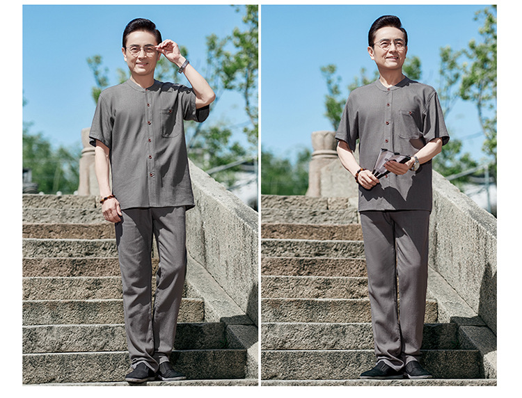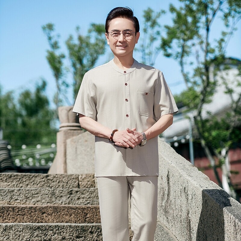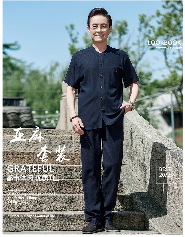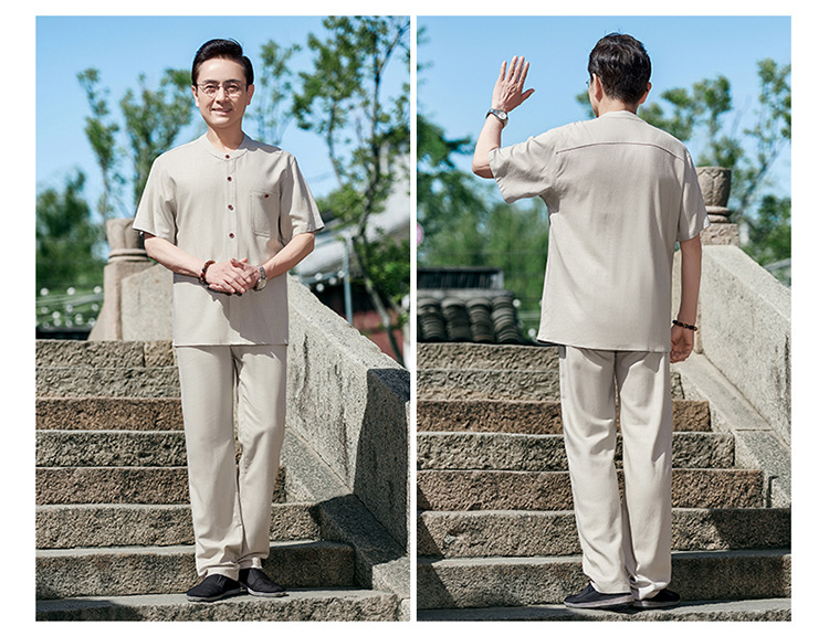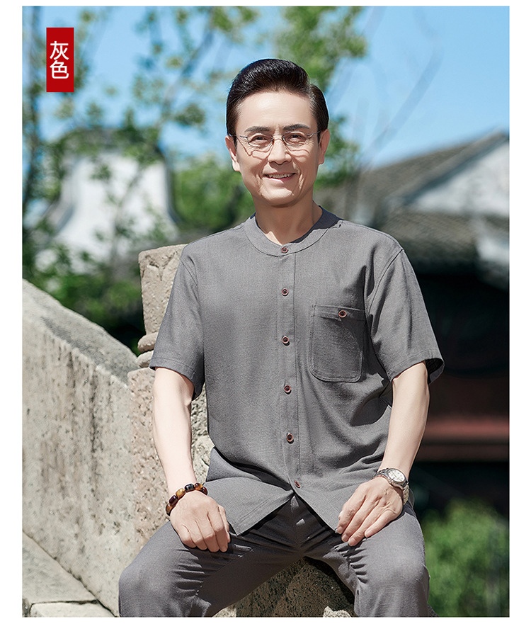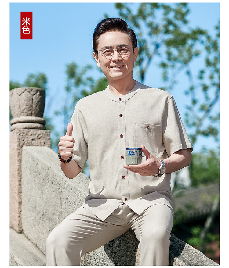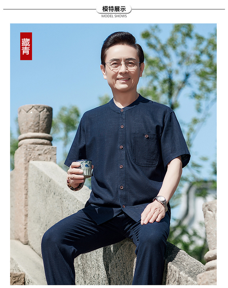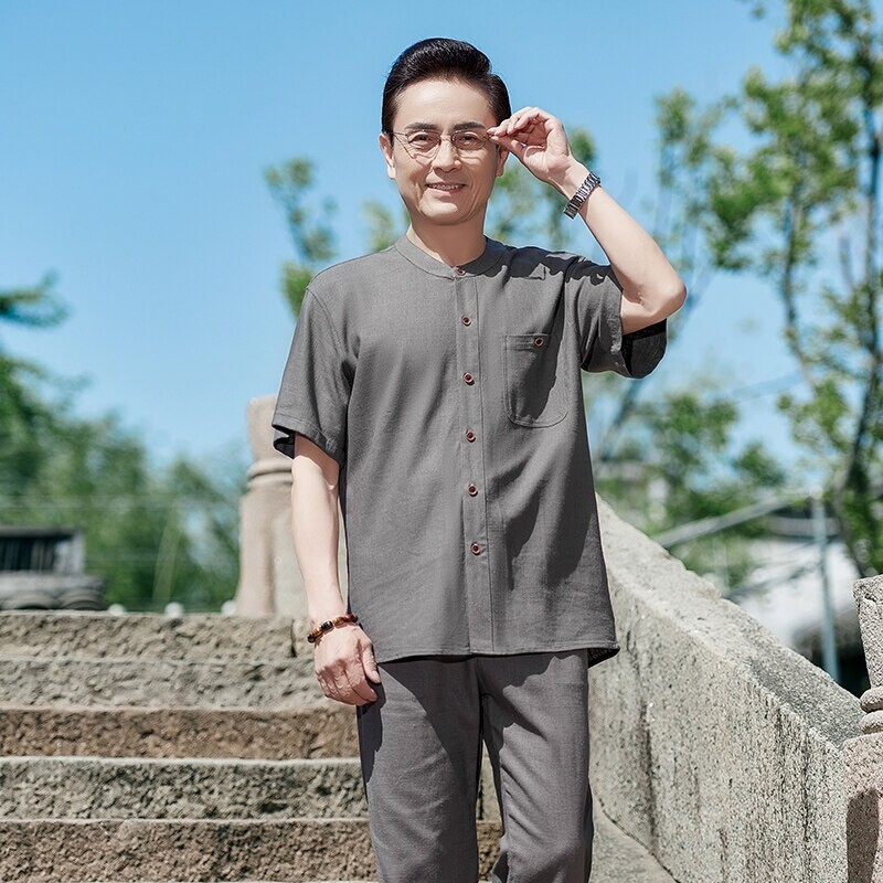 0624 Папин костюм из хлопка и льна, костюм Тан, мужская рубашка с короткими рукавами, летний костюм, льняная одежда для дедушки среднего и пожилого возраста