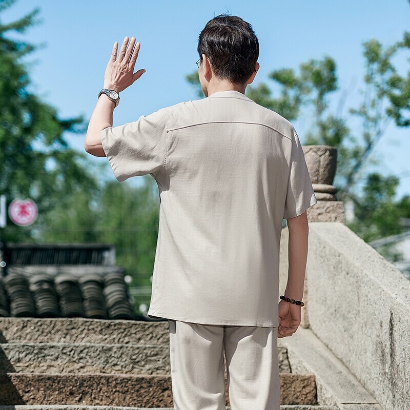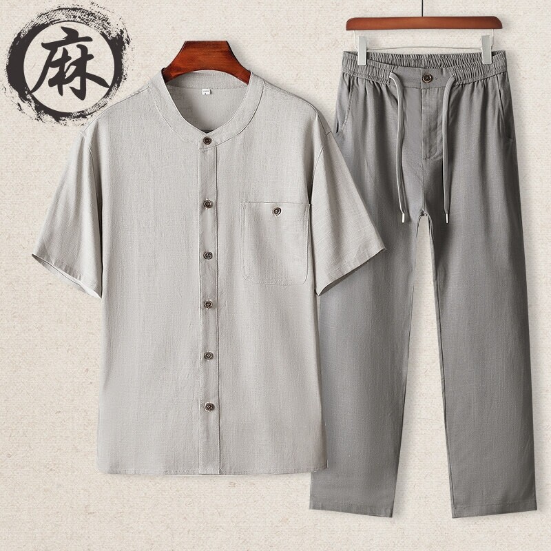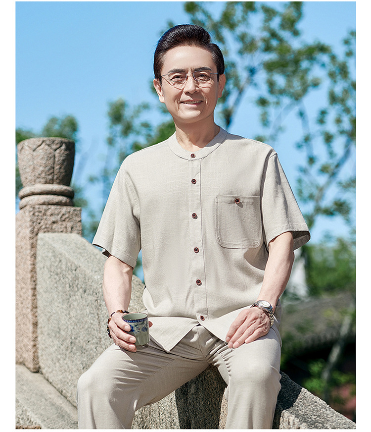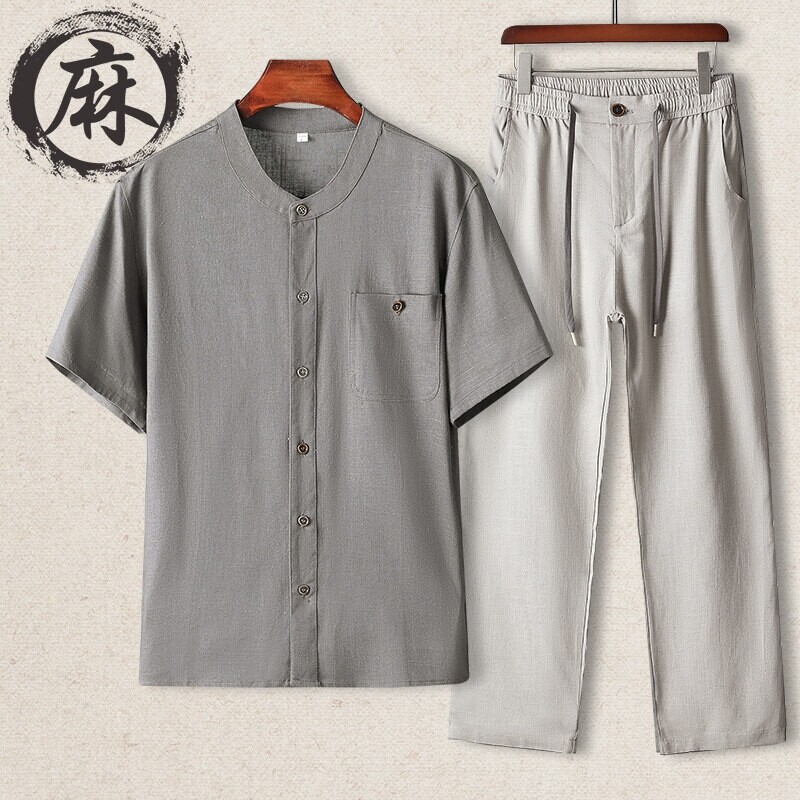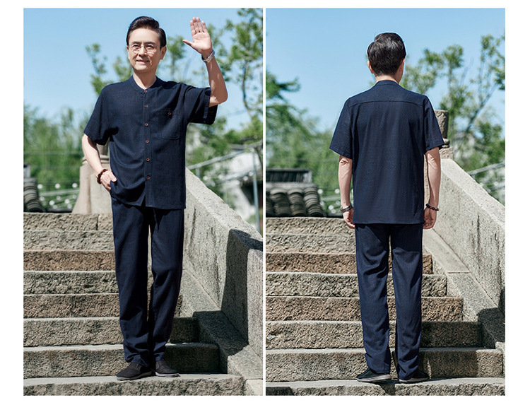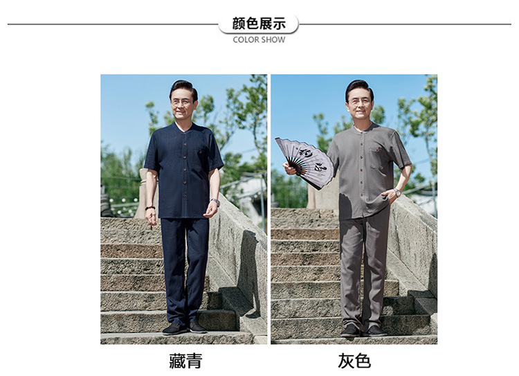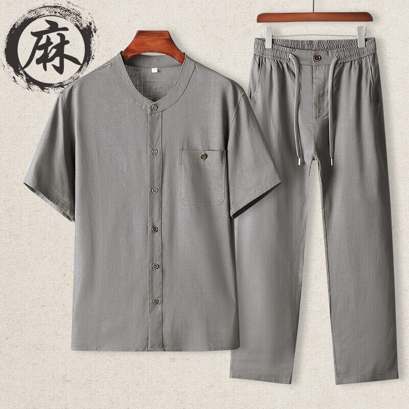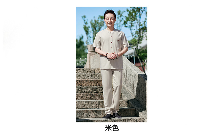 0624 Папин костюм из хлопка и льна, костюм Тан, мужская рубашка с короткими рукавами, летний костюм, льняная одежда для дедушки среднего и пожилого возраста