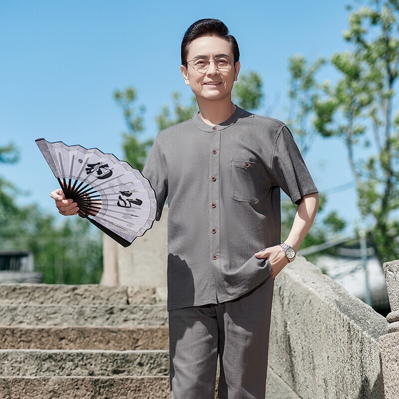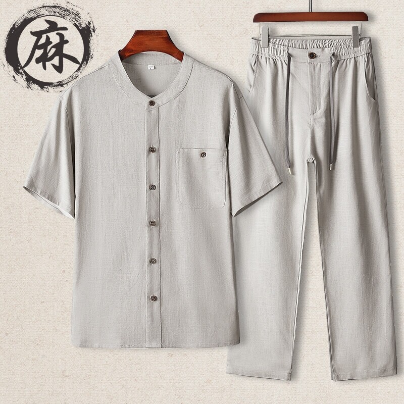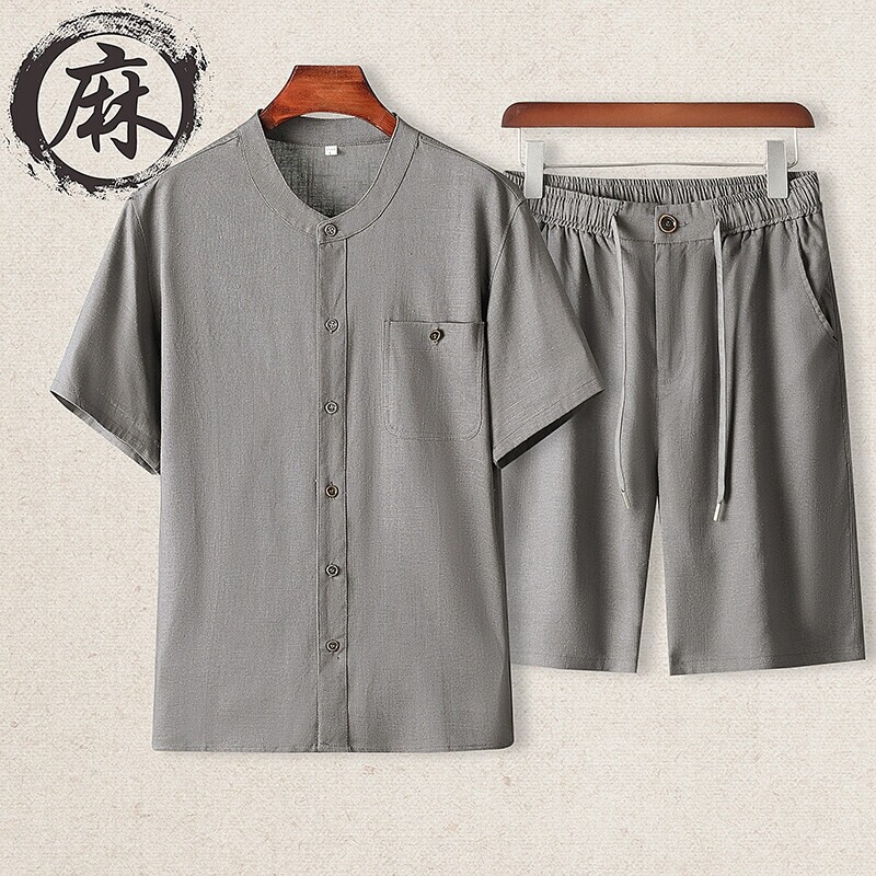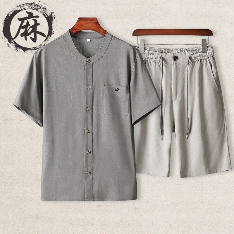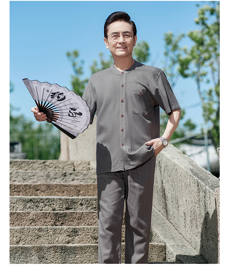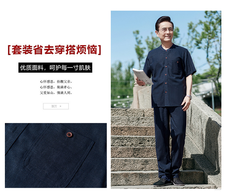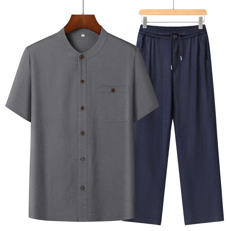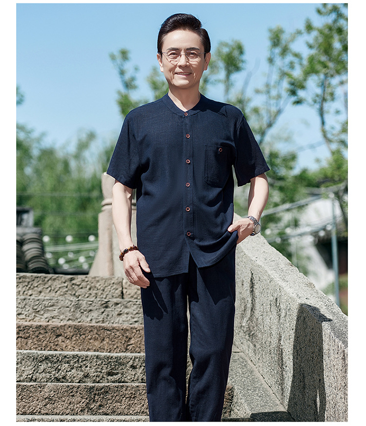 0624 Папин костюм из хлопка и льна, костюм Тан, мужская рубашка с короткими рукавами, летний костюм, льняная одежда для дедушки среднего и пожилого возраста