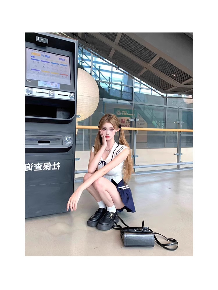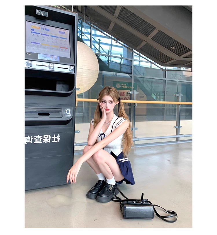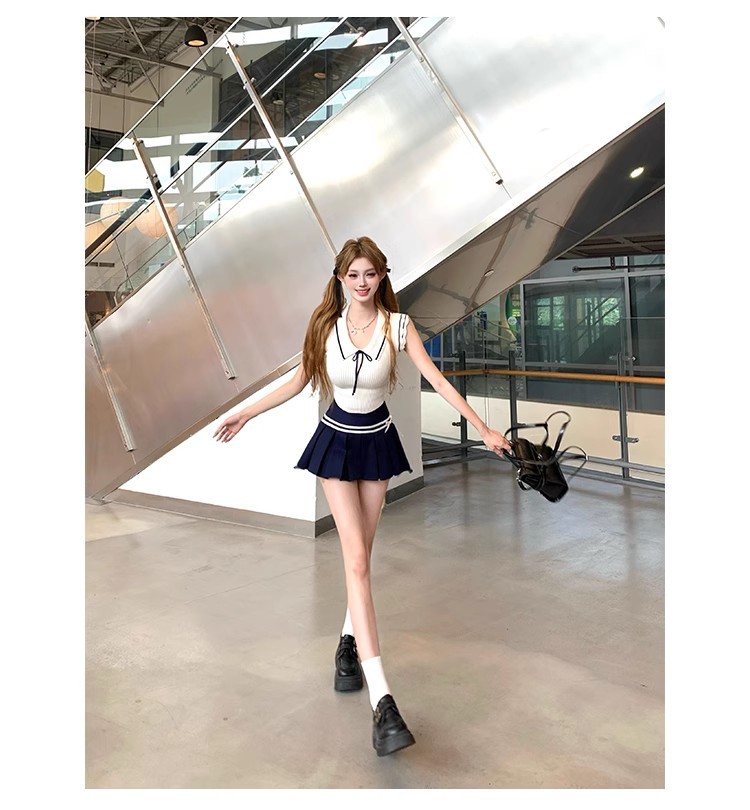 Летний новый стиль для колледжа, облегающий топ без рукавов для девушек, вязаный утягивающий топ, синяя плиссированная юбка, комплект из двух предметов, уменьшающий возраст