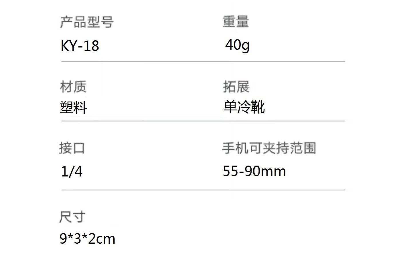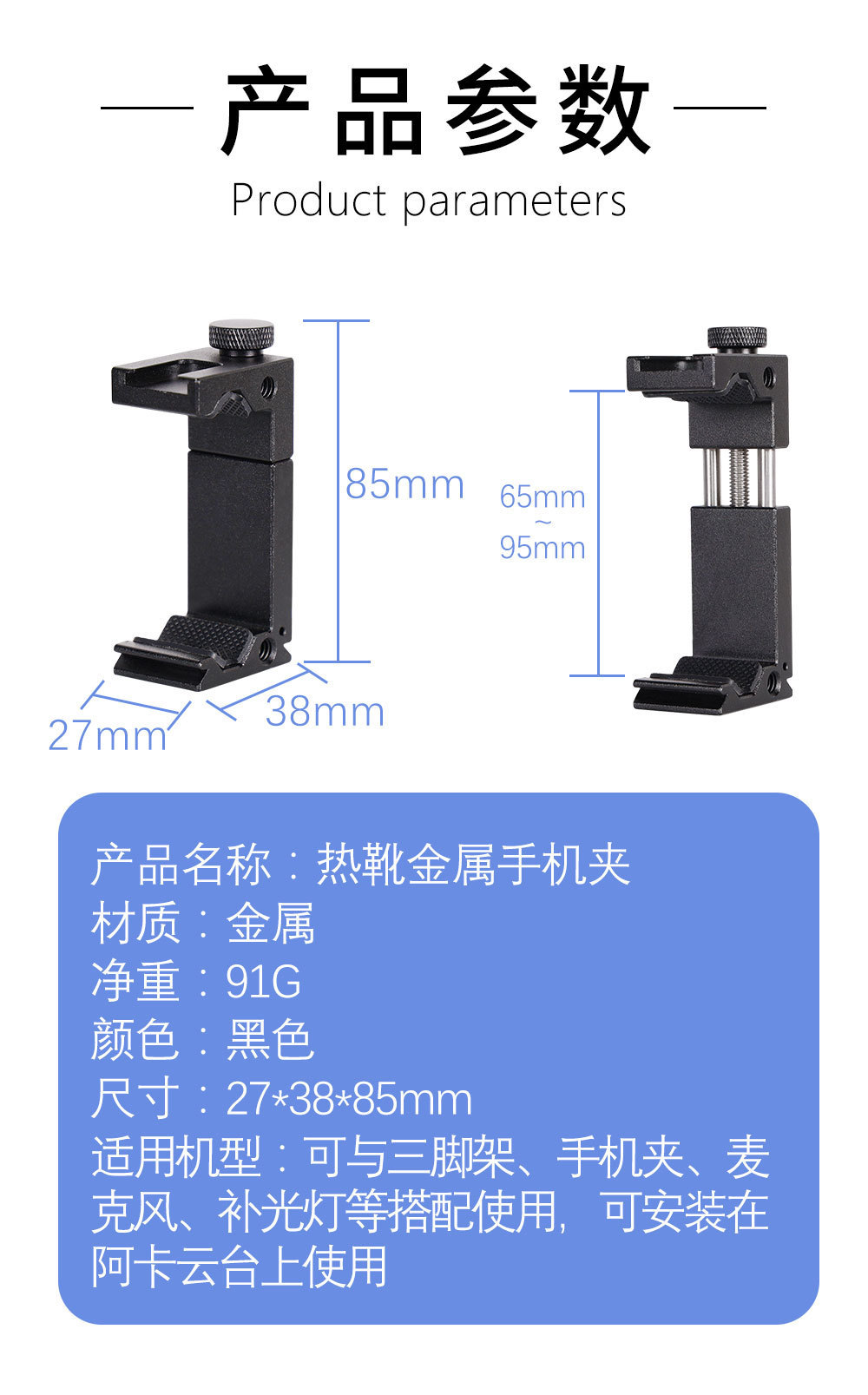 此款手机夹适用于苹果、 三星、小米等55-105mm手机拍照使用,也可以安装在自拍杆、三脚架拍摄使用,是目前市场上通用的手机夹。