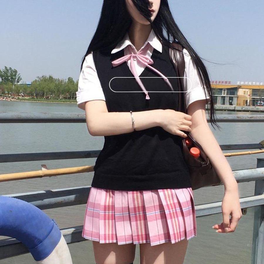 Черный жилет + короткие рукава + розовый узел + юбка в клетку ярких цветов.; Короткие рукава + розовый узел + юбка в клетку ярких цветов.; Черный жилет + юбка в клетку конфет + розовый узел; Черный жилет + короткие рукава + розовый узел.; Черный пуловер-жилет цельный; Белый внутренний короткий рукав, цельный предмет; [Конфеты] Пледовая юбка, цельная вещь