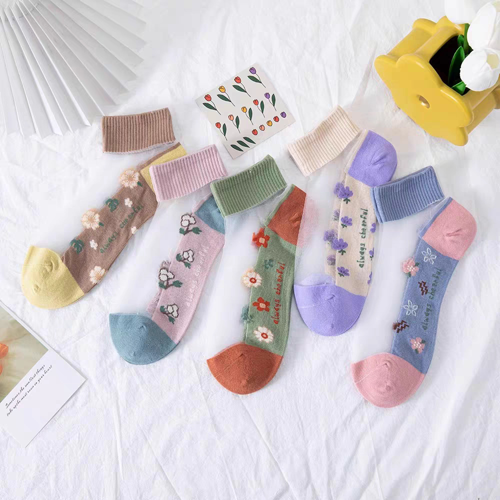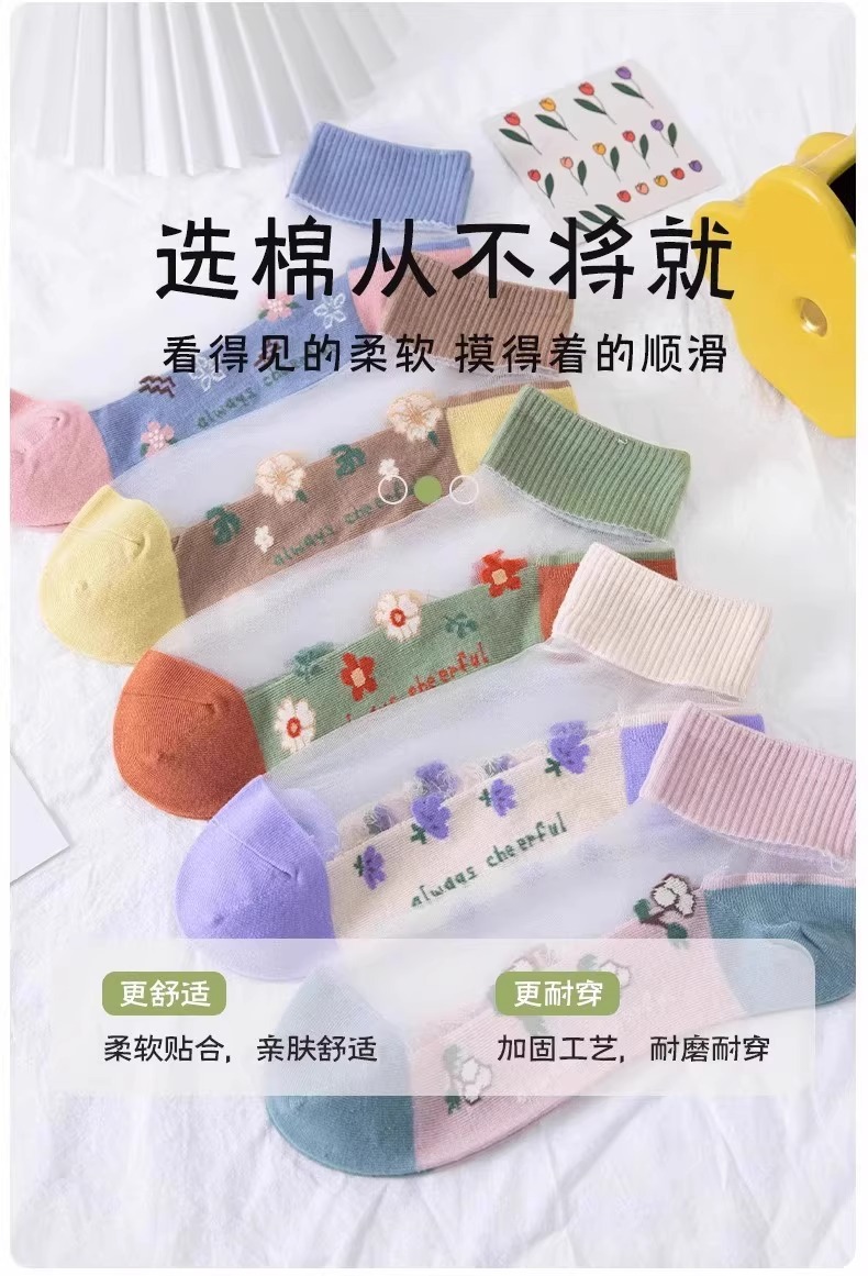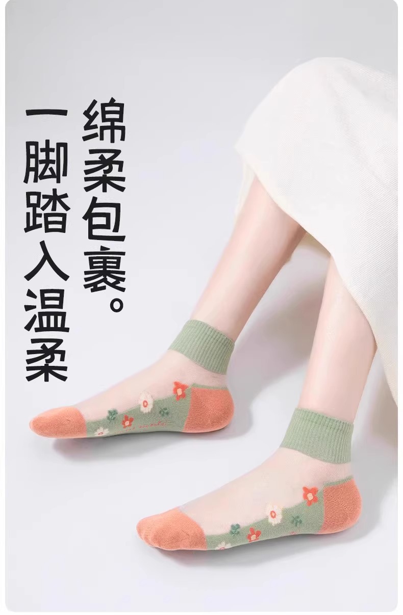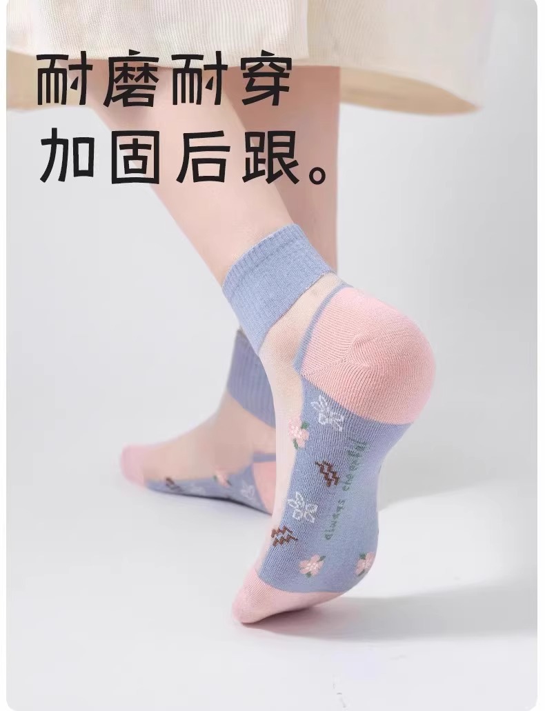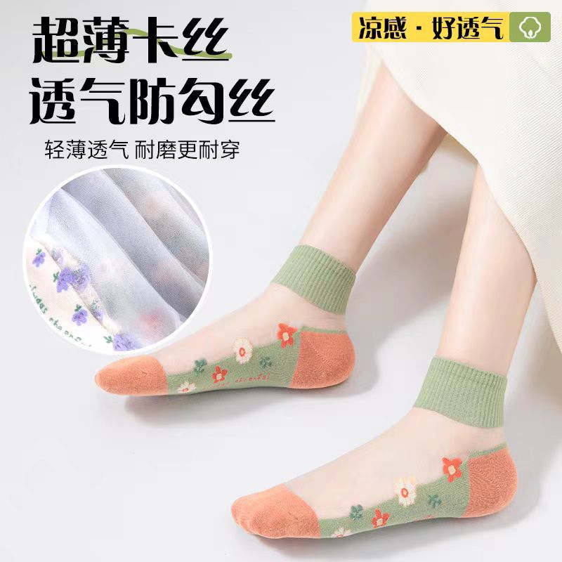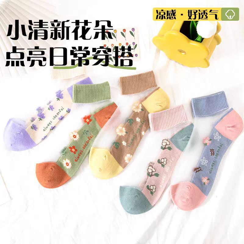 Женские короткие носки с хлопковым дном, носки из стеклянного шелка, летний тонкий стиль, маленькие прозрачные сетчатые носки с цветочным принтом, впитывающие пот.