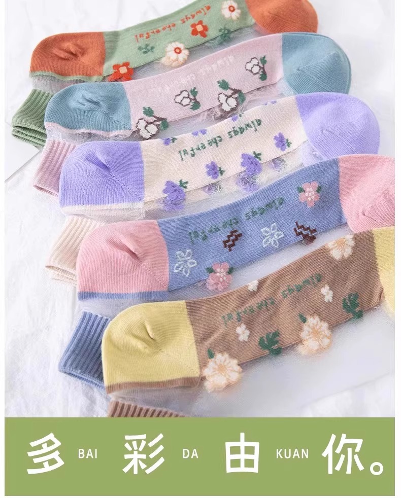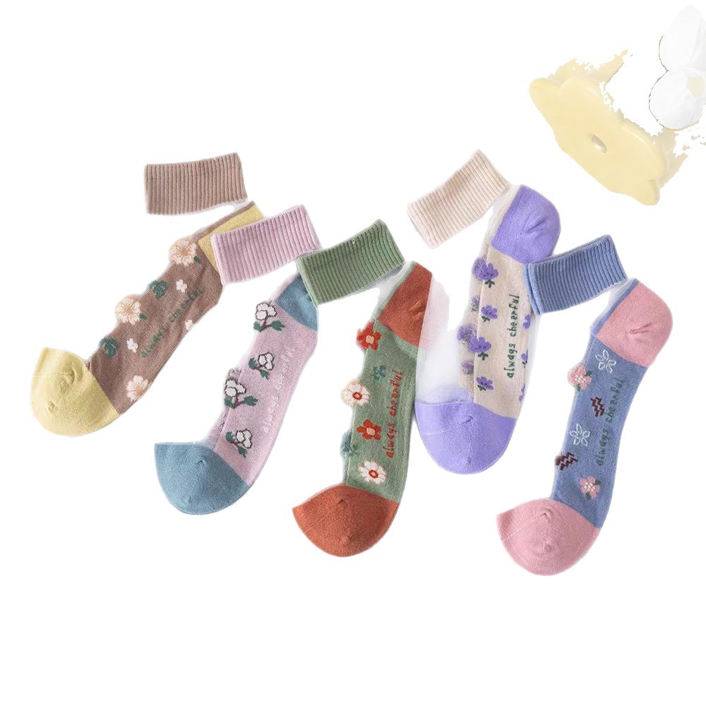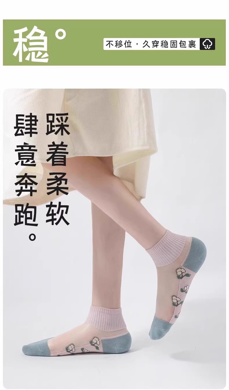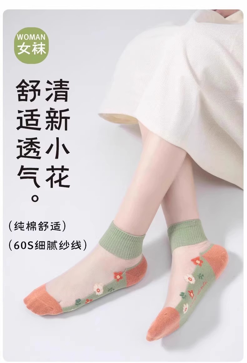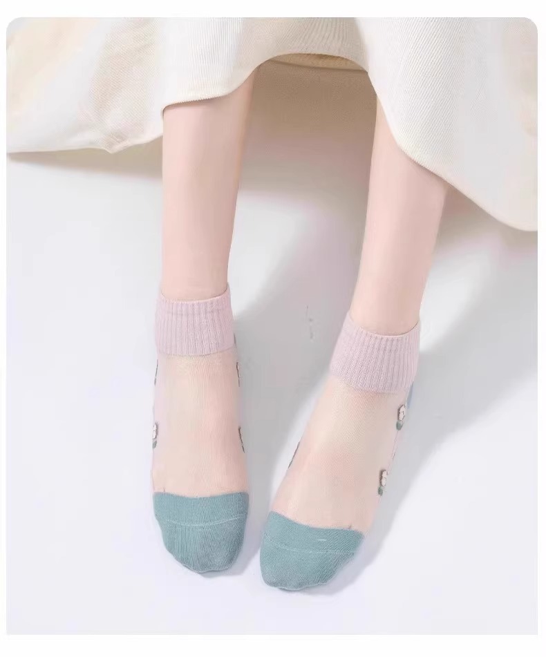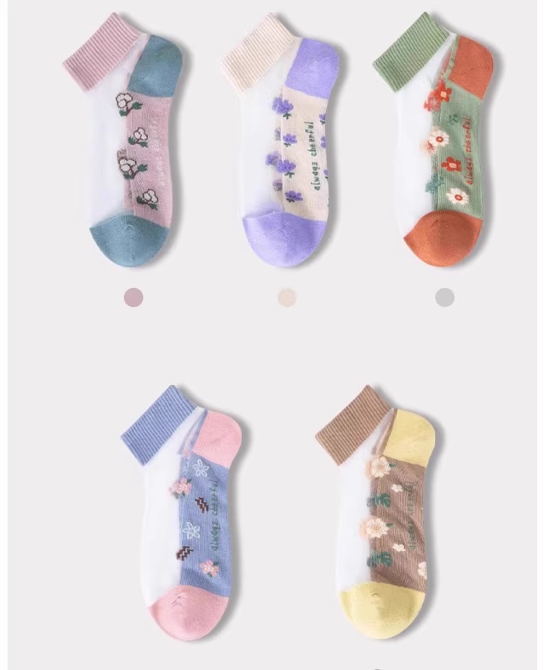 Женские короткие носки с хлопковым дном, носки из стеклянного шелка, летний тонкий стиль, маленькие прозрачные сетчатые носки с цветочным принтом, впитывающие пот.
