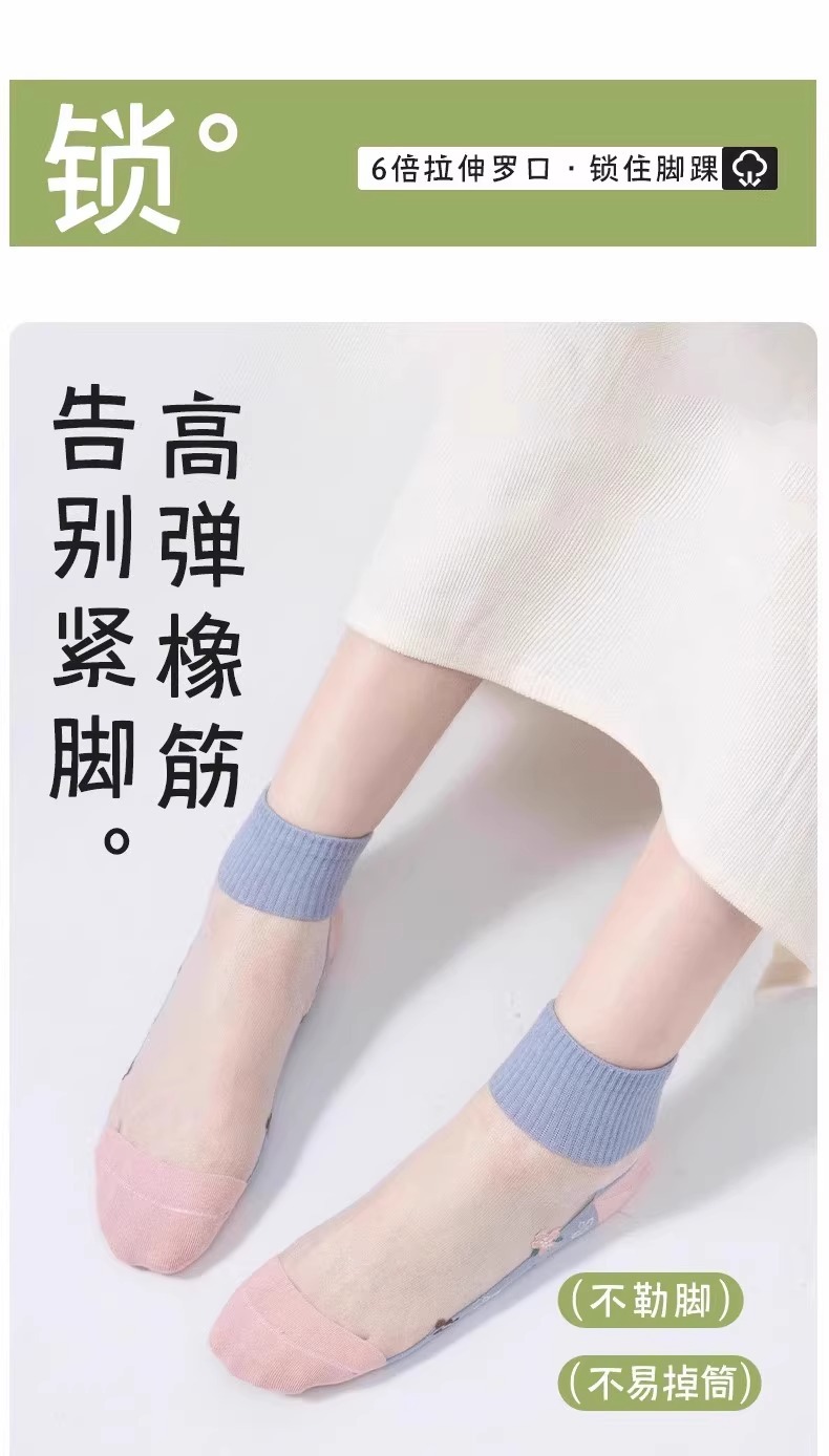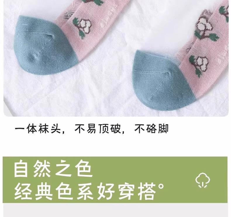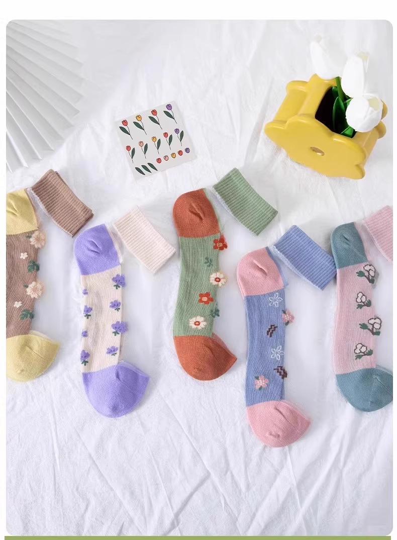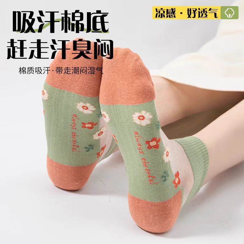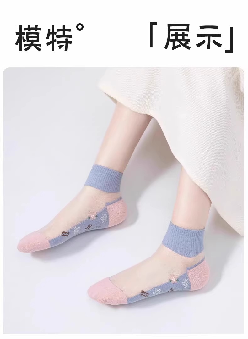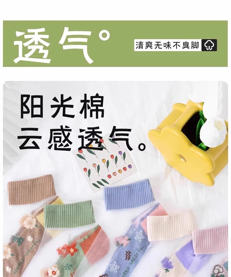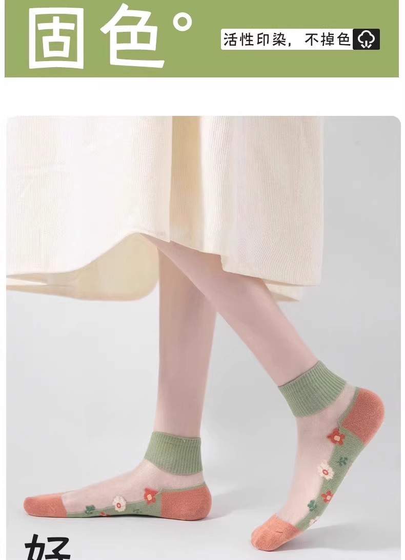 Женские короткие носки с хлопковым дном, носки из стеклянного шелка, летний тонкий стиль, маленькие прозрачные сетчатые носки с цветочным принтом, впитывающие пот.