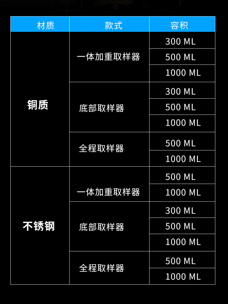 Встроенный утяжеленный пробоотборник 300 мл (медь); Встроенный утяжеленный пробоотборник 500 мл (медь); Встроенный утяжеленный пробоотборник 1000 мл (медь); Встроенный утяжеленный пробоотборник 500 мл (нержавеющая сталь); Встроенный утяжеленный пробоотборник 1000 мл (нержавеющая сталь); Нижний пробоотборник 300мл (медь); Нижний пробоотборник 500мл (медь); Нижний пробоотборник 1000мл (медь); Нижний пробоотборник 300 мл (нержавеющая сталь); Нижний пробоотборник 500 мл (нержавеющая сталь); Нижний пробоотборник 1000 мл (нержавеющая сталь); Полный пробовоз 500мл (медь); Полный пробовоз 1000мл (медь); Полный пробоотборник 500 мл (нержавеющая сталь); Полный пробоотборник 1000 мл (нержавеющая сталь); Средний пробовоз 500мл (медь); Средний пробовоз 1000мл (медь); Открытый пробоотборник 500 мл (нержавеющая сталь); Открытый пробоотборник 1000мл (нержавеющая сталь); Открытый пробоотборник 500мл (из меди); Открытый пробоотборник 1000мл (из меди); Пуля-пробоотборник 500 мл (нержавеющая сталь); Пуля-пробоотборник 1000мл (нержавеющая сталь); Встроенный утяжеленный пробоотборник 500 мл (медь) + 5m хлопчатобумажная веревка; Встроенный утяжеленный пробоотборник 1000 мл (медь) + 5m хлопчатобумажная веревка; Нижний пробоотборник 500 мл (медь) + 5m хлопчатобумажная веревка; Полный пробовоз 500 мл (медь) + 5m хлопчатобумажная веревка; 5m хлопковая веревка; 10m хлопковая веревка; Алюминиевая крышка