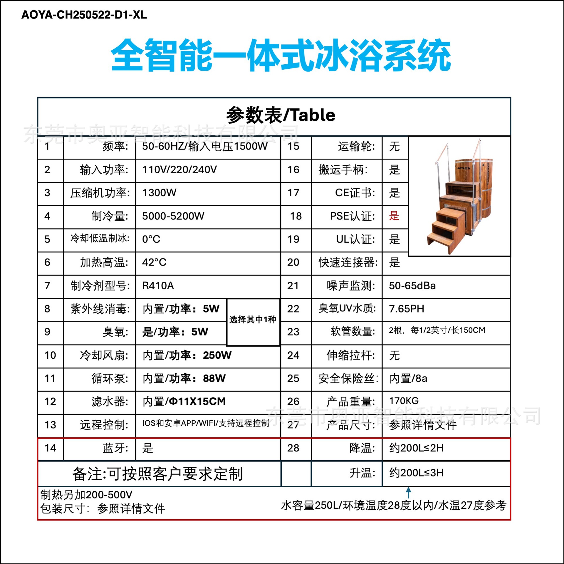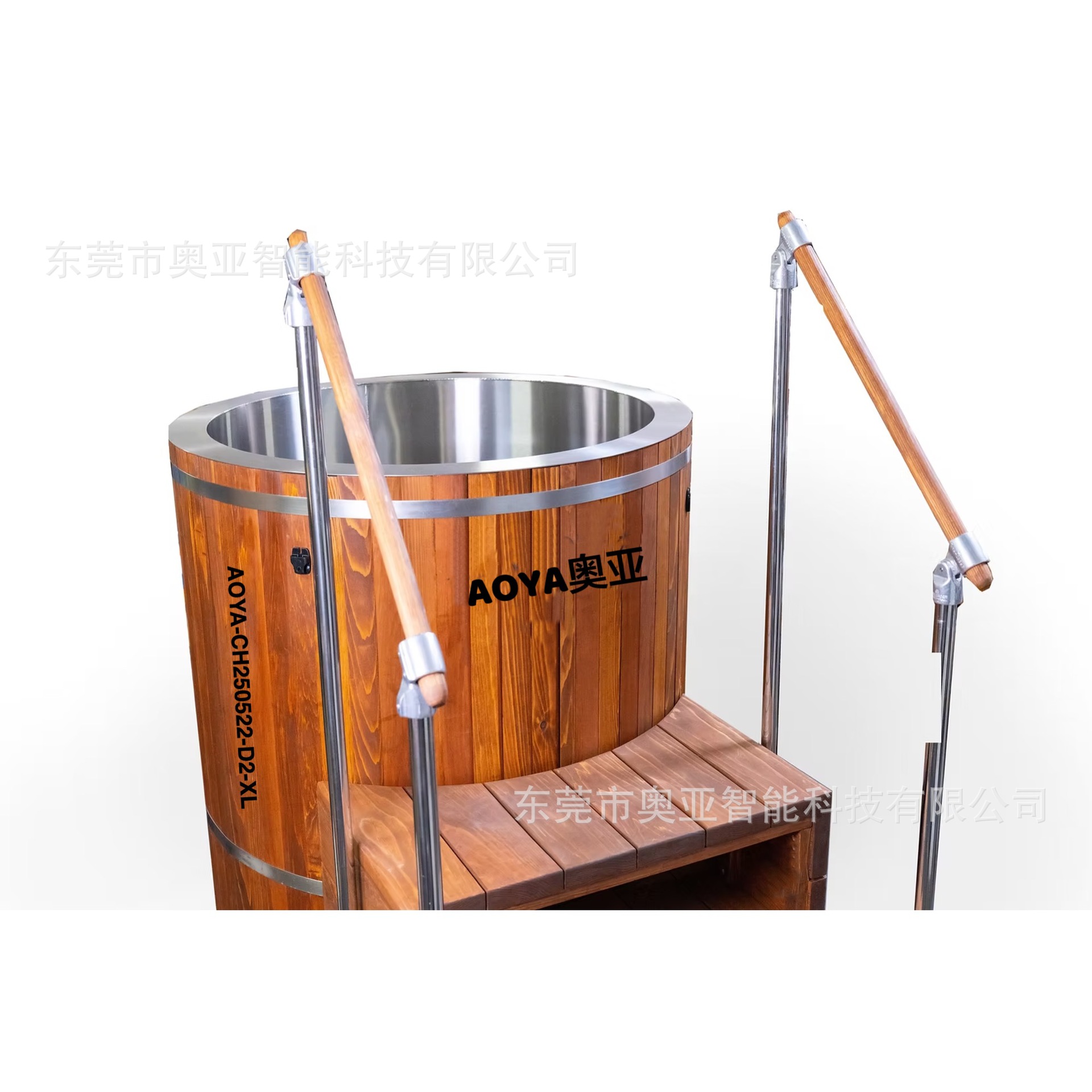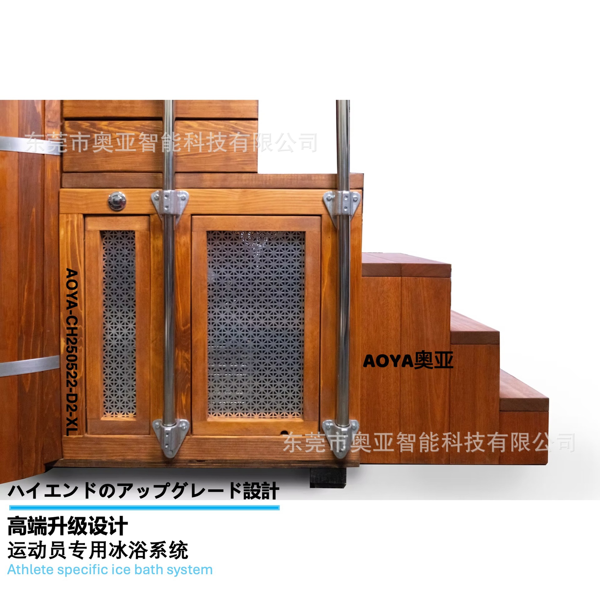 东莞市奥亚智能科技有限公司,主要开发设计高端运动员专用冰浴制冷设备浴缸,浴缸主要进口原木和不锈钢316材质组合合成,内部具有完善的冷却制冰系统,和低温水质循环系统,包括电压控制系统,手机控制系统和水质优化系统,完全按照运动员需求设计,