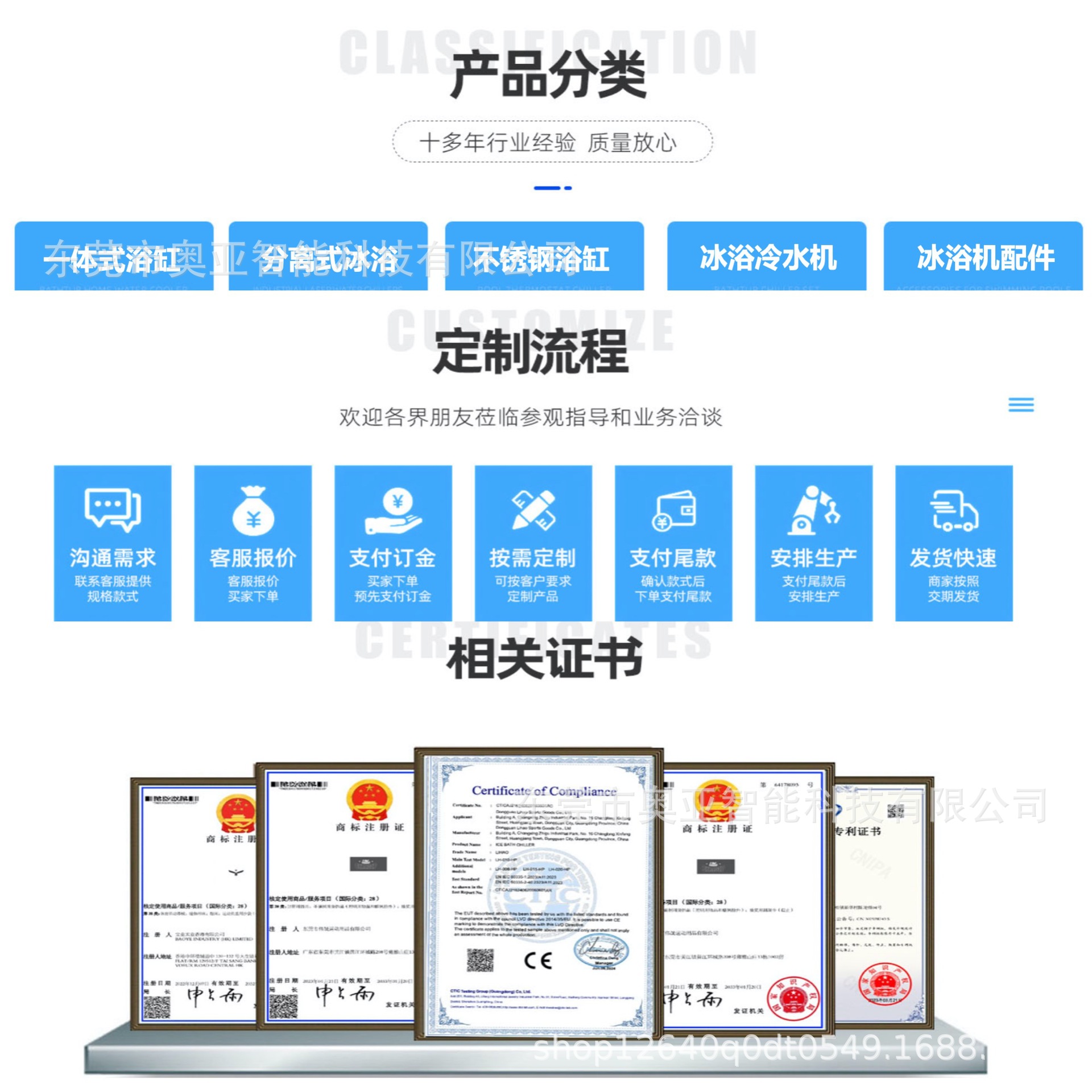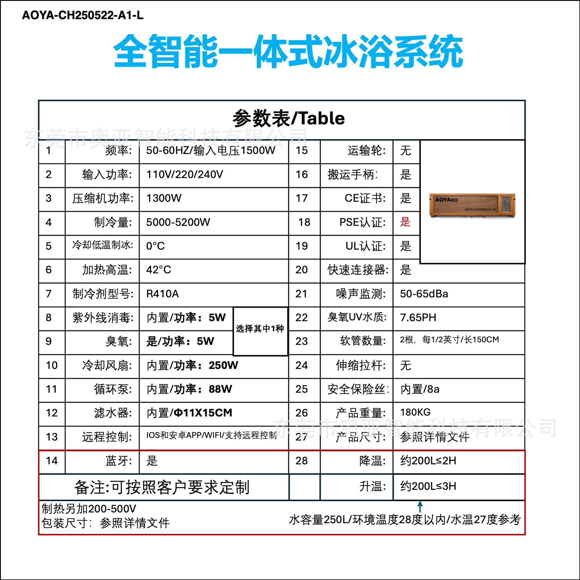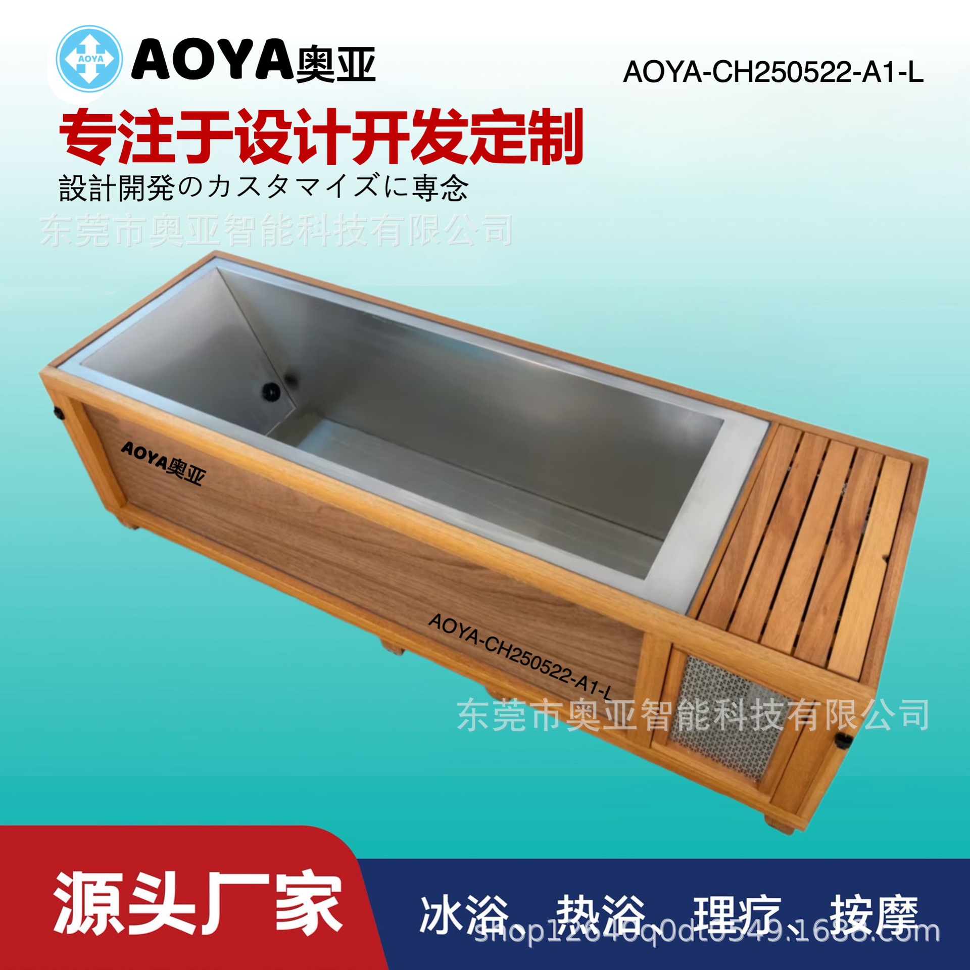 东莞市奥亚智能科技有限公司,主要开发设计运动员专用冰浴制冷设备浴缸,浴缸主要进口原木和不锈钢316材质组合合成,内部具有完善的冷却制冰系统,和低温水质循环系统,包括电压控制系统,手机控制系统和水质优化系统,完全按照运动员需求设计,