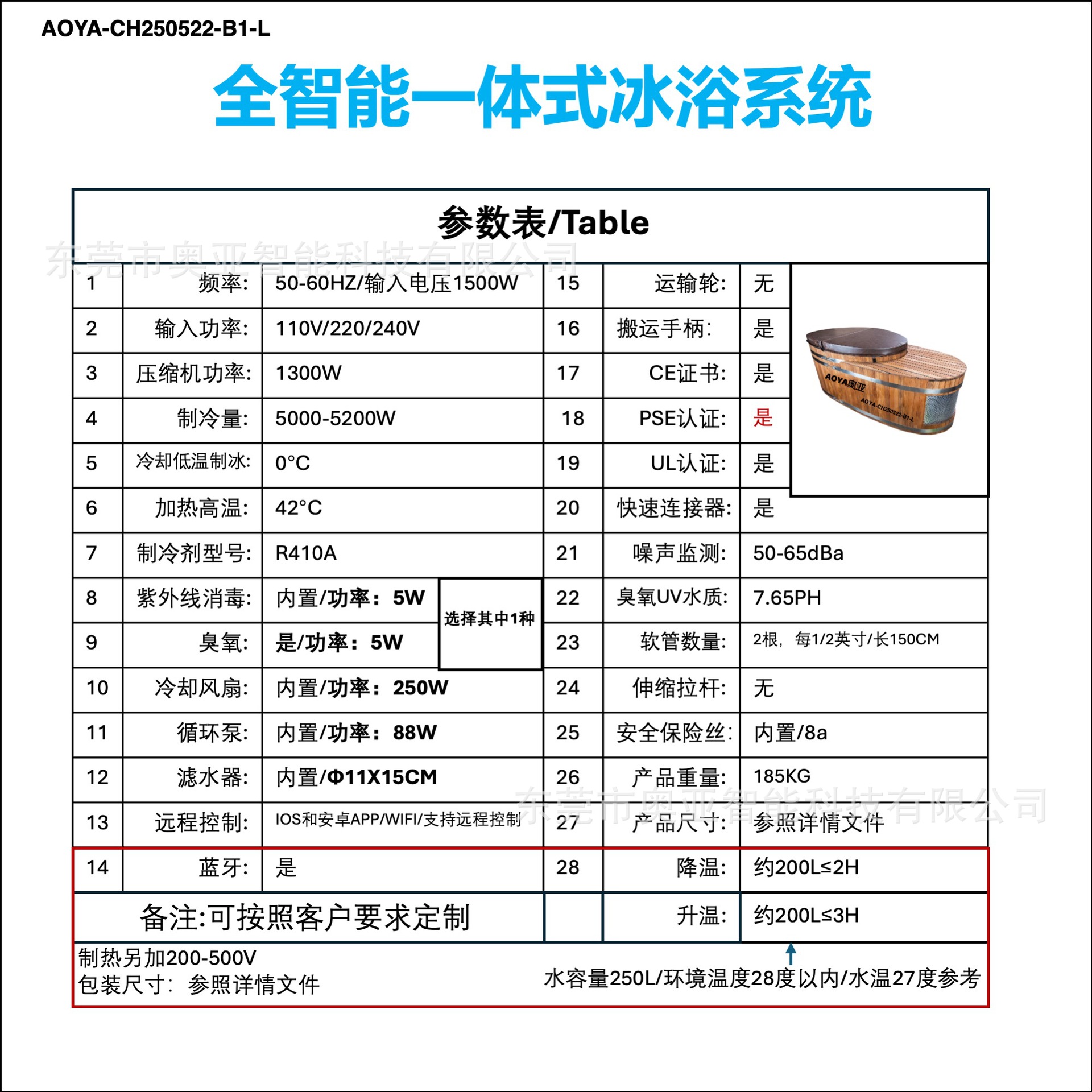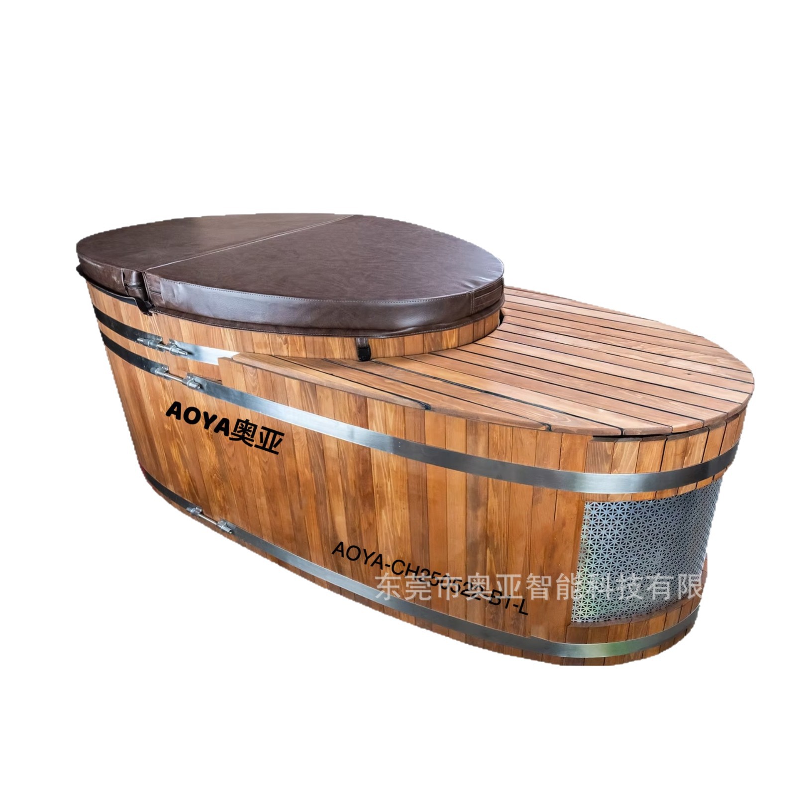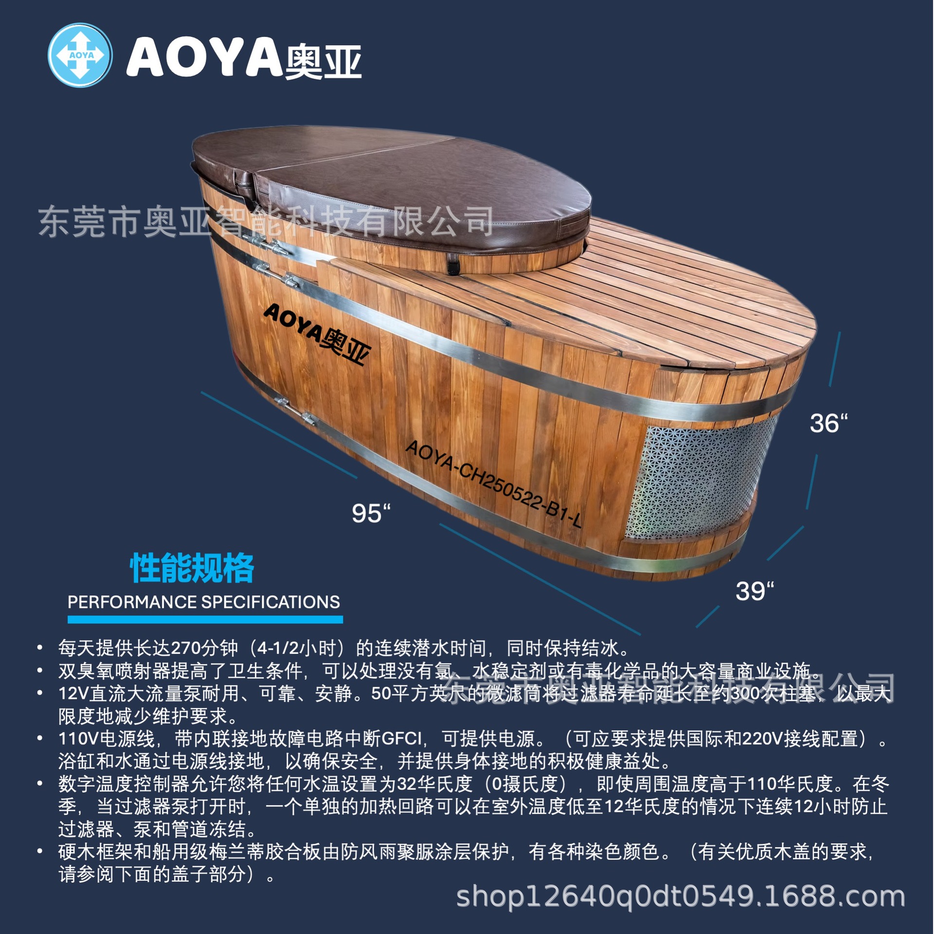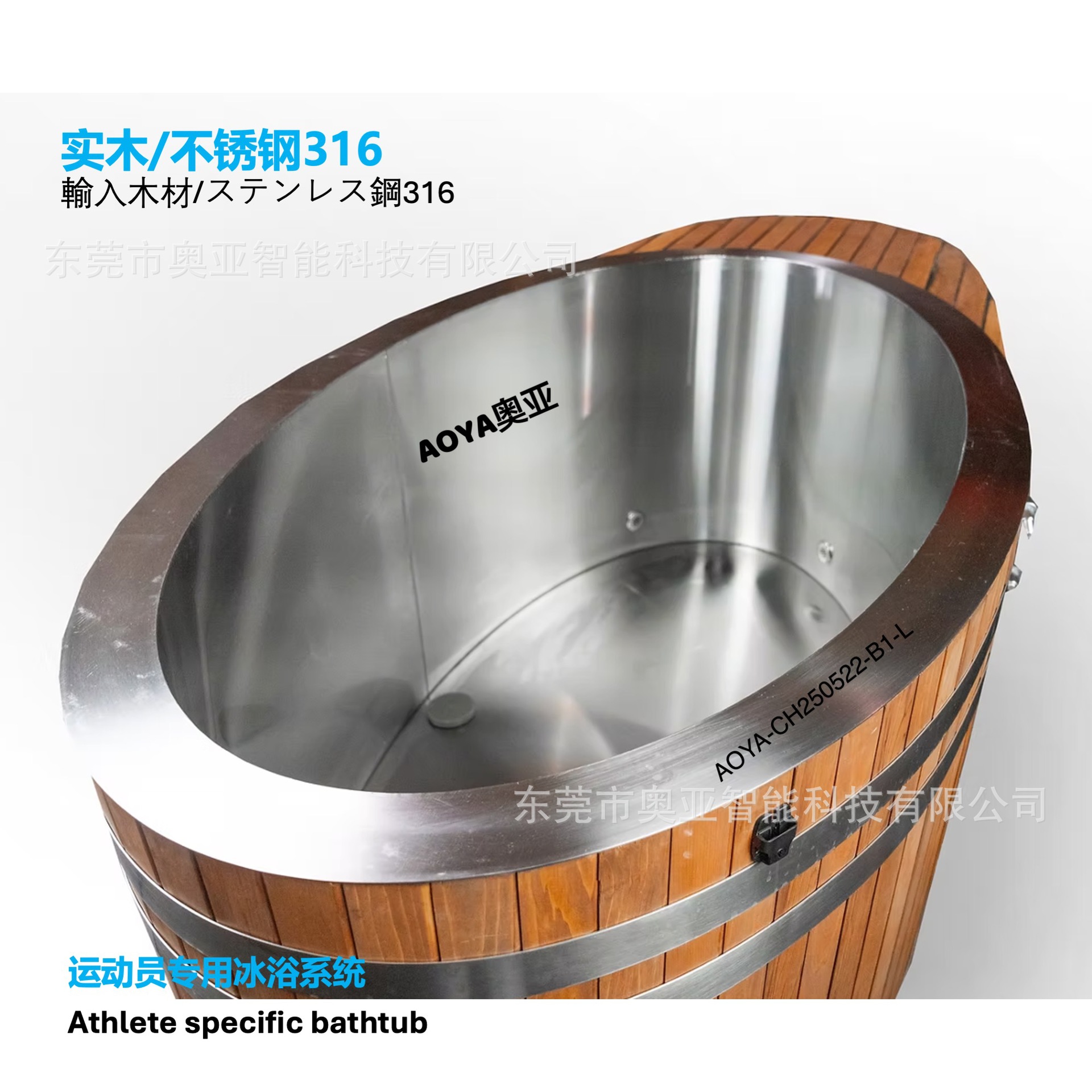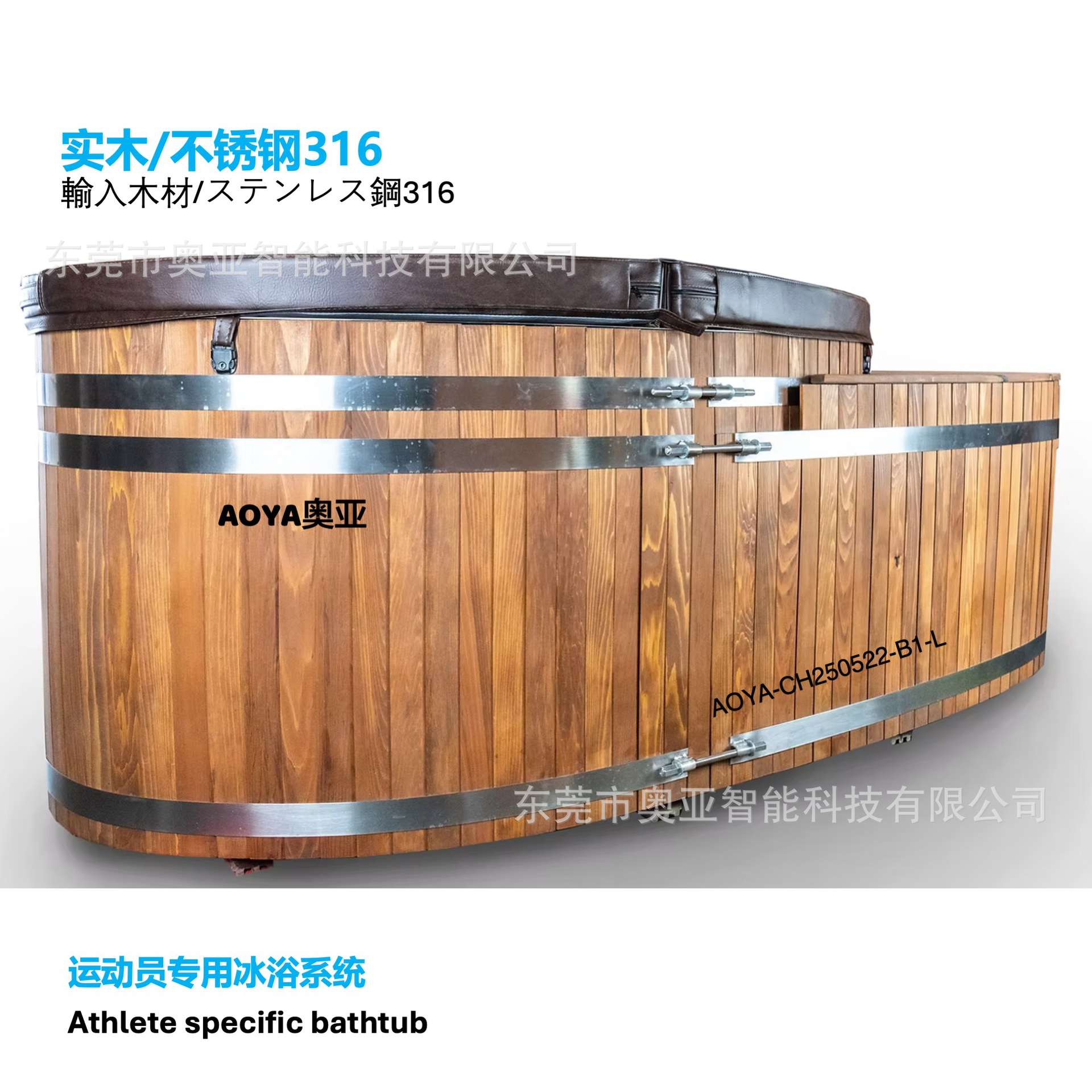 东莞市奥亚智能科技有限公司,主要开发设计运动员专用冰浴制冷设备浴缸,浴缸主要进口原木和不锈钢316材质组合合成,内部具有完善的冷却制冰系统,和低温水质循环系统,包括电压控制系统,手机控制系统和水质优化系统,完全按照运动员需求设计,