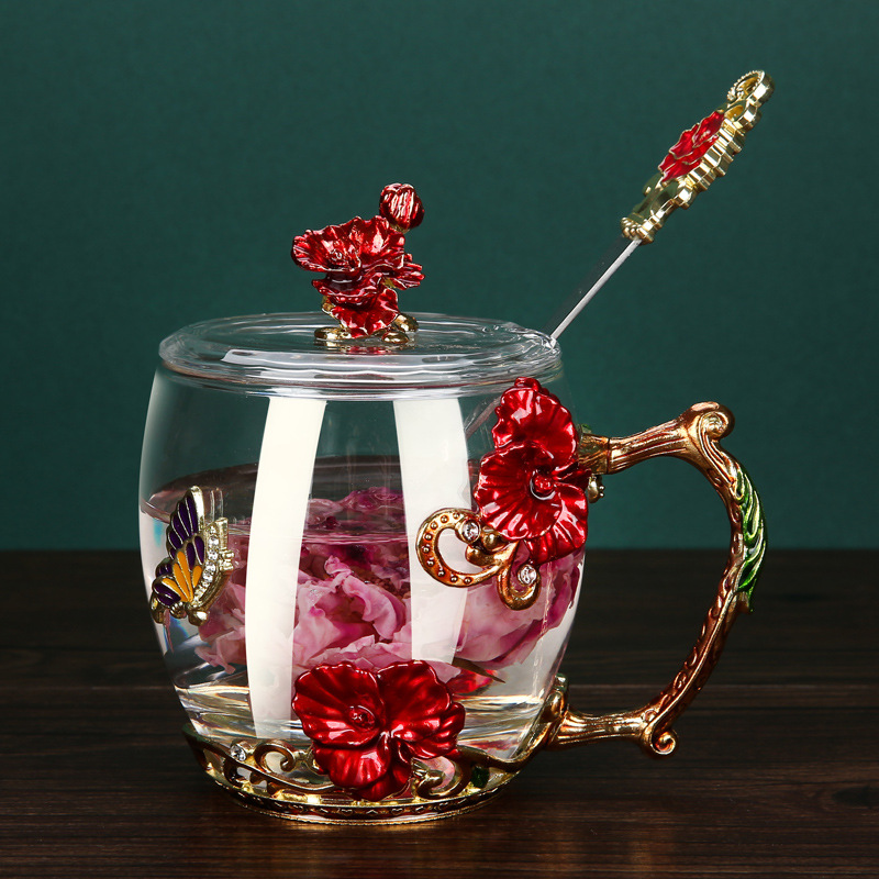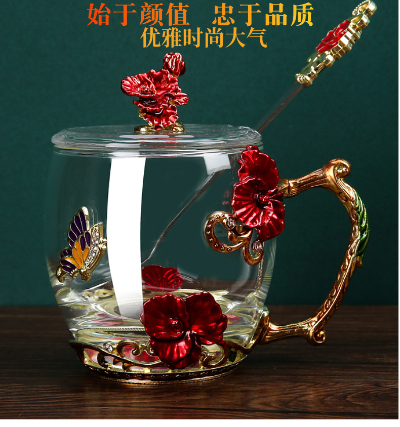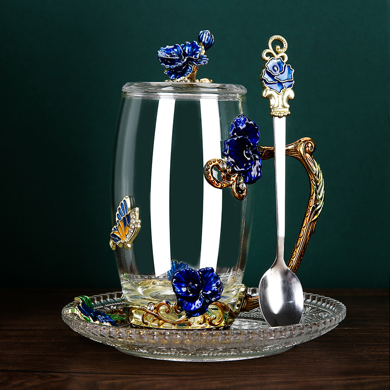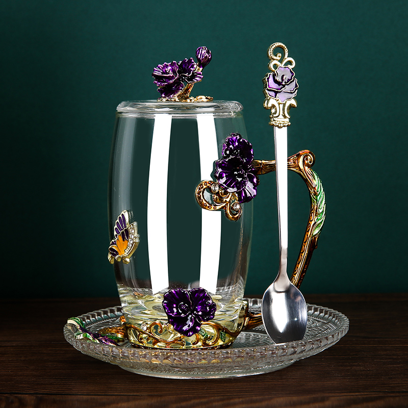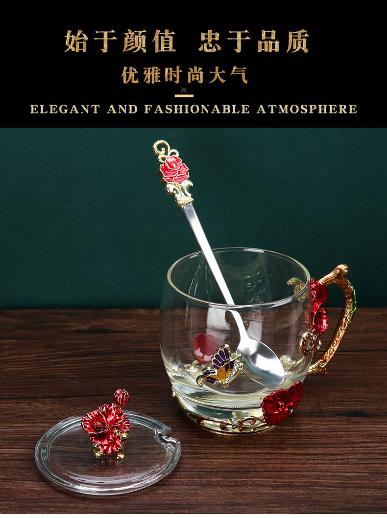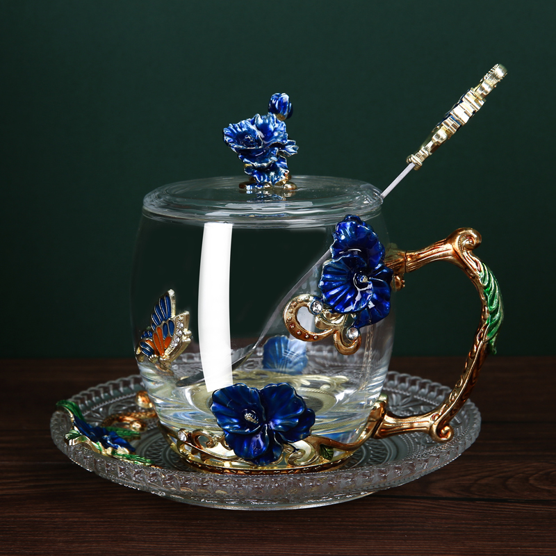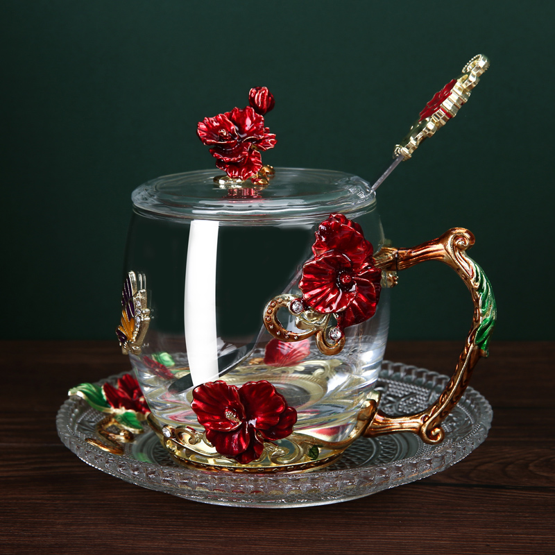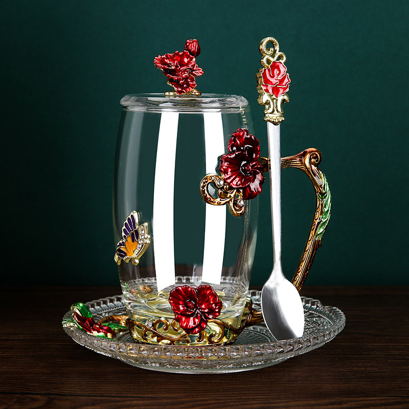 Эмалированная чашка для воды, бытовая стеклянная кофейная чашка, милая женская летняя чашка для чая с цветком, чашка для завтрака, чашка для чая с крышкой, набор