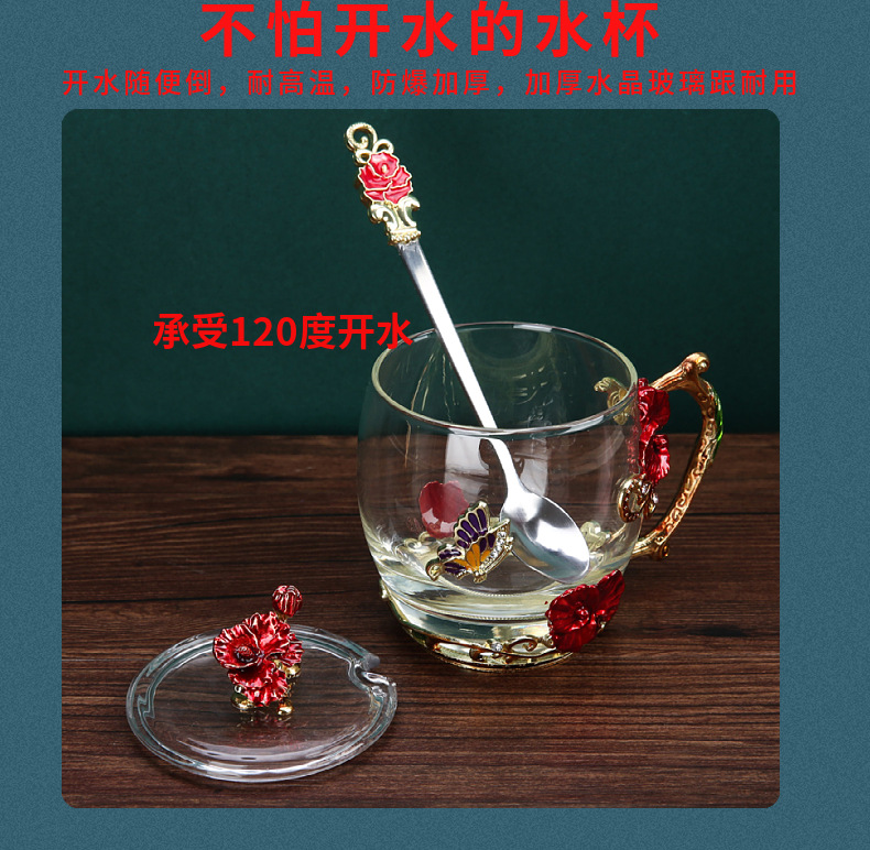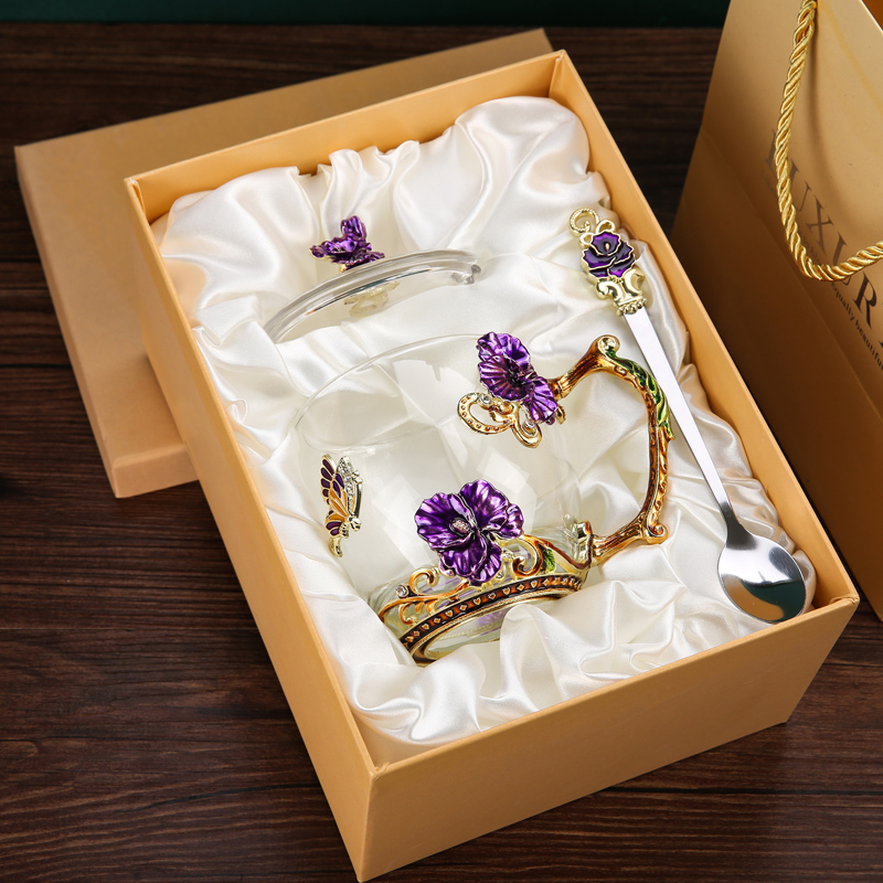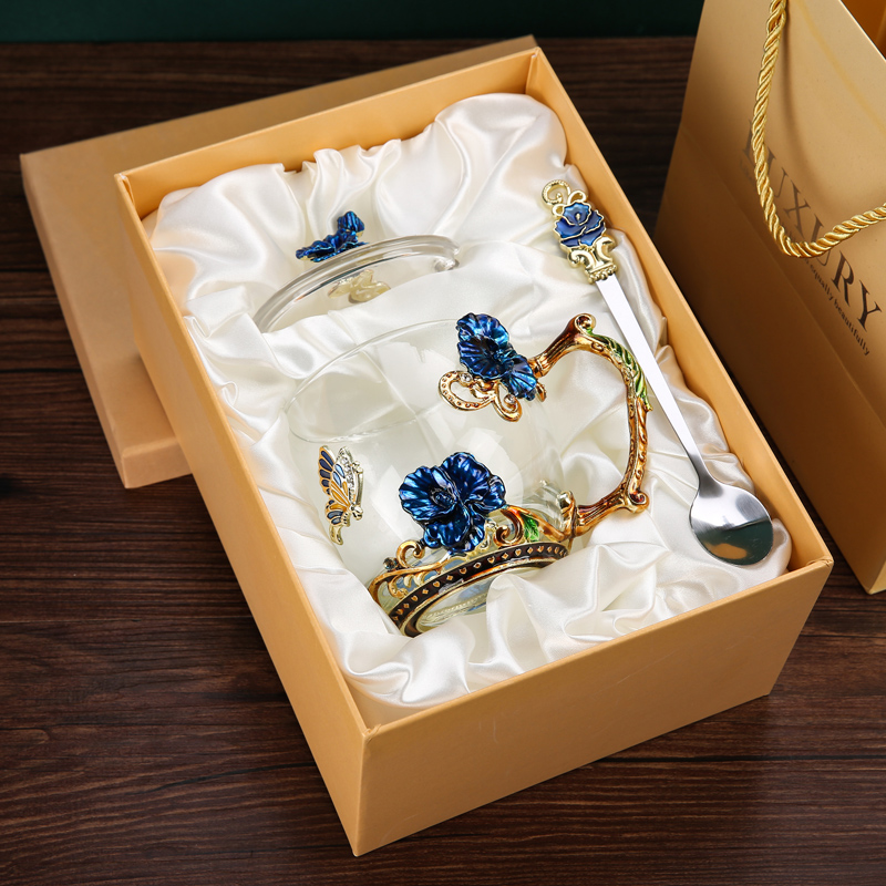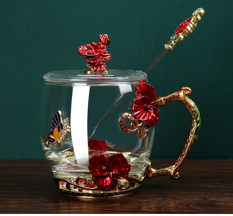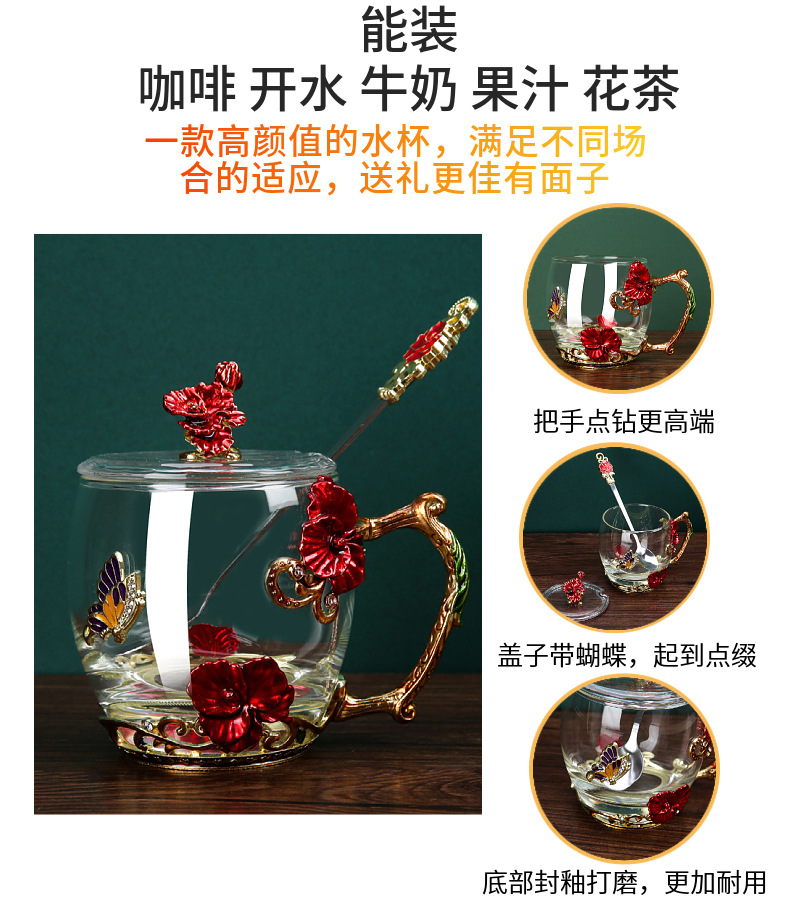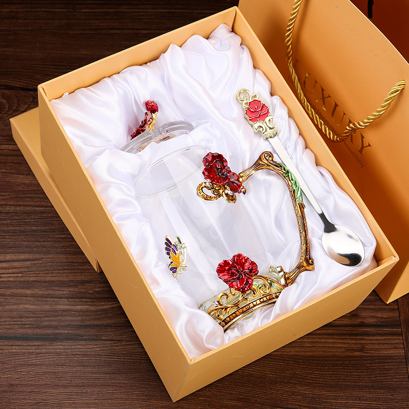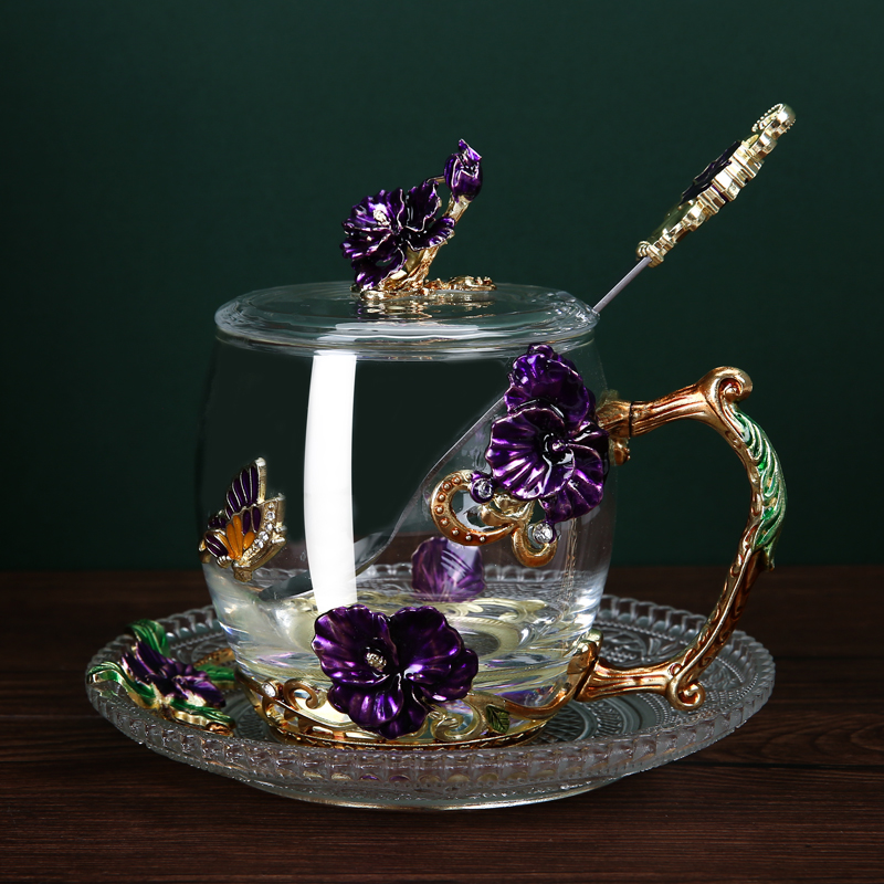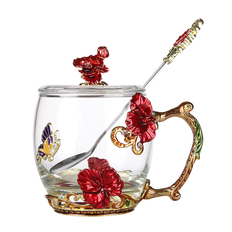 Эмалированная чашка для воды, бытовая стеклянная кофейная чашка, милая женская летняя чашка для чая с цветком, чашка для завтрака, чашка для чая с крышкой, набор