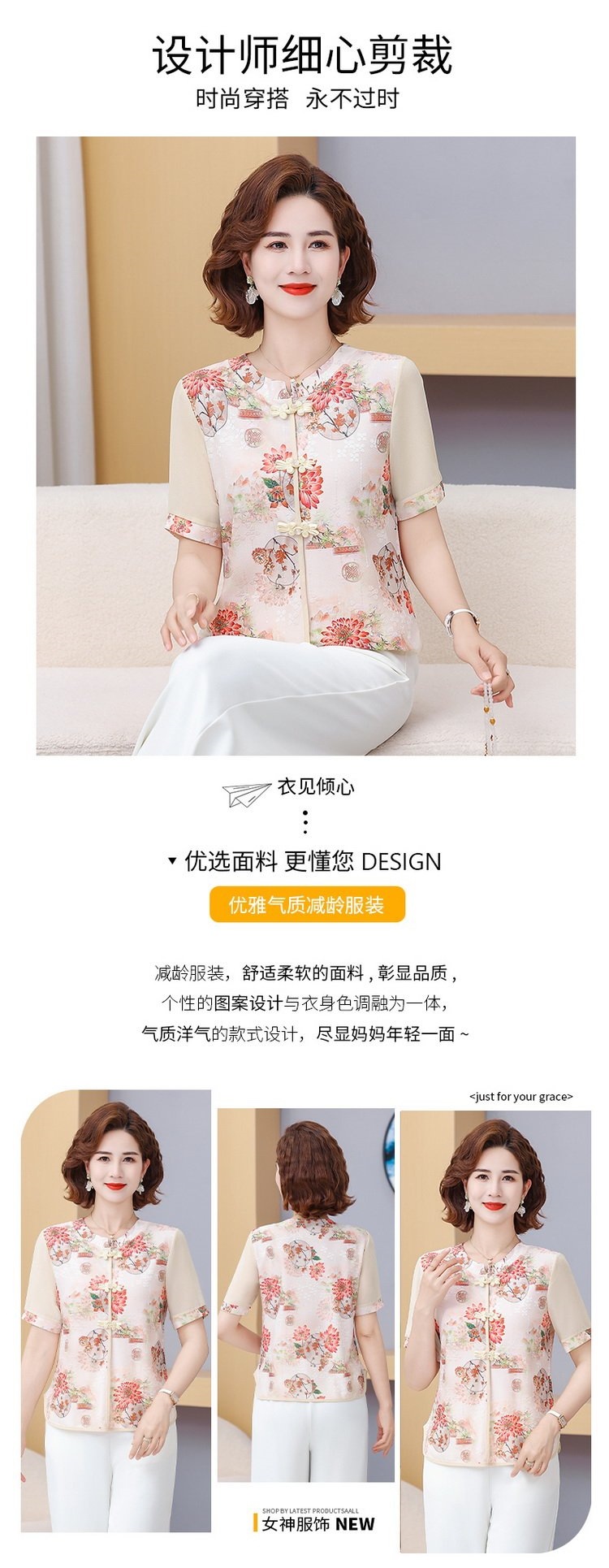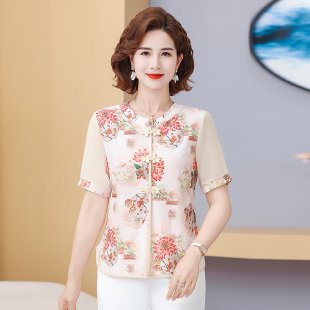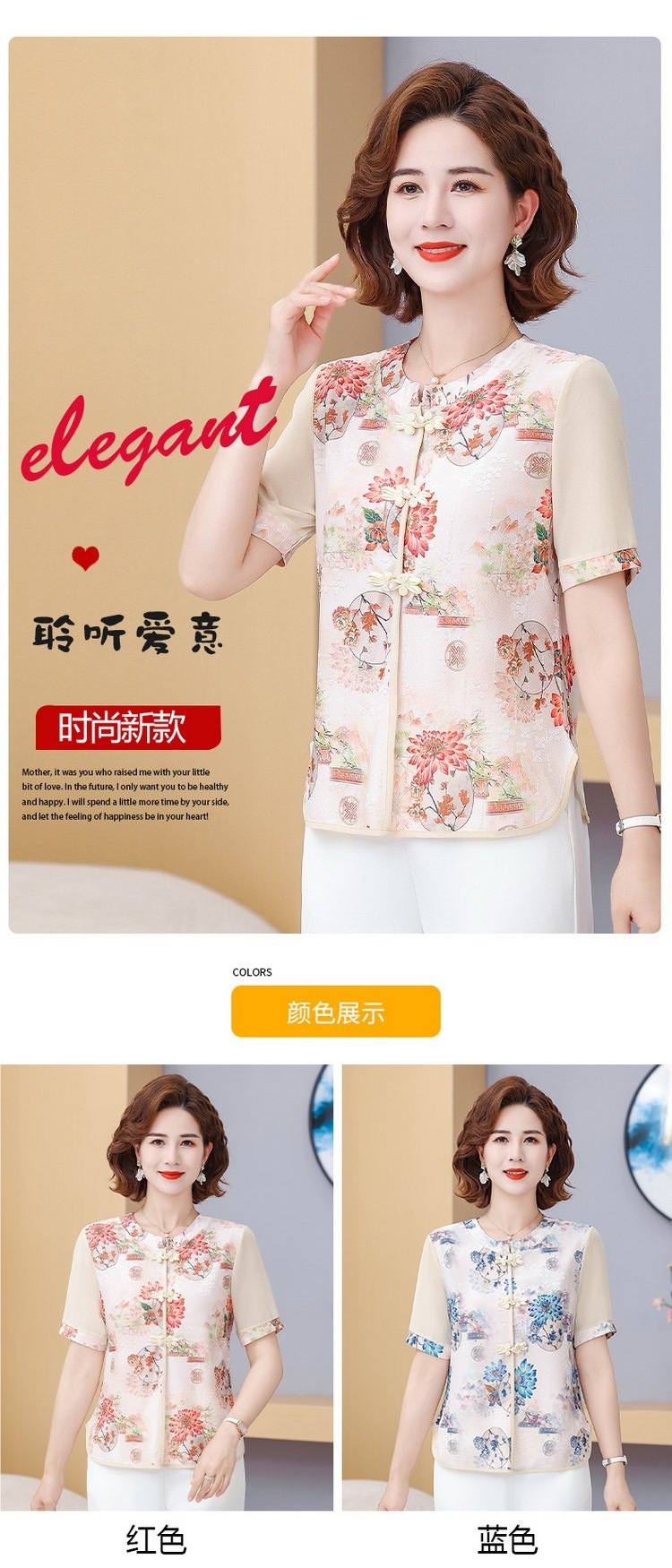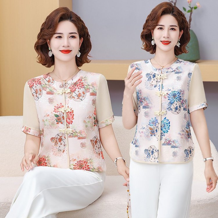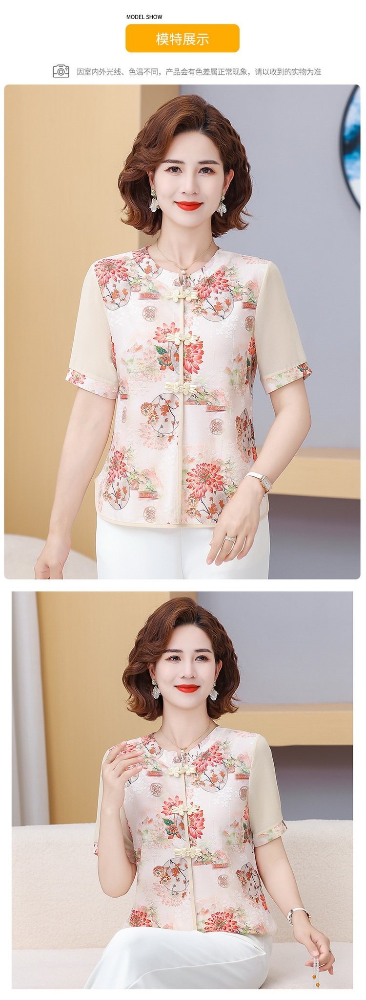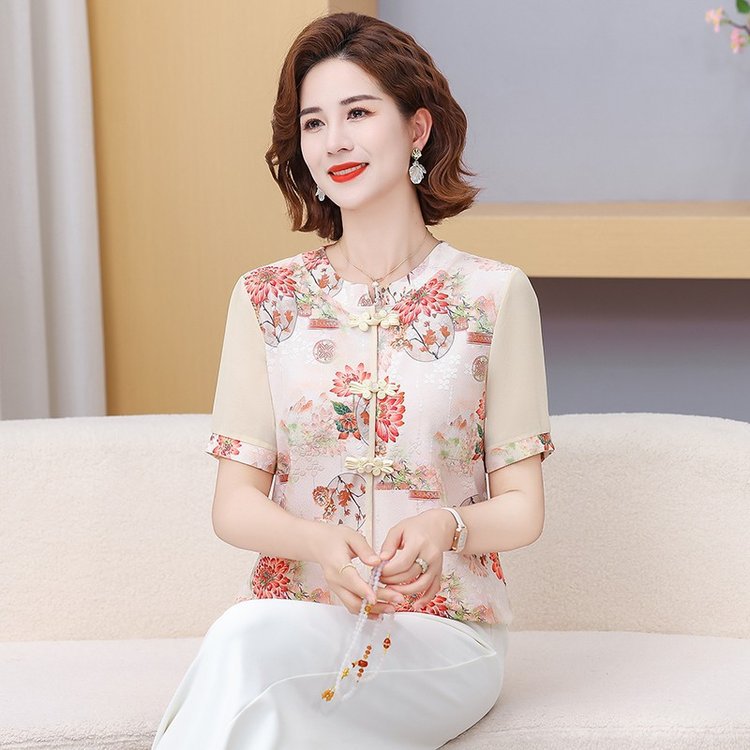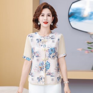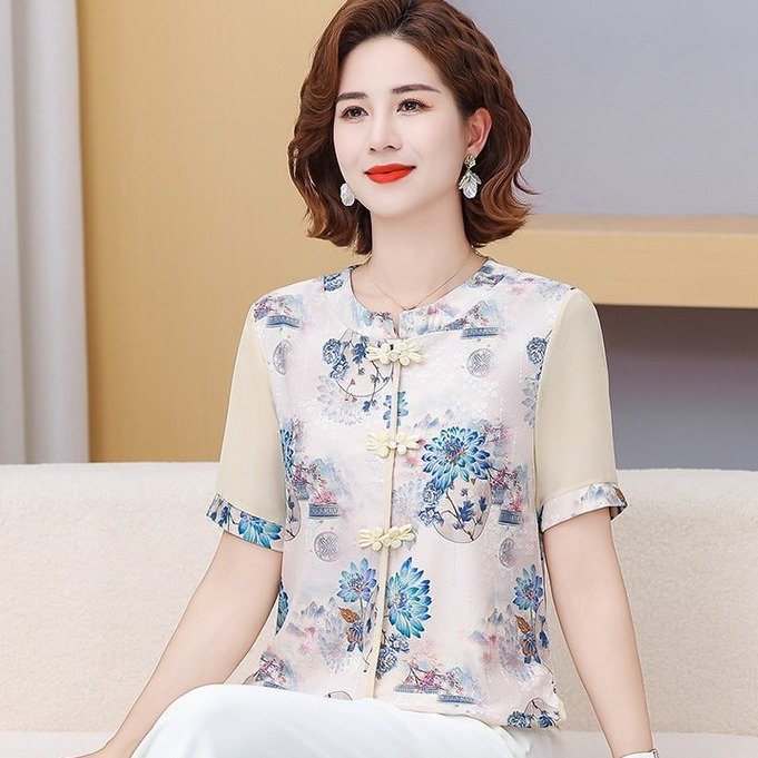 Летние топы 2025 года для мам, новые блузки с лацканами, цветочные шифоновые рубашки, короткие рукава для женщин среднего и пожилого возраста, топы в западном стиле