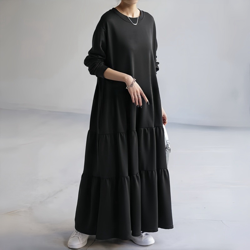 Японский нишевый дизайн, свободное платье-свитшот средней длины в стиле пэчворк с рюшами по подолу, длинное платье выше колена с длинными рукавами