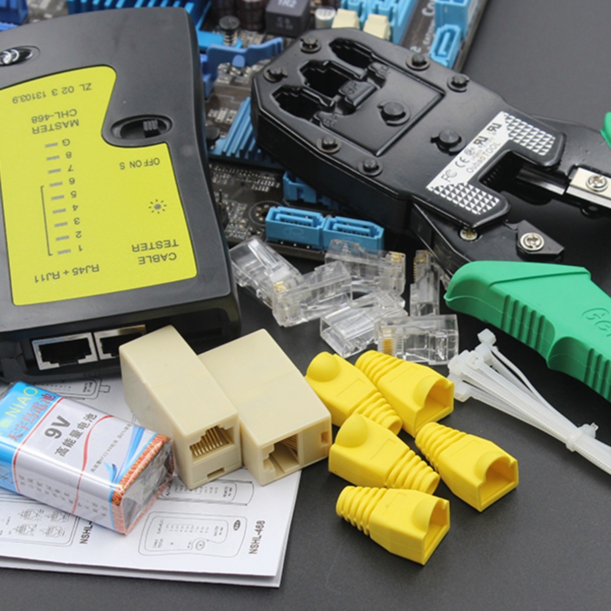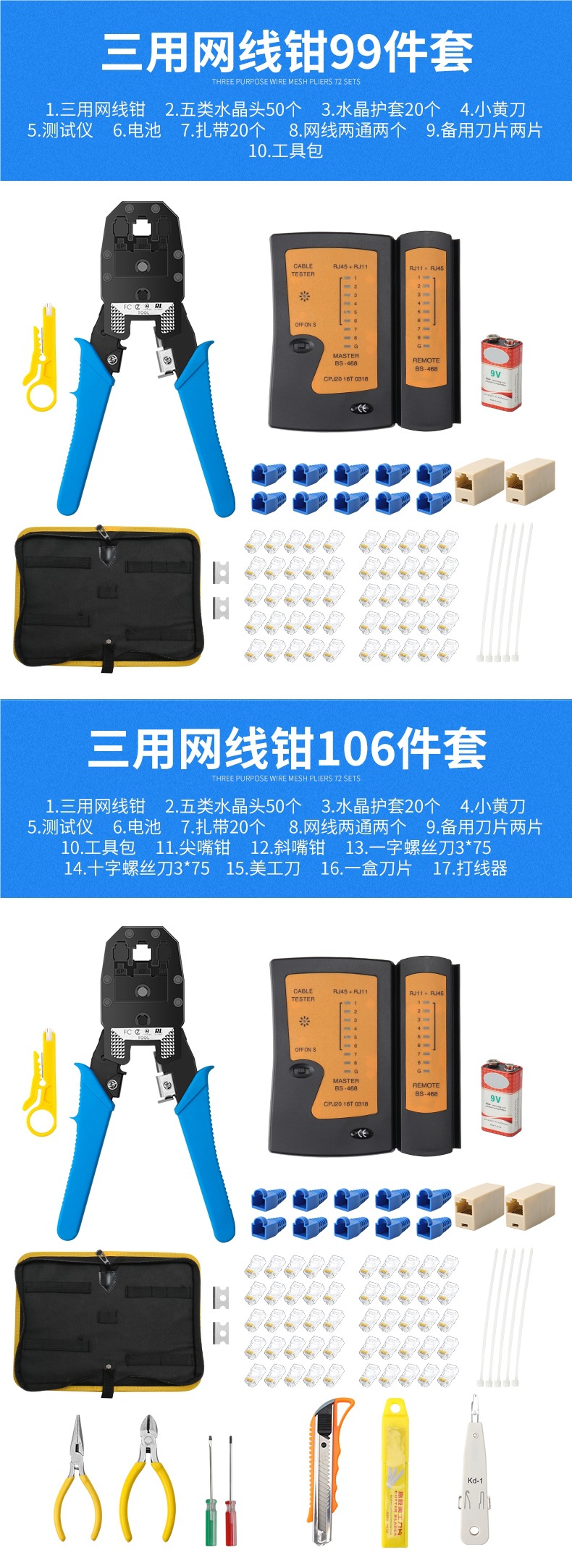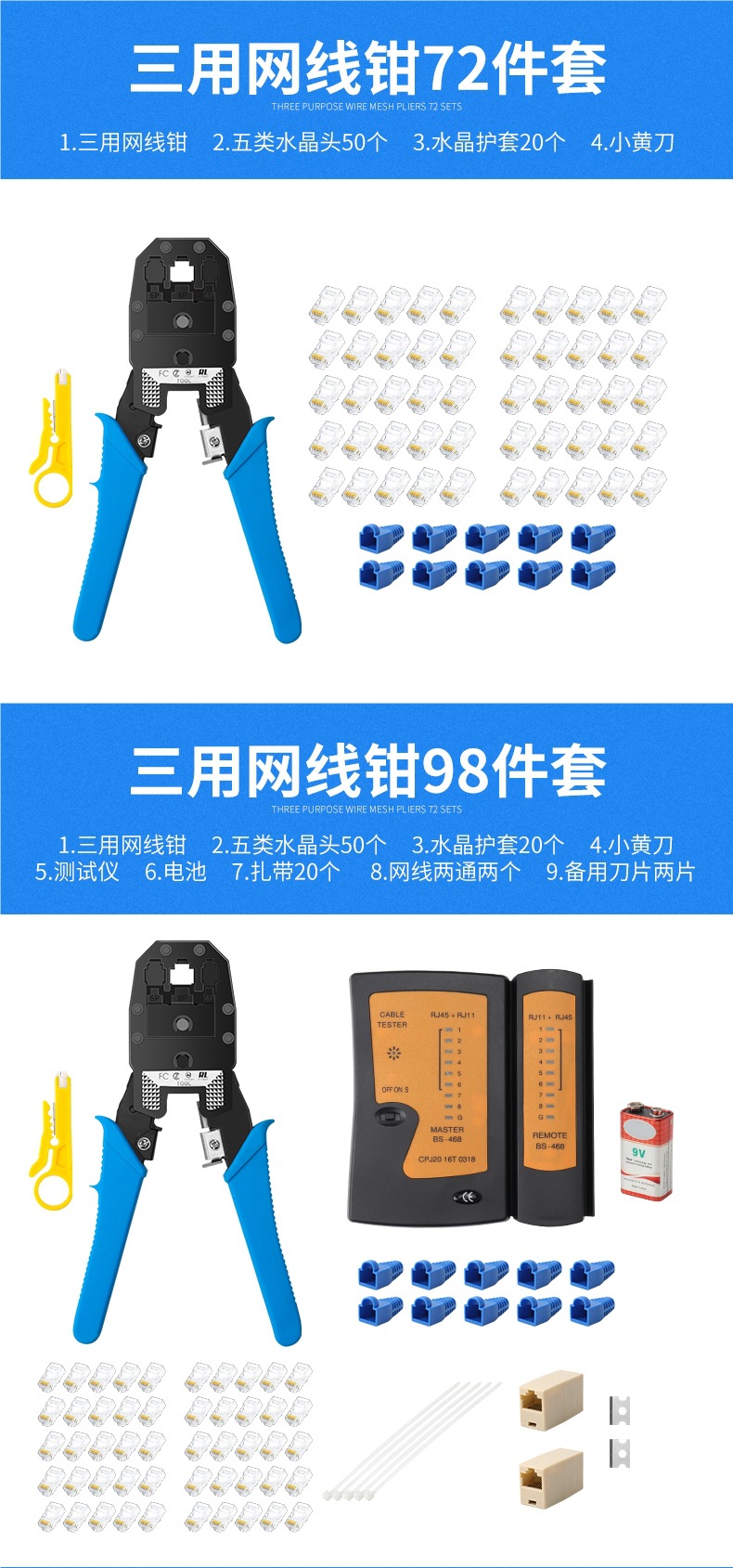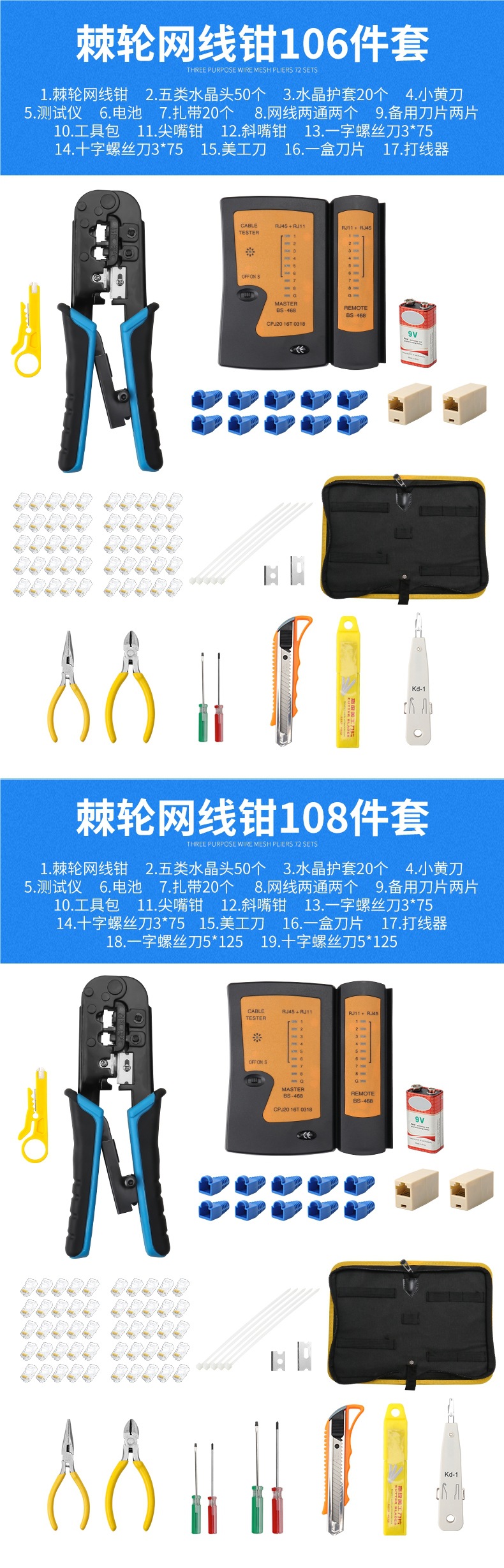 Акция - 1 тройное кусачки для сетевых кабелей (без подарков); Трехцелевые клещи для сетевых кабелей + 10 кристаллических головок (набор из 12 шт.); Трехцелевые клещи для сетевых кабелей + 50 кристаллических головок + 20 оболочек (набор из 72 предметов); Трехцелевые клещи для сетевых кабелей (набор из 98 предметов), рекомендованные для ежедневного домашнего использования.; Трехцелевые клещи для сетевых кабелей (набор из 99 предметов) с набором инструментов для ремонта; Трехцелевые клещи для сетевых кабелей (комплект из 106 штук) с набором инструментов для ремонта; Трехцелевые клещи для сетевых кабелей (комплект из 108 штук) с набором инструментов для ремонта; Плоскогубцы для сетевых кабелей с храповым механизмом + 10 кристаллических головок (набор из 12 шт.); Плоскогубцы для сетевых кабелей с храповым механизмом + 50 кристаллических головок + 20 оболочек (набор из 72 предметов); Плоскогубцы для сетевых кабелей с храповым механизмом (набор из 98 предметов), рекомендованные для ежедневного домашнего использования.; Плоскогубцы для сетевых кабелей с храповым механизмом (набор из 99 предметов) с сумкой для инструментов для ремонта; Плоскогубцы для сетевых кабелей с храповым механизмом (набор из 106 шт.) с сумкой для инструментов для ремонта; Плоскогубцы для сетевых кабелей с храповым механизмом (набор из 108 шт.) с набором инструментов для ремонта; Перфорированные плоскогубцы для сетевых кабелей категории 6 + 10 перфорированных кристаллических головок (набор из 12 шт.); Перфорированные плоскогубцы для сетевых кабелей категории 6 (набор из 34 шт.); Перфорированные клещи для сетевых кабелей категории 6 (набор из 57 предметов); Клещи для сетевых кабелей категории 7 + нож для зачистки проводов + крестовая отвертка (набор из 3 предметов); Клещи для сетевых кабелей категории 7 + 10 кристаллических головок + 10 оболочек + нож для зачистки проводов + крестовая отвертка (набор из 23 предметов); Клещи для сетевых кабелей категории 7 (набор из 25 шт.); Клещи для сетевых кабелей категории 7 (набор из 48 шт.); тестер
