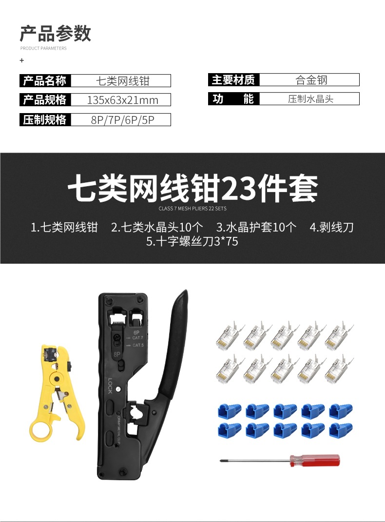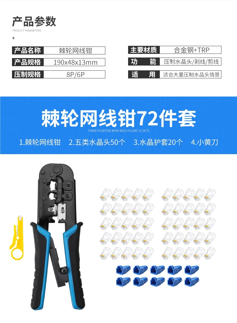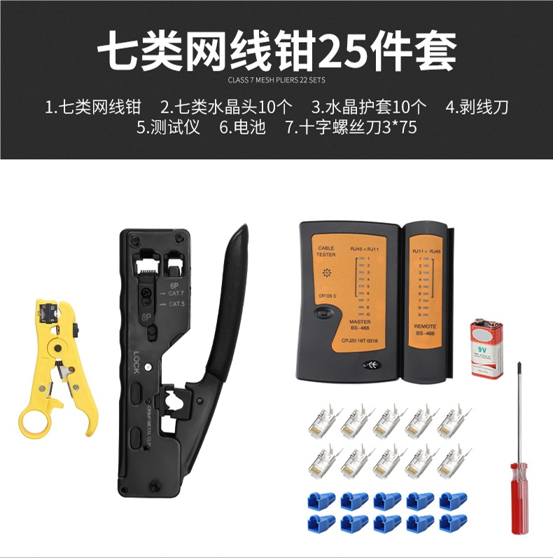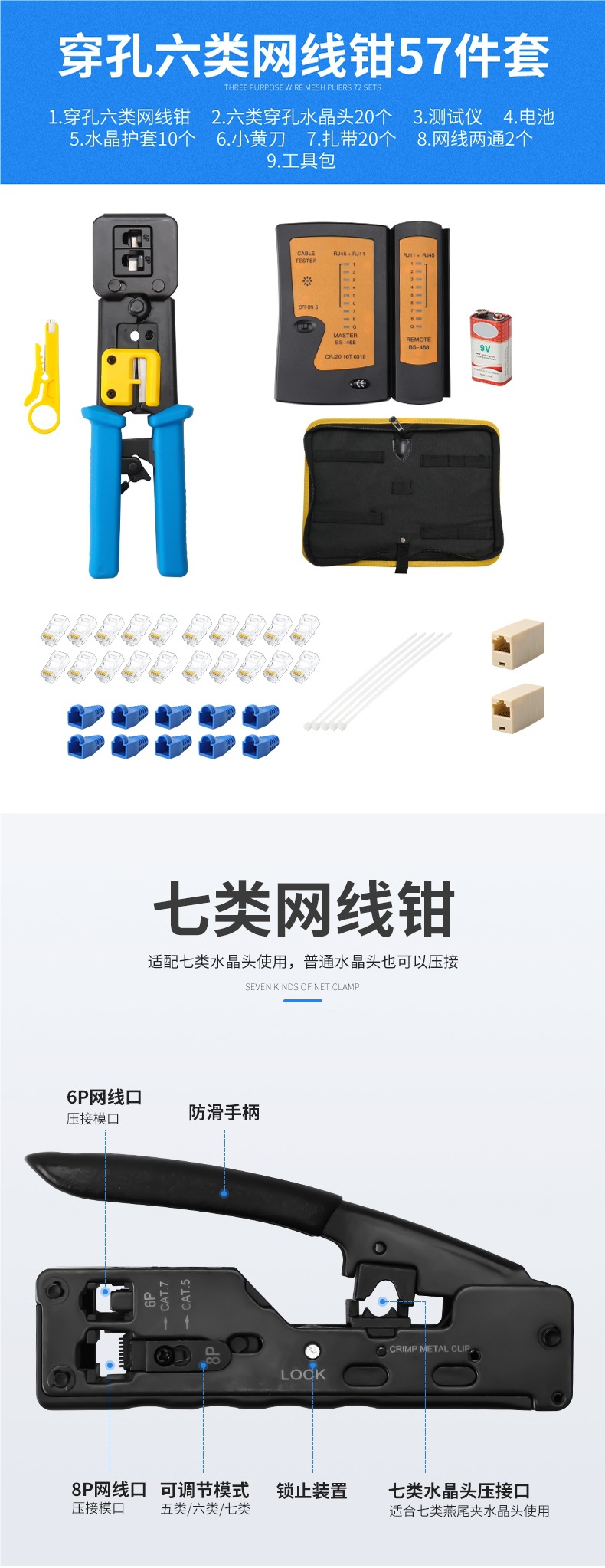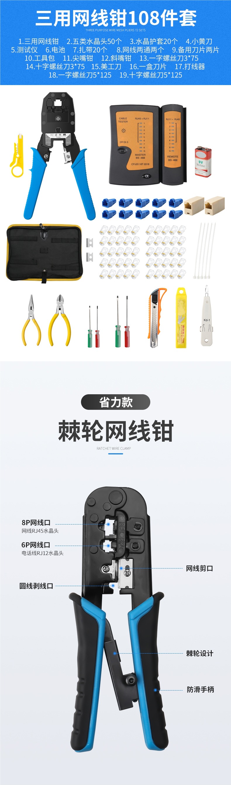 Акция - 1 тройное кусачки для сетевых кабелей (без подарков); Трехцелевые клещи для сетевых кабелей + 10 кристаллических головок (набор из 12 шт.); Трехцелевые клещи для сетевых кабелей + 50 кристаллических головок + 20 оболочек (набор из 72 предметов); Трехцелевые клещи для сетевых кабелей (набор из 98 предметов), рекомендованные для ежедневного домашнего использования.; Трехцелевые клещи для сетевых кабелей (набор из 99 предметов) с набором инструментов для ремонта; Трехцелевые клещи для сетевых кабелей (комплект из 106 штук) с набором инструментов для ремонта; Трехцелевые клещи для сетевых кабелей (комплект из 108 штук) с набором инструментов для ремонта; Плоскогубцы для сетевых кабелей с храповым механизмом + 10 кристаллических головок (набор из 12 шт.); Плоскогубцы для сетевых кабелей с храповым механизмом + 50 кристаллических головок + 20 оболочек (набор из 72 предметов); Плоскогубцы для сетевых кабелей с храповым механизмом (набор из 98 предметов), рекомендованные для ежедневного домашнего использования.; Плоскогубцы для сетевых кабелей с храповым механизмом (набор из 99 предметов) с сумкой для инструментов для ремонта; Плоскогубцы для сетевых кабелей с храповым механизмом (набор из 106 шт.) с сумкой для инструментов для ремонта; Плоскогубцы для сетевых кабелей с храповым механизмом (набор из 108 шт.) с набором инструментов для ремонта; Перфорированные плоскогубцы для сетевых кабелей категории 6 + 10 перфорированных кристаллических головок (набор из 12 шт.); Перфорированные плоскогубцы для сетевых кабелей категории 6 (набор из 34 шт.); Перфорированные клещи для сетевых кабелей категории 6 (набор из 57 предметов); Клещи для сетевых кабелей категории 7 + нож для зачистки проводов + крестовая отвертка (набор из 3 предметов); Клещи для сетевых кабелей категории 7 + 10 кристаллических головок + 10 оболочек + нож для зачистки проводов + крестовая отвертка (набор из 23 предметов); Клещи для сетевых кабелей категории 7 (набор из 25 шт.); Клещи для сетевых кабелей категории 7 (набор из 48 шт.); тестер
