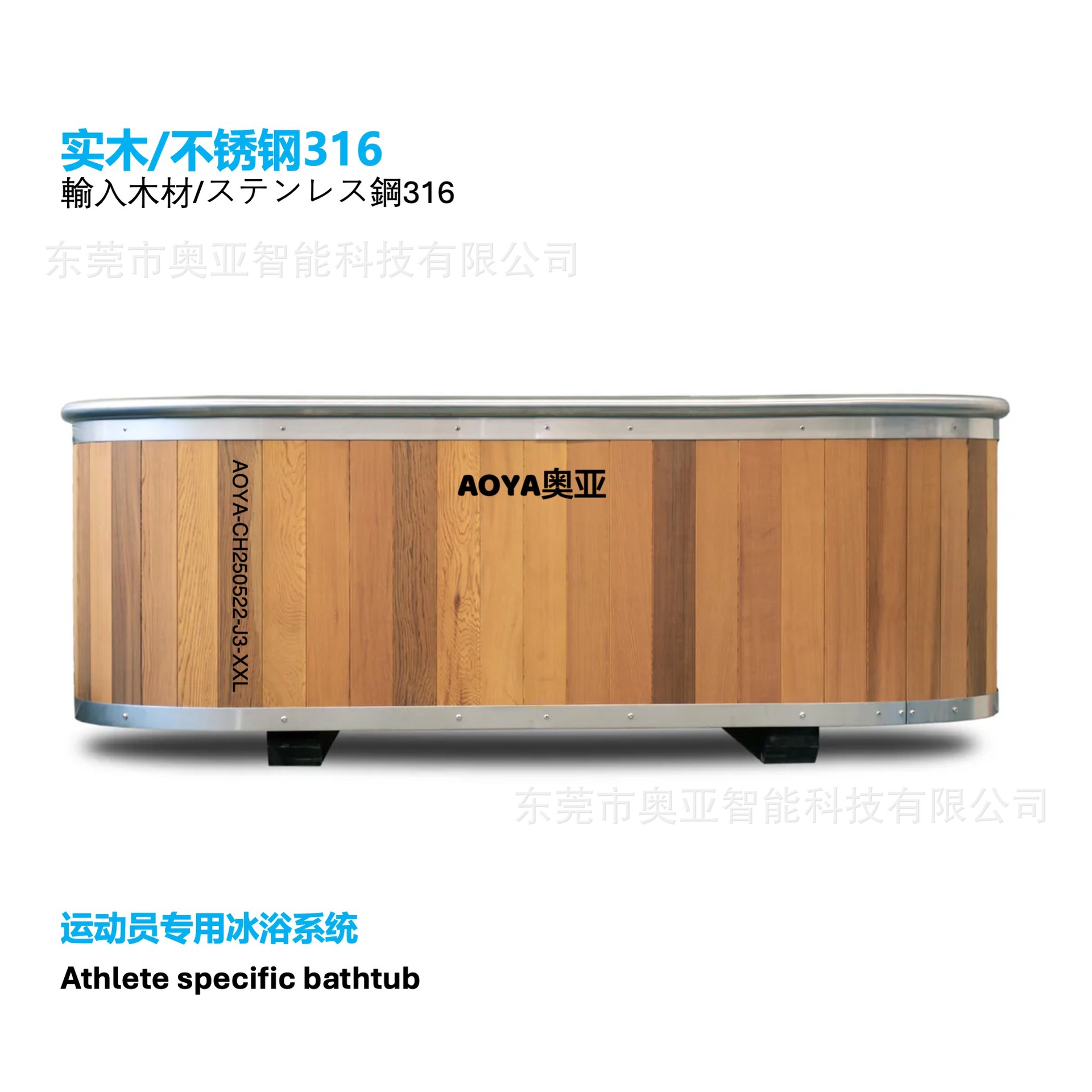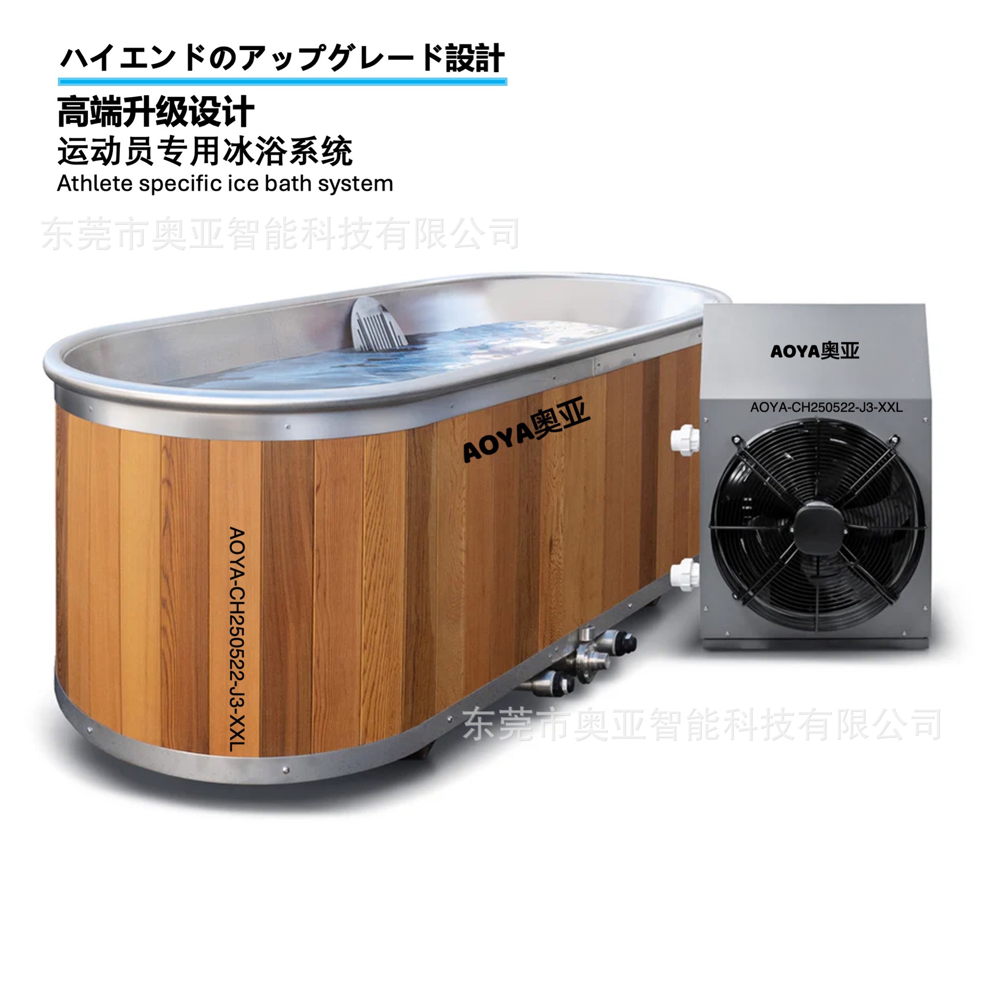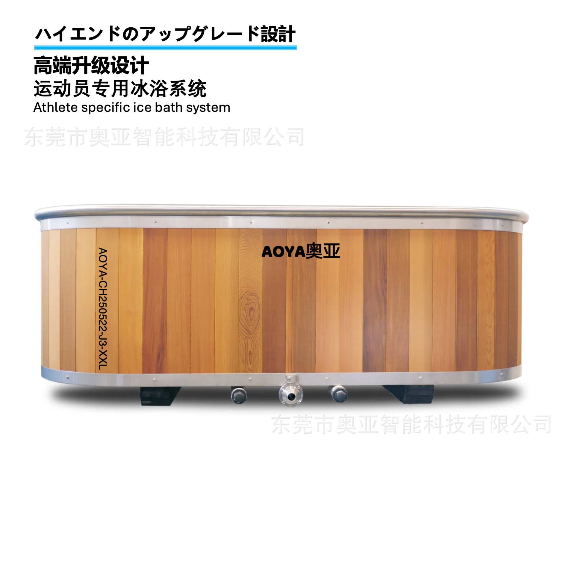 东莞市奥亚智能科技有限公司,主要开发设计运动员专用冰浴制冷设备浴缸,浴缸主要进口原木和不锈钢316材质组合合成,内部具有完善的冷却制冰系统,和低温水质循环系统,包括电压控制系统,手机控制系统和水质优化系统,完全按照运动员需求设计,
