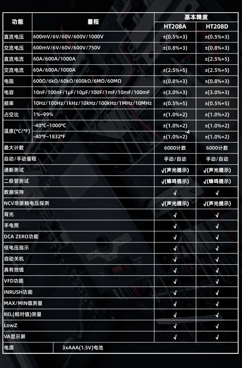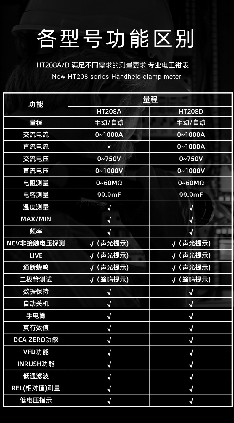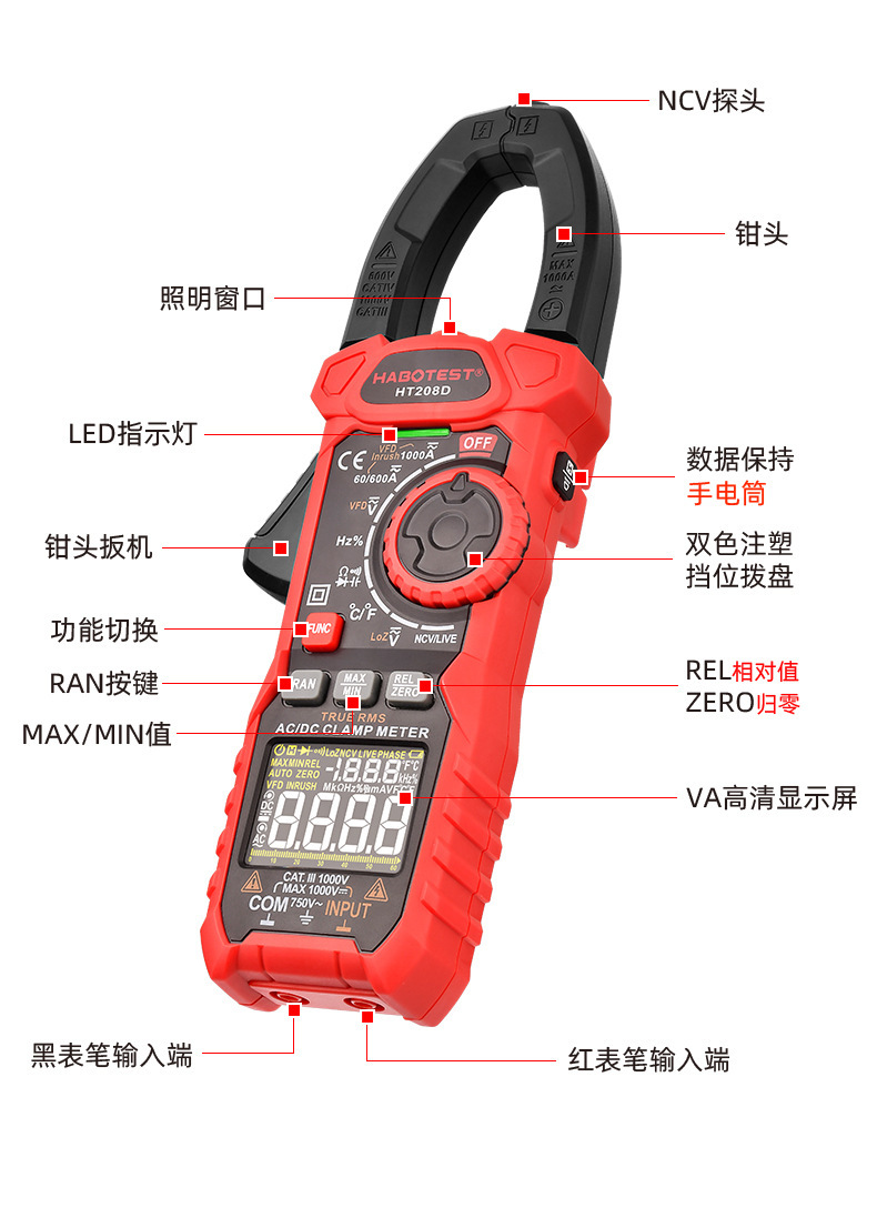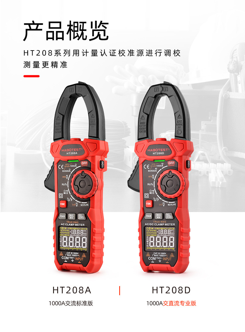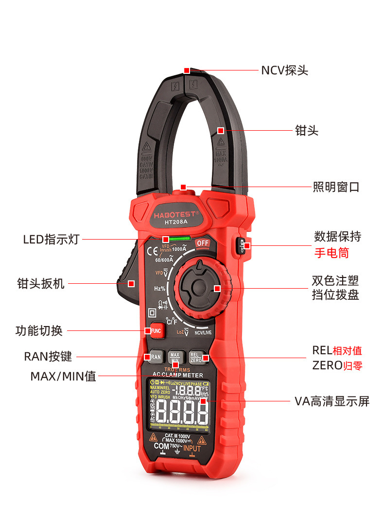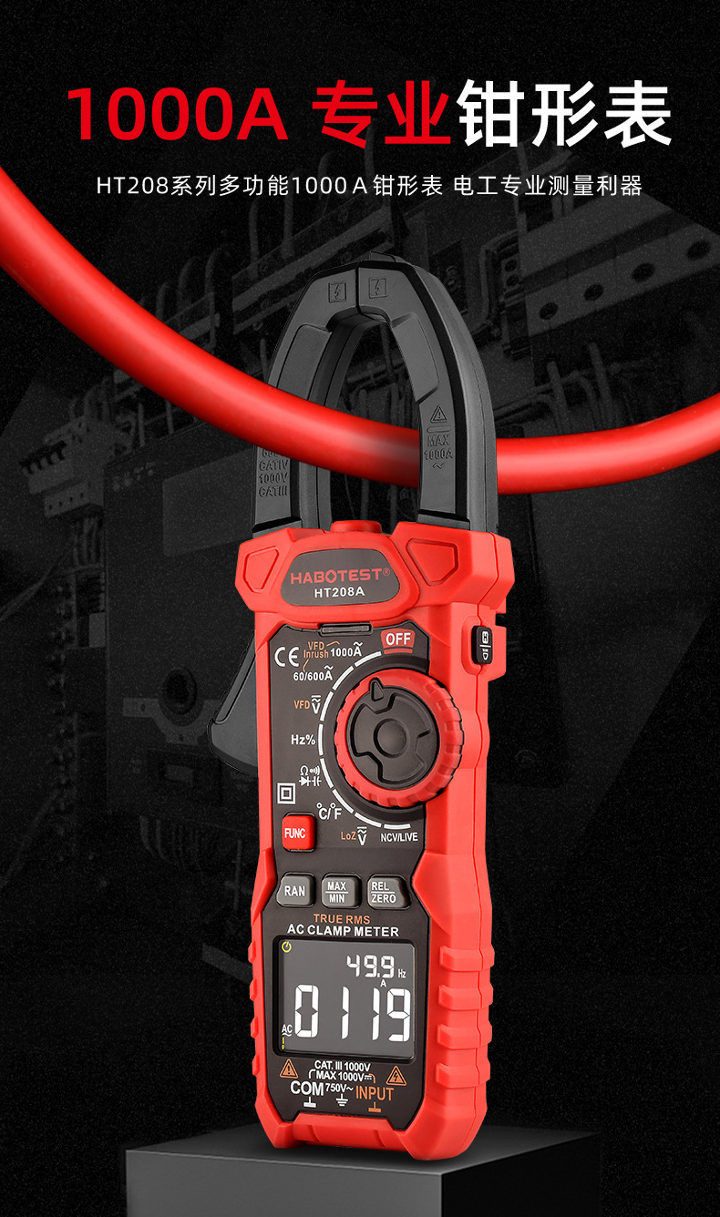 HT208A高精度交直流数字1000A钳形电流表 多功能防烧万用表专业级