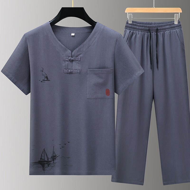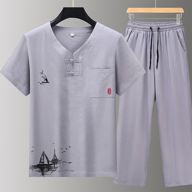 3826 Мужской костюм Ханфу в китайском стиле с короткими рукавами из хлопка и льна в стиле Тан с пуговицами.
