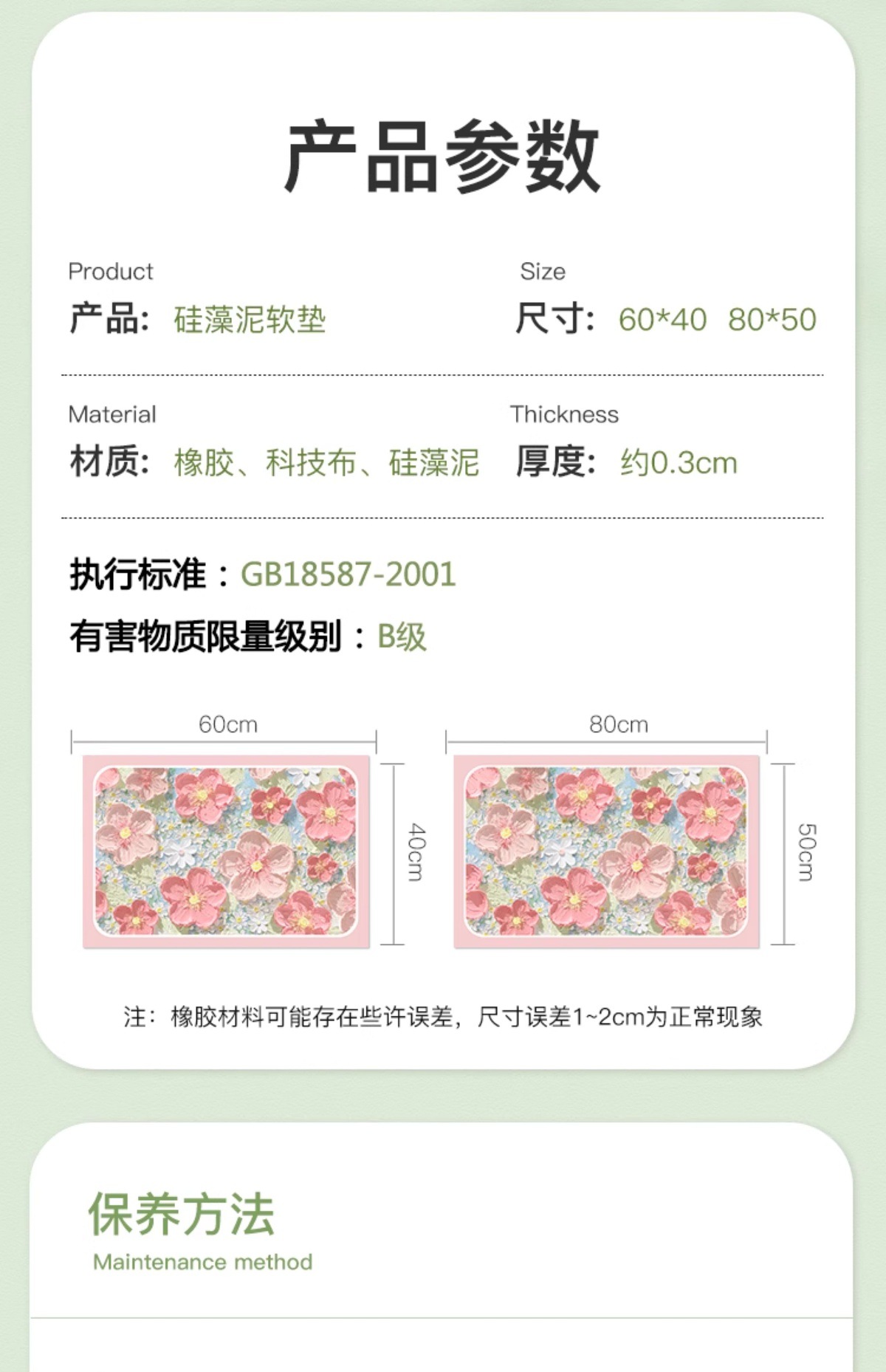 40*60 см [диатомовая глина – впитывает воду и предотвращает скольжение]; 50*80 см [диатомовая глина – впитывающая влагу и противоскользящая]; 60*90 см [диатомовая глина – впитывает воду и предотвращает скольжение]; 80*120 см [диатомовая грязь-водопоглощающая и противоскользящая]; Свяжитесь со службой поддержки клиентов для получения индивидуальных размеров