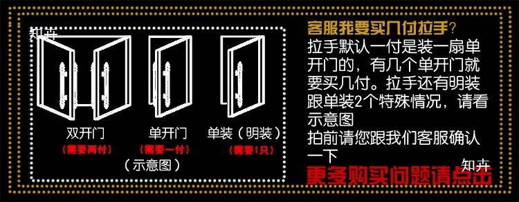 亲,购买的时候请注意,此拉手的价格为1付,只能安装一个单扇门,双开门(对开门)的就得用2付拉手来安装。有什么不明白之处请咨询客服。