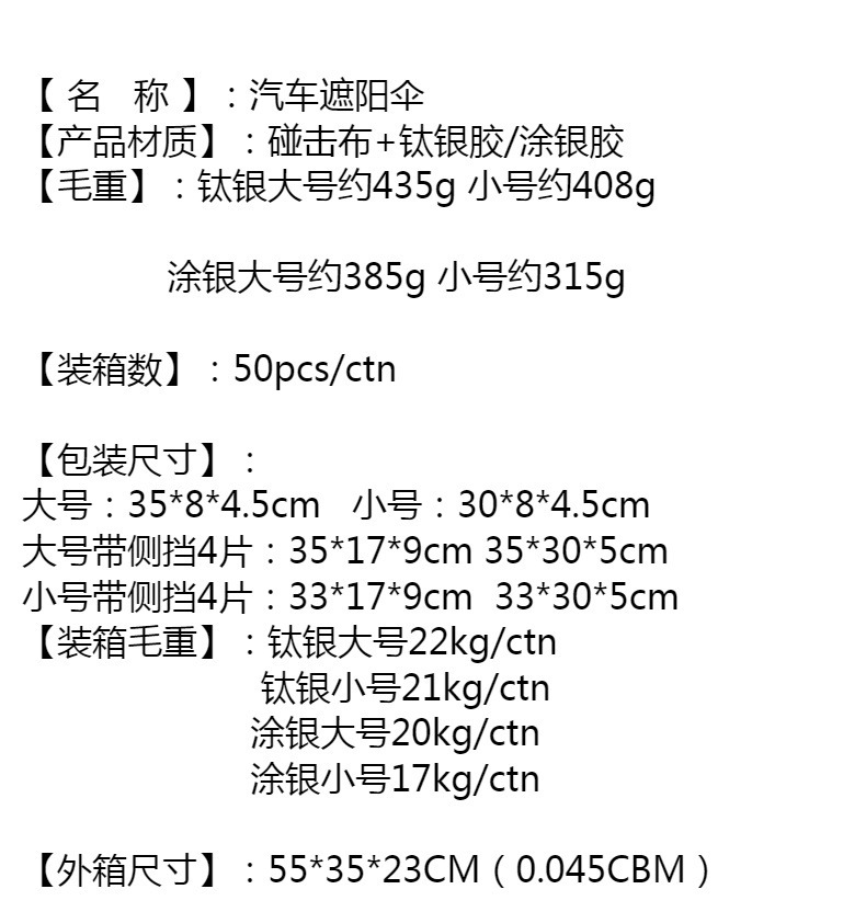 Маленький зонт от солнца из титанового серебра — в комплекте чехол для хранения.; Большой зонт от солнца из титанового серебра — в комплекте чехол для хранения.; Маленький зонт от солнца с серебряным покрытием — в комплект входит чехол для хранения.; Большой зонт от солнца с серебряным покрытием — в комплект входит чехол для хранения.; Маленький солнцезащитный козырек из титанового серебра — складная модель; Большой солнцезащитный козырек из титанового серебра — складная модель; Маленький солнцезащитный козырек с серебряным покрытием — складной стиль; Большой солнцезащитный козырек с серебряным покрытием — складной; Один предмет для основного водителя - виниловый электростатический солнцезащитный козырек.; Деталь легкового автомобиля - виниловый электростатический солнцезащитный козырек; Пара основных и пассажирских автомобилей - виниловые электростатические солнцезащитные шторки.; Одна деталь в заднем ряду - виниловый электростатический солнцезащитный козырек.; Пара в заднем ряду - виниловые электростатические солнцезащитные шторки.; 4 шт. на весь автомобиль - виниловый электростатический солнцезащитный козырек; Лазерная труба - солнцезащитный козырек; Лазерный большой размер - солнцезащитный козырек