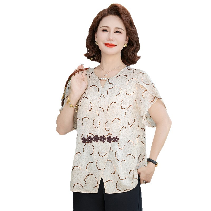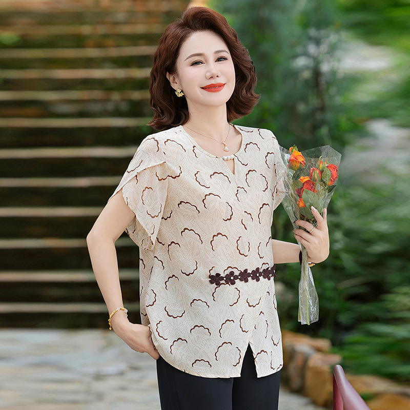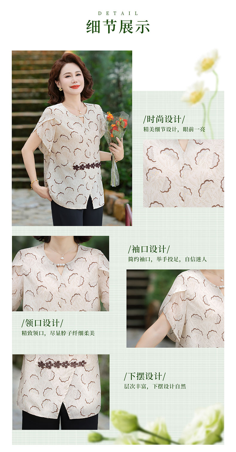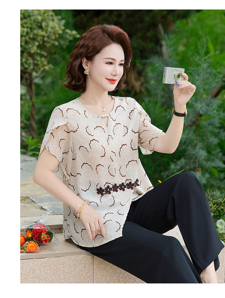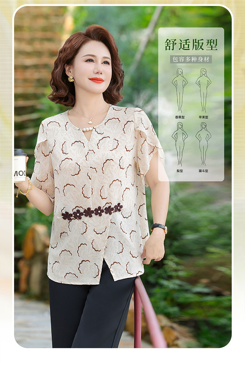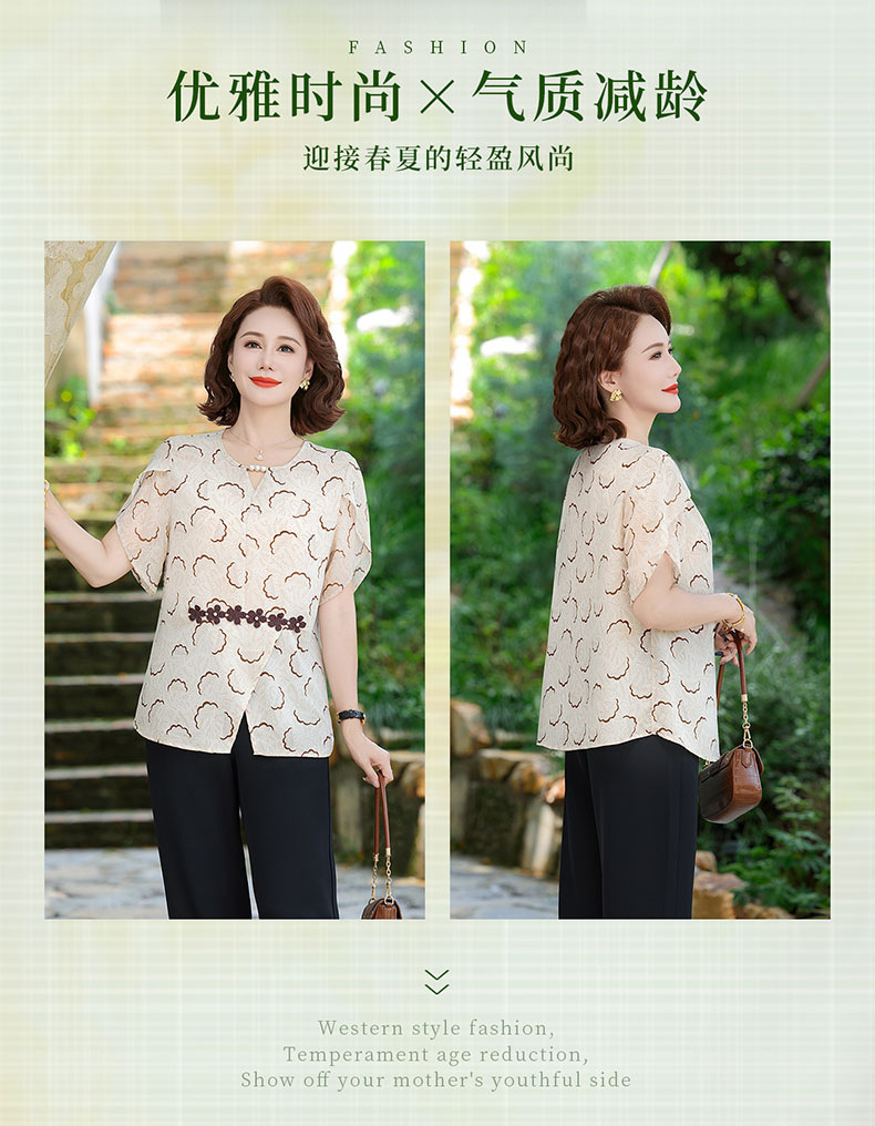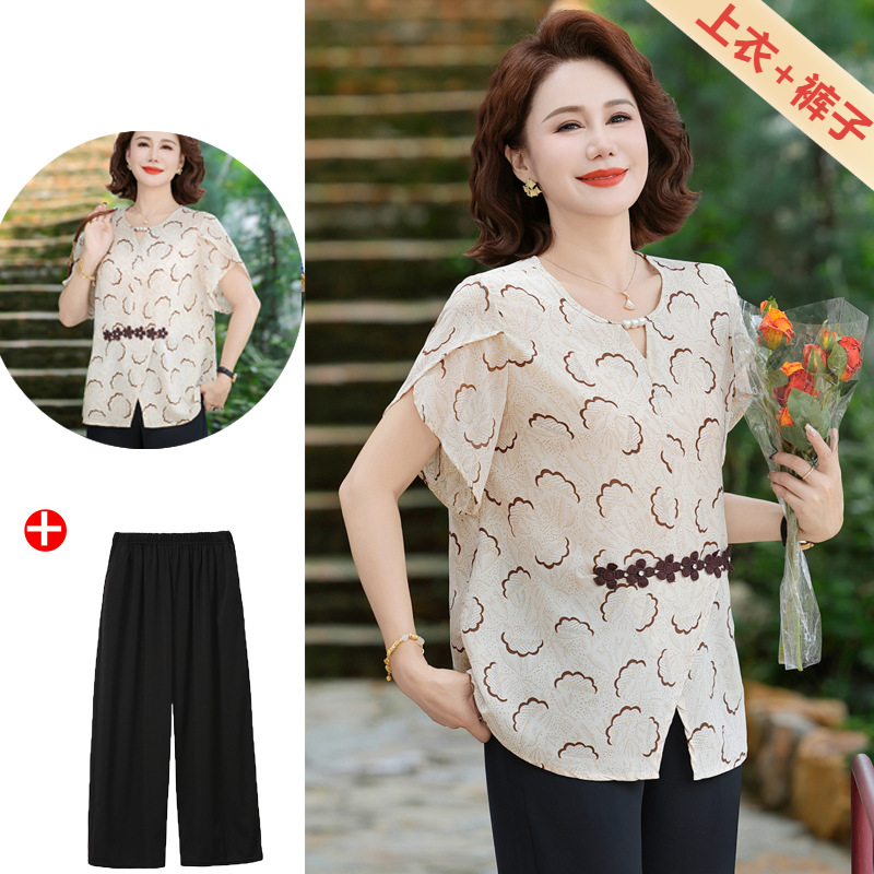 Элегантный комплект шифоновой блузки для мамы, новый летний комплект из двух предметов для женщин среднего возраста, свободный стильный комплект с узором облаков.