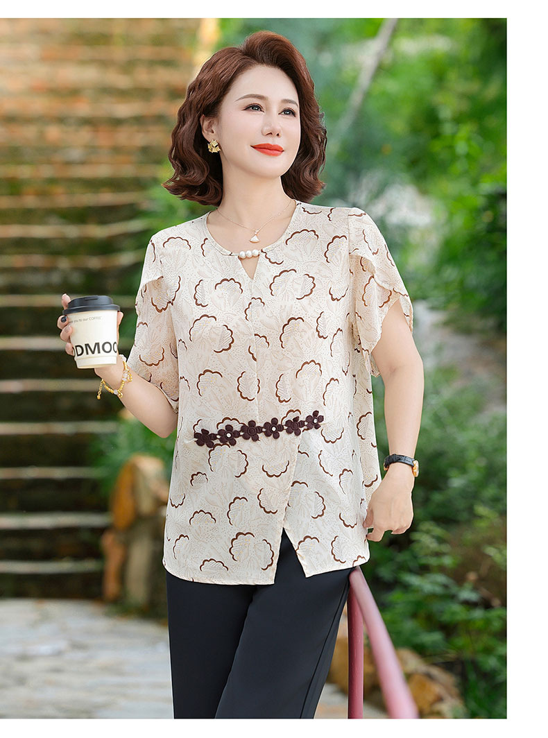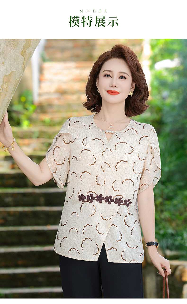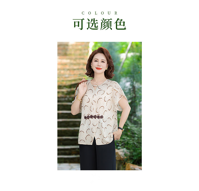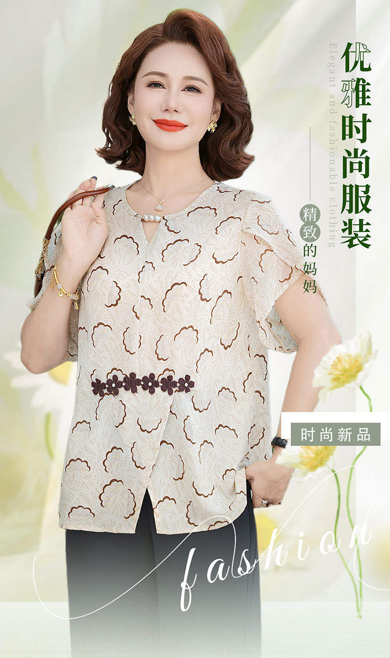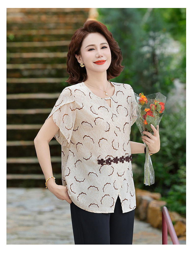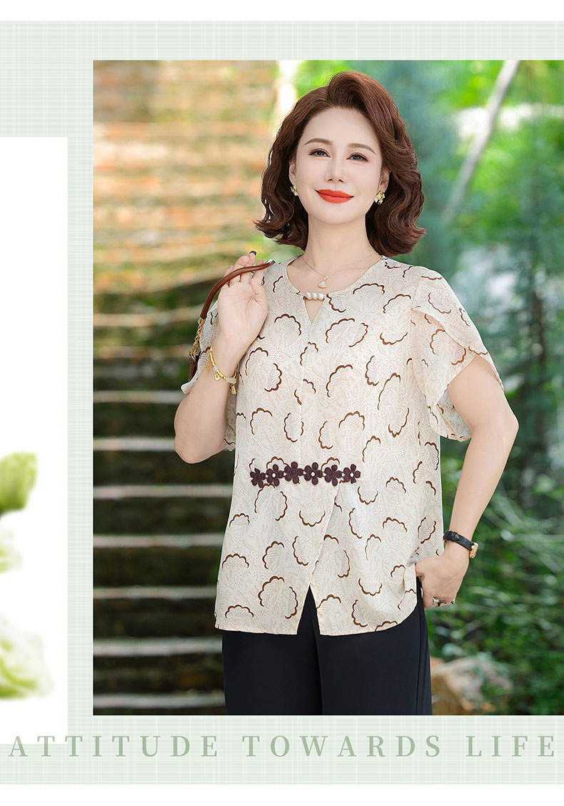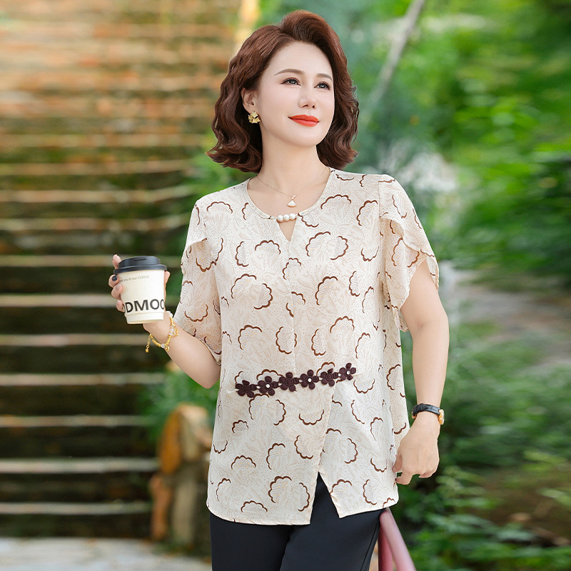 Элегантный комплект шифоновой блузки для мамы, новый летний комплект из двух предметов для женщин среднего возраста, свободный стильный комплект с узором облаков.