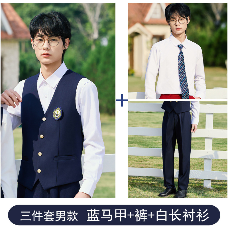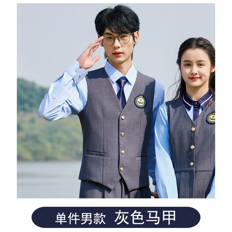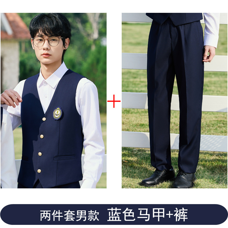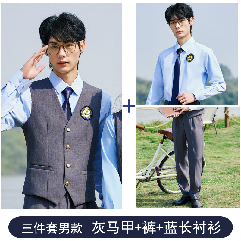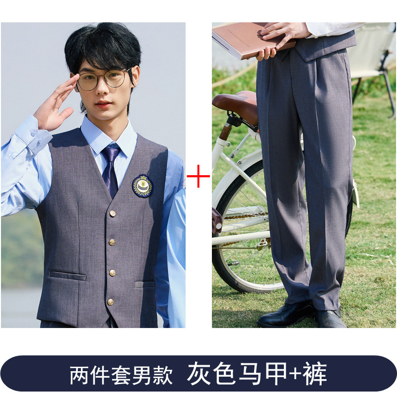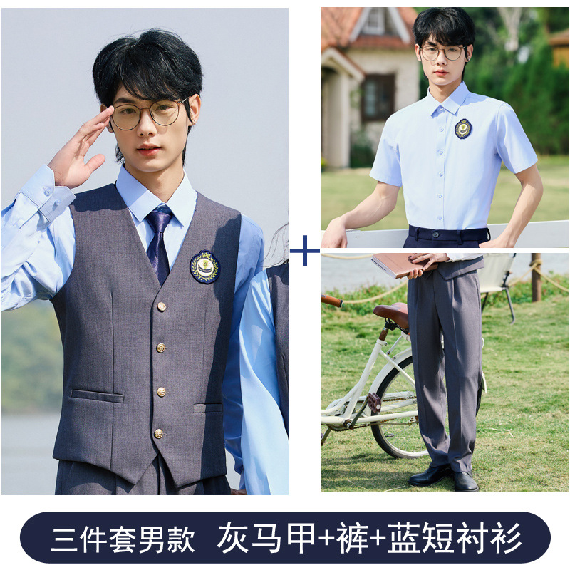 Мужской серый жилет; Мужские серые брюки; Мужской синий жилет; Мужские синие брюки; Женское серое платье; Женское синее платье; Мужской серый жилет + брюки; Мужской синий жилет + брюки; Женское серое платье + синяя короткая рубашка; Женское серое платье + синяя длинная рубашка; Женское синее платье + белая короткая рубашка; Женское синее платье + белая длинная рубашка; Мужской серый жилет + брюки + синяя короткая рубашка; Мужской серый жилет + брюки + синяя длинная рубашка; Мужской синий жилет + брюки + белая длинная рубашка