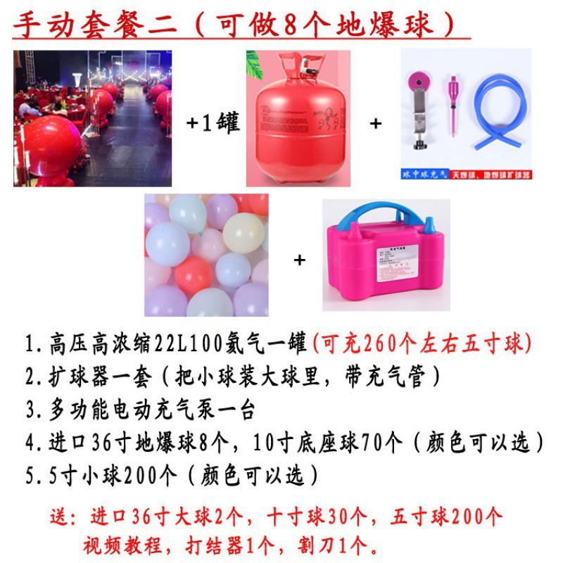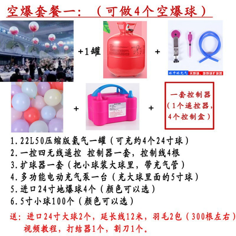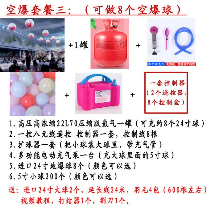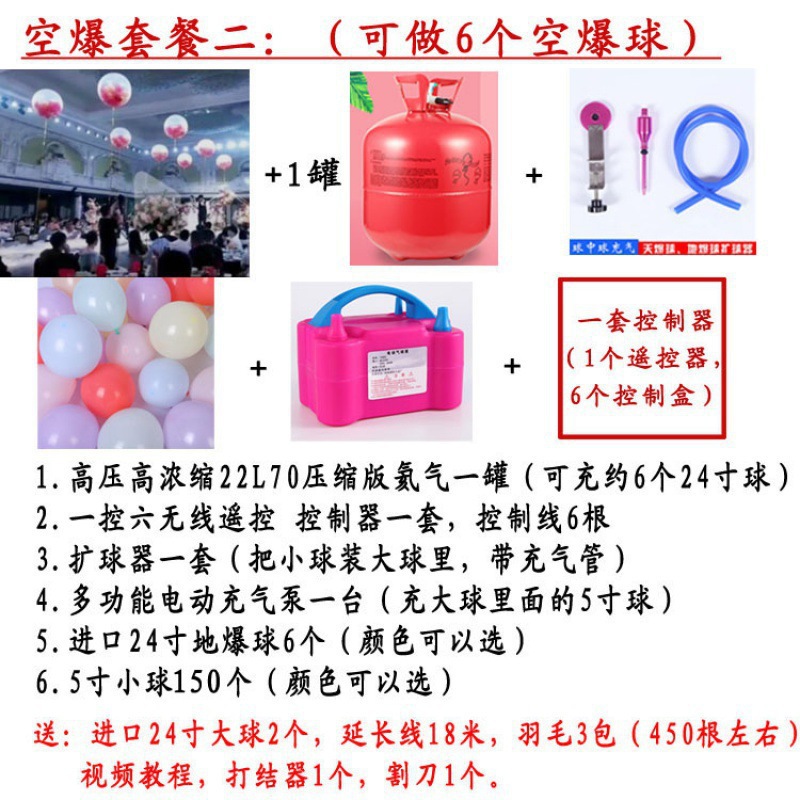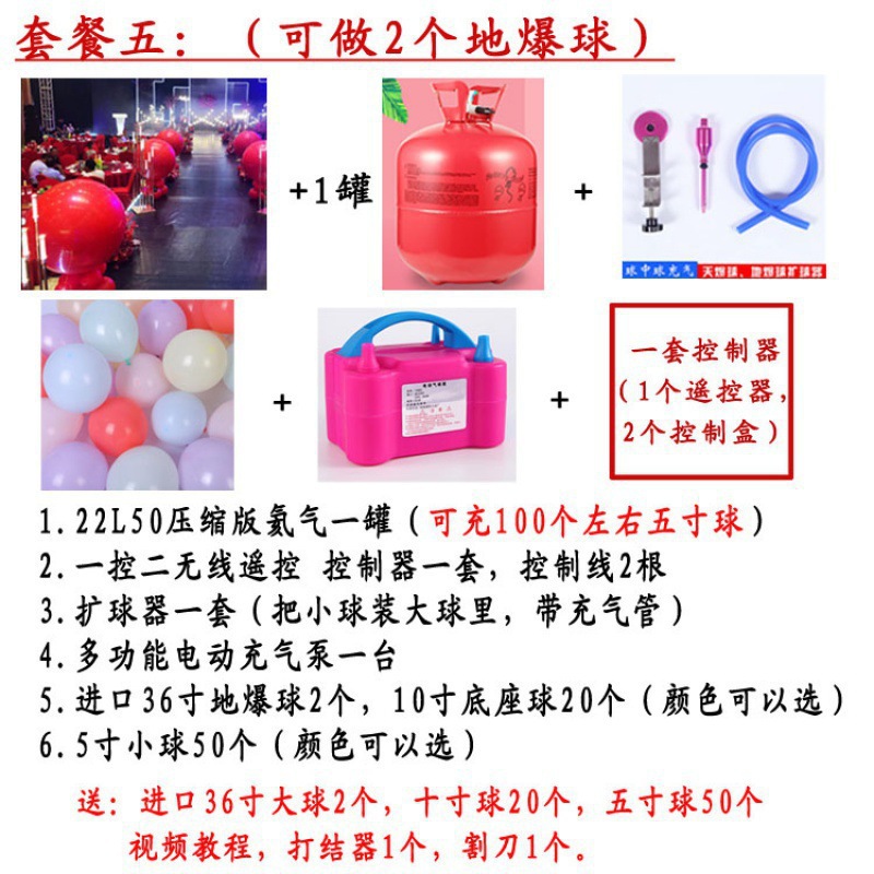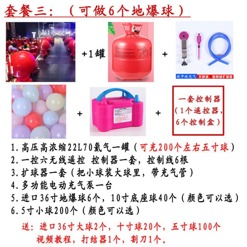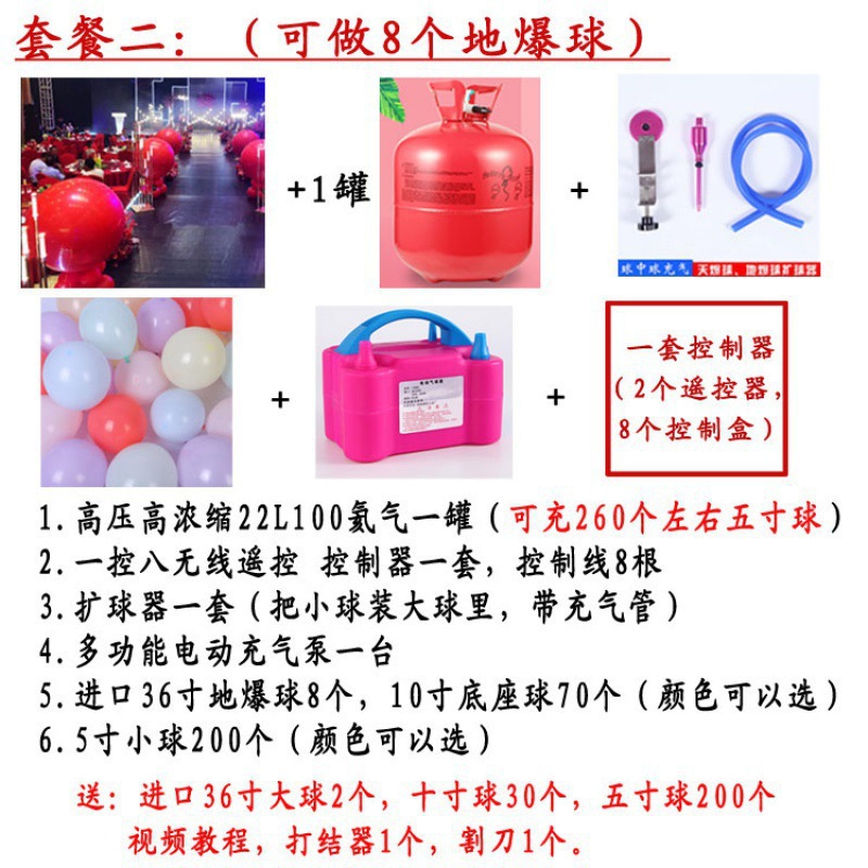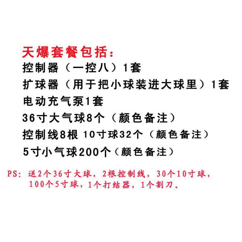 36inch Один большой мяч; Пакет дистанционного управления 2 [8 взрывных шаров]; Пакет дистанционного управления 3 [6 взрывных шаров]; Пакет дистанционного управления 4 [4 снаряда для взрыва на земле]; Пакет дистанционного управления 5 [2 взрывных шара на земле]; Небесный набор блюд; Один управляет восемью; 10 линий управления; Helium L70 (можно заполнить около 200 маленьких шариков); Helium L100 (можно заполнить около 280 маленьких шариков); 5inch маленьких шарика, по 200 штук в упаковке.; 10inch маленьких шарика в упаковке по 100 штук.; плоскогубцы для завязывания узлов; электрический воздушный насос; шаровой расширитель; перо; Удлинитель 10m; Ручной пакет 2 [8 взрывных шаров]; Ручной пакет 3 [6 взрывных шаров]; Ручной пакет 4 [4 шарика с землей]; Пакет «Взрыв воздуха» 1 [4 шара взрыва воздуха]; Пакет «Взрыв воздуха» 2 [6 шаров взрыва воздуха]; Пакет «Взрыв воздуха» 3 [8 шариков взрыва воздуха]