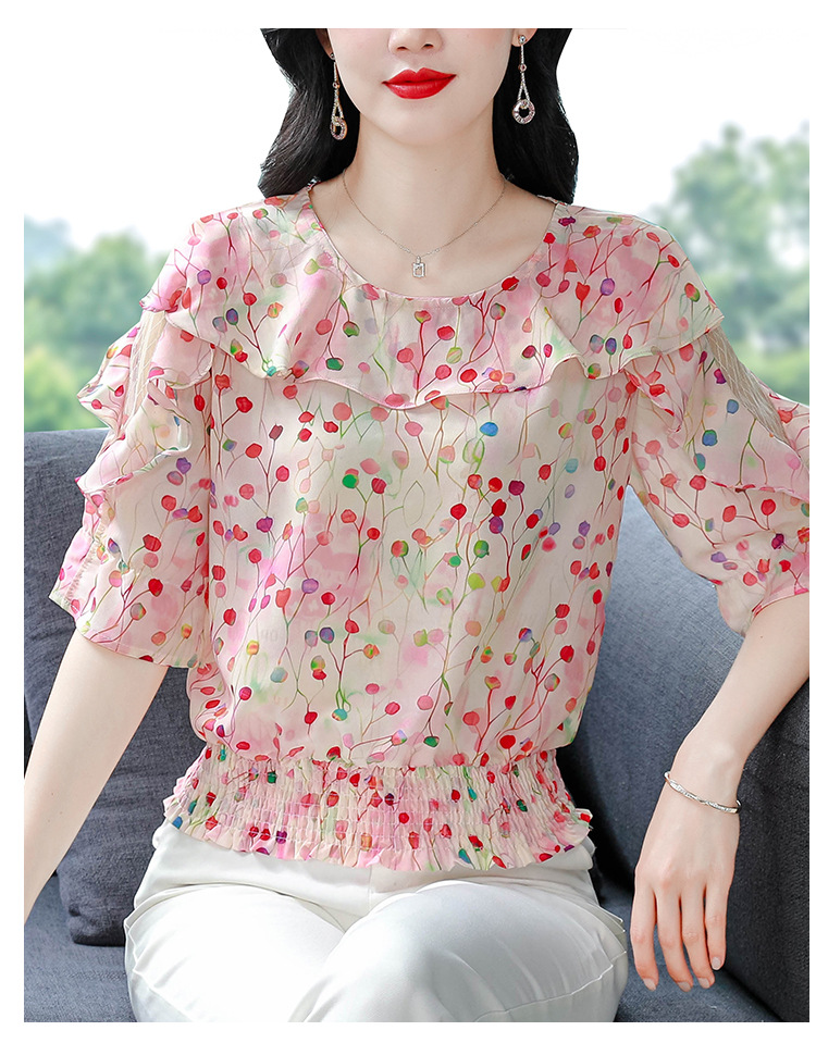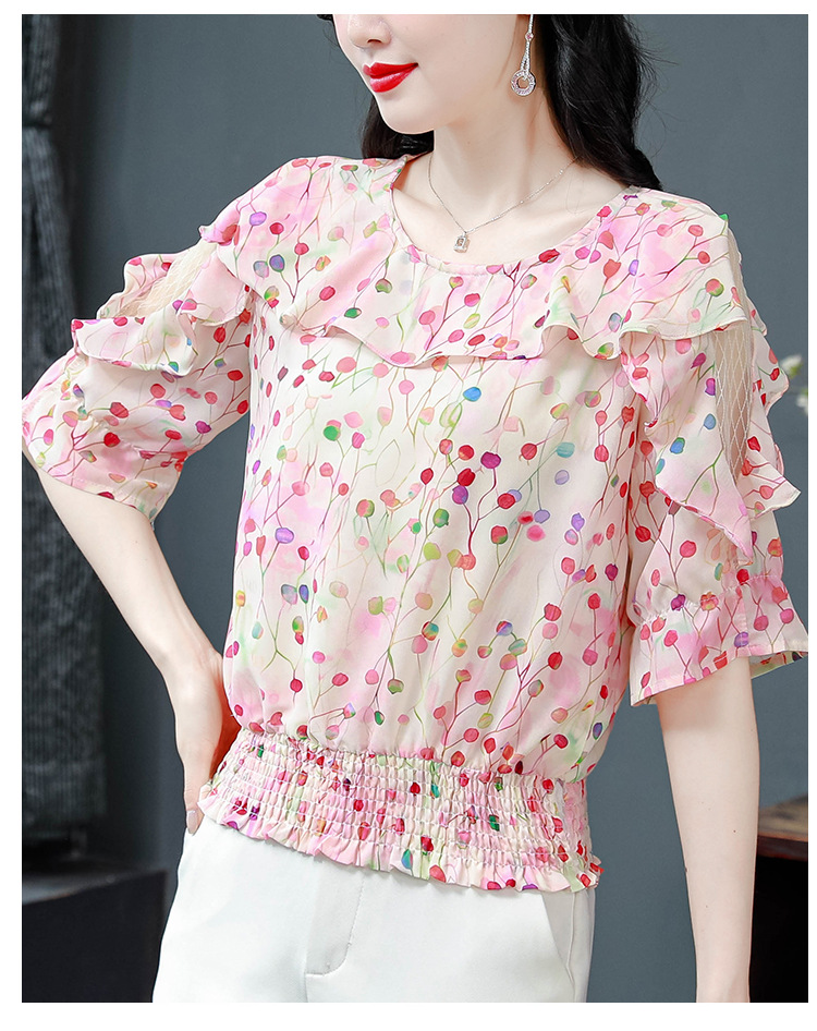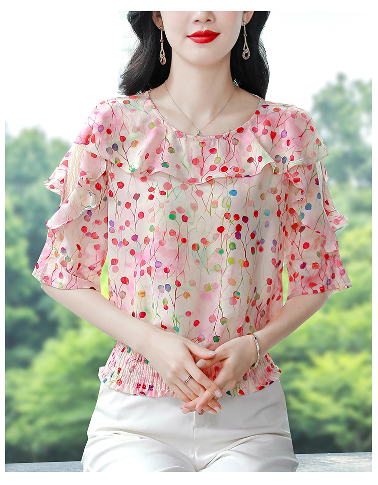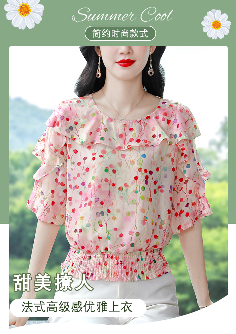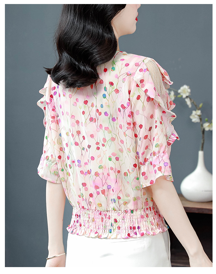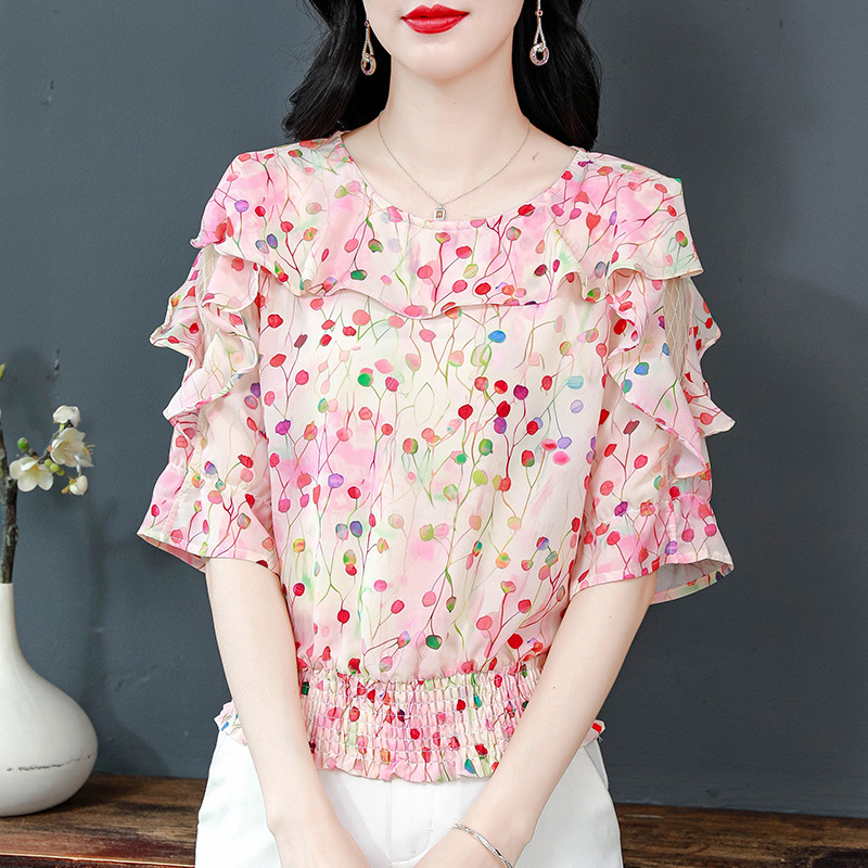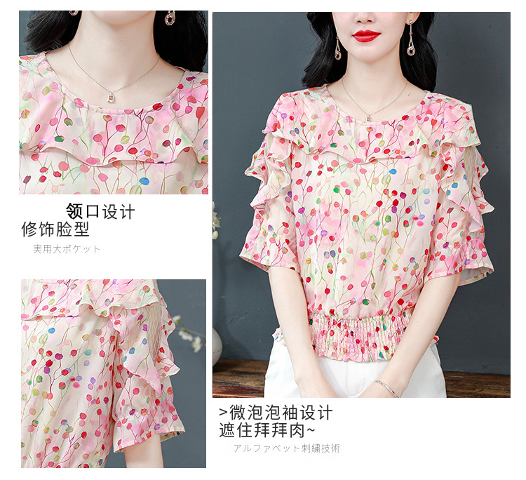 Шифоновая рубашка со средними рукавами и цветочным принтом для женщин, новый летний стиль, красивая рубашка, уменьшающая возраст, элитный короткий топ в западном стиле.